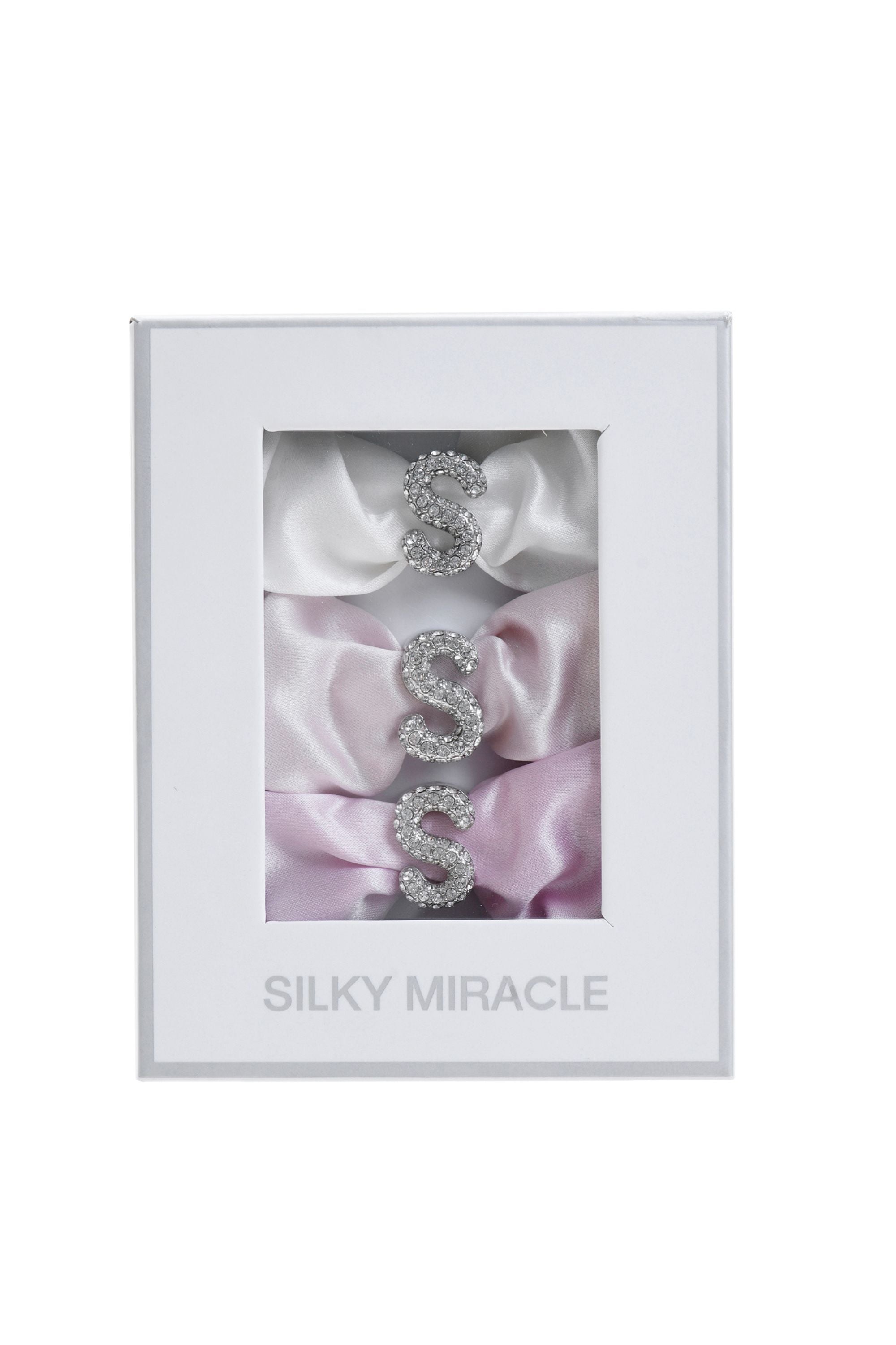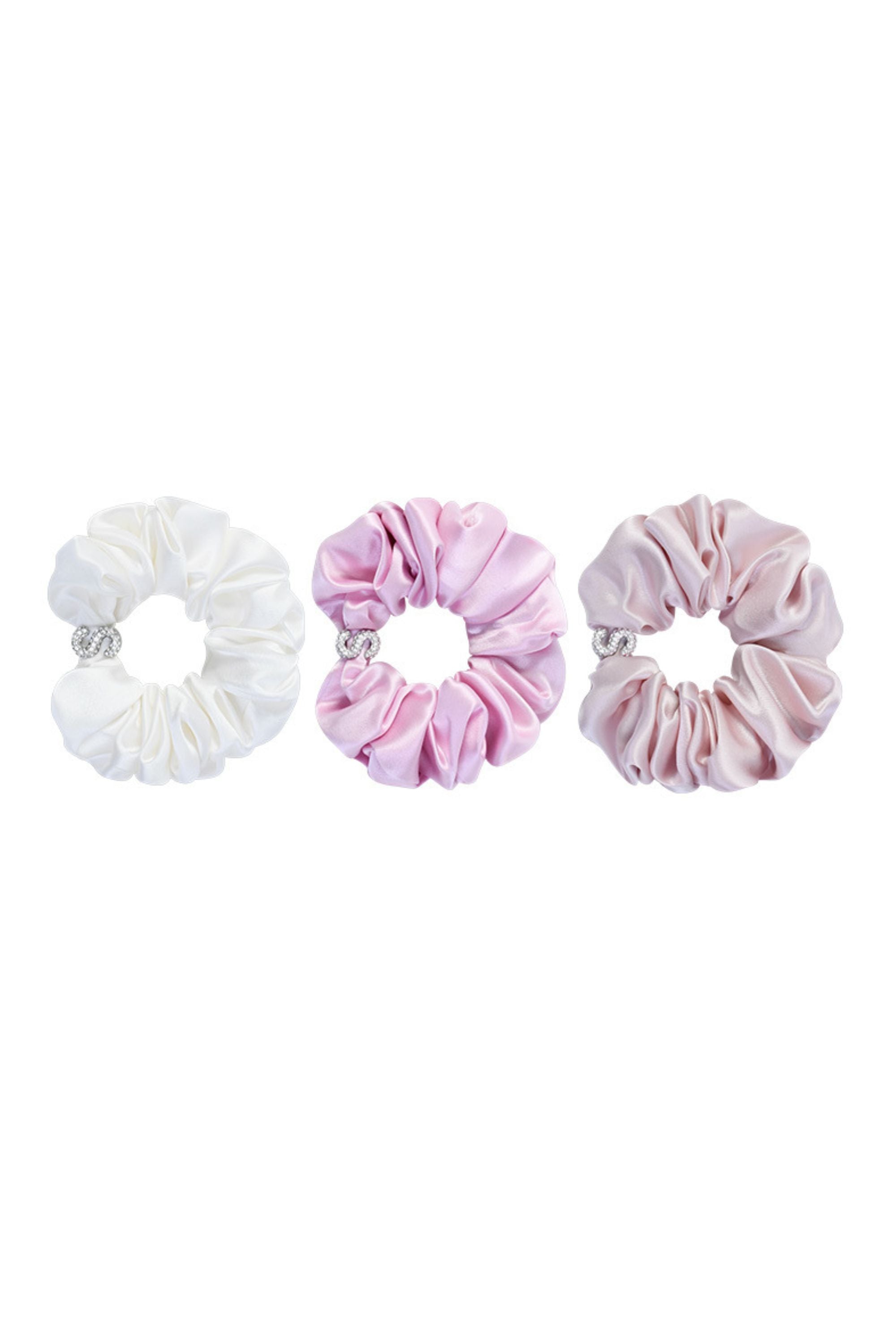 A set of three scrunchies including one each of pearl white, cherry blossom pink, and white strawberry pink. These scrunchies are cut from high-quality silk and detailed with a Swarovski crystal on the side.
