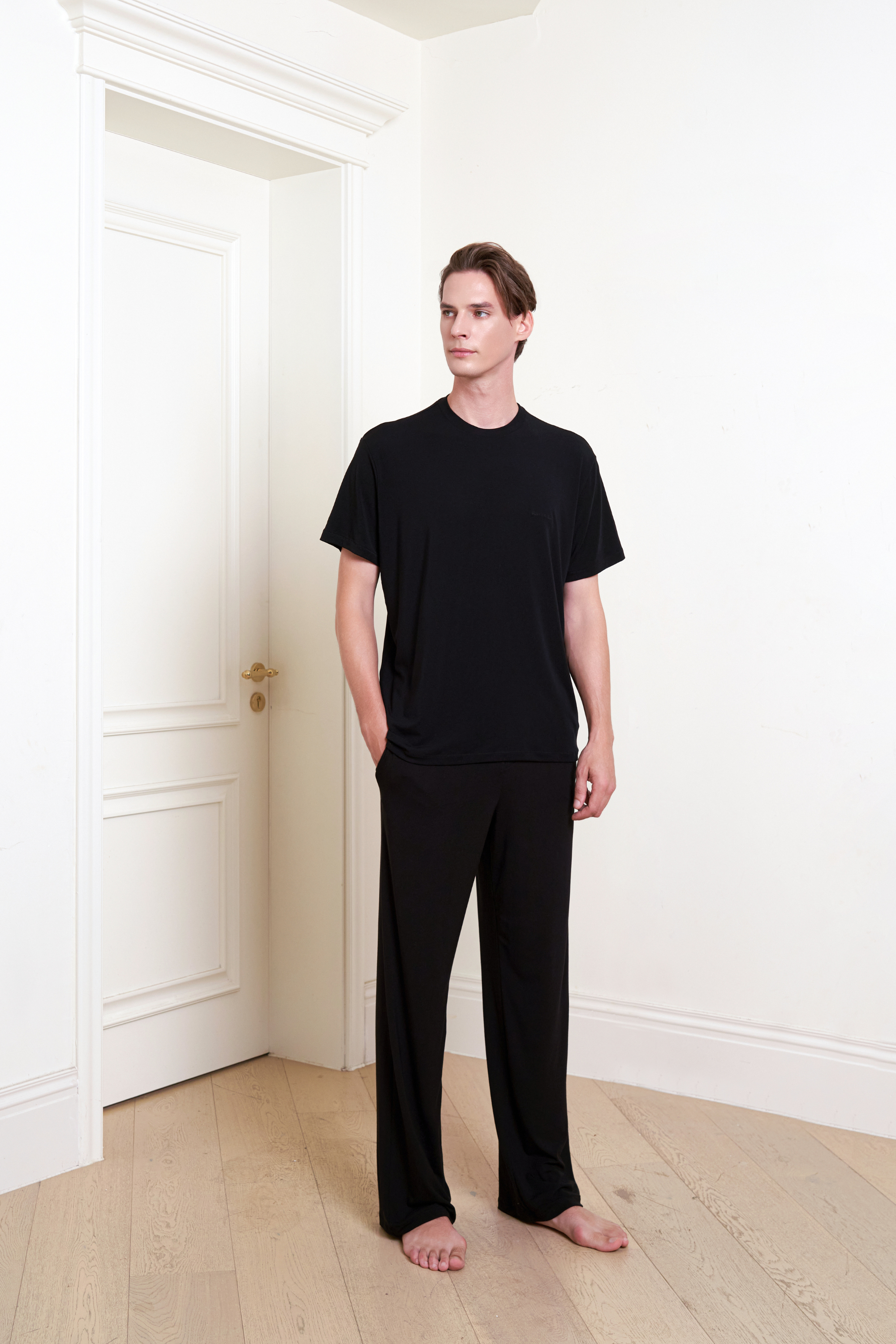 Tailored from a blend of mulberry silk and modal silk knit fabrics, the Basic Long Black Pyjama Trousers is a custom-designed attire that offers a soft, comfortable, and stretchy feel. These trousers can be paired seamlessly with tops from the corresponding collection.