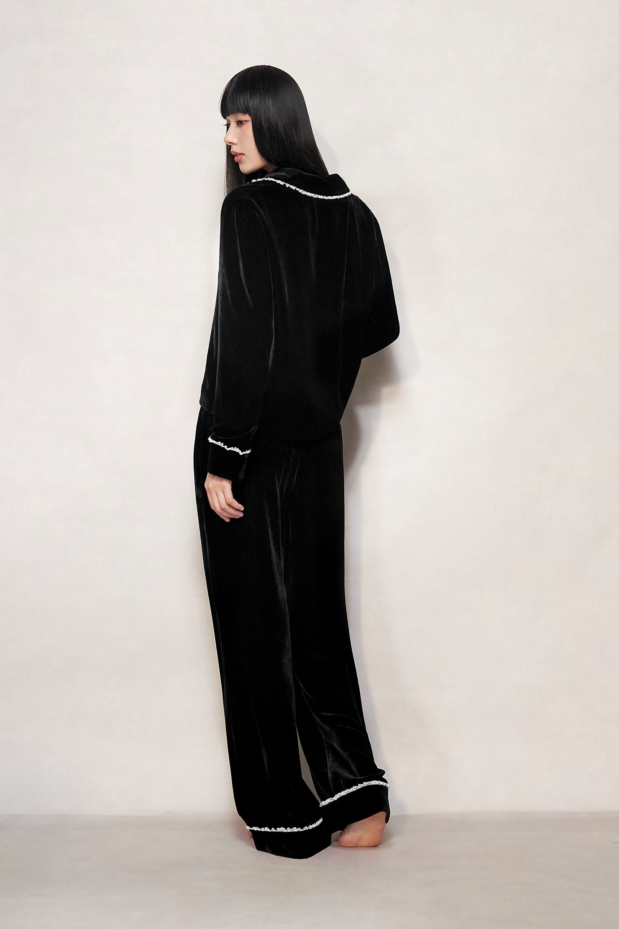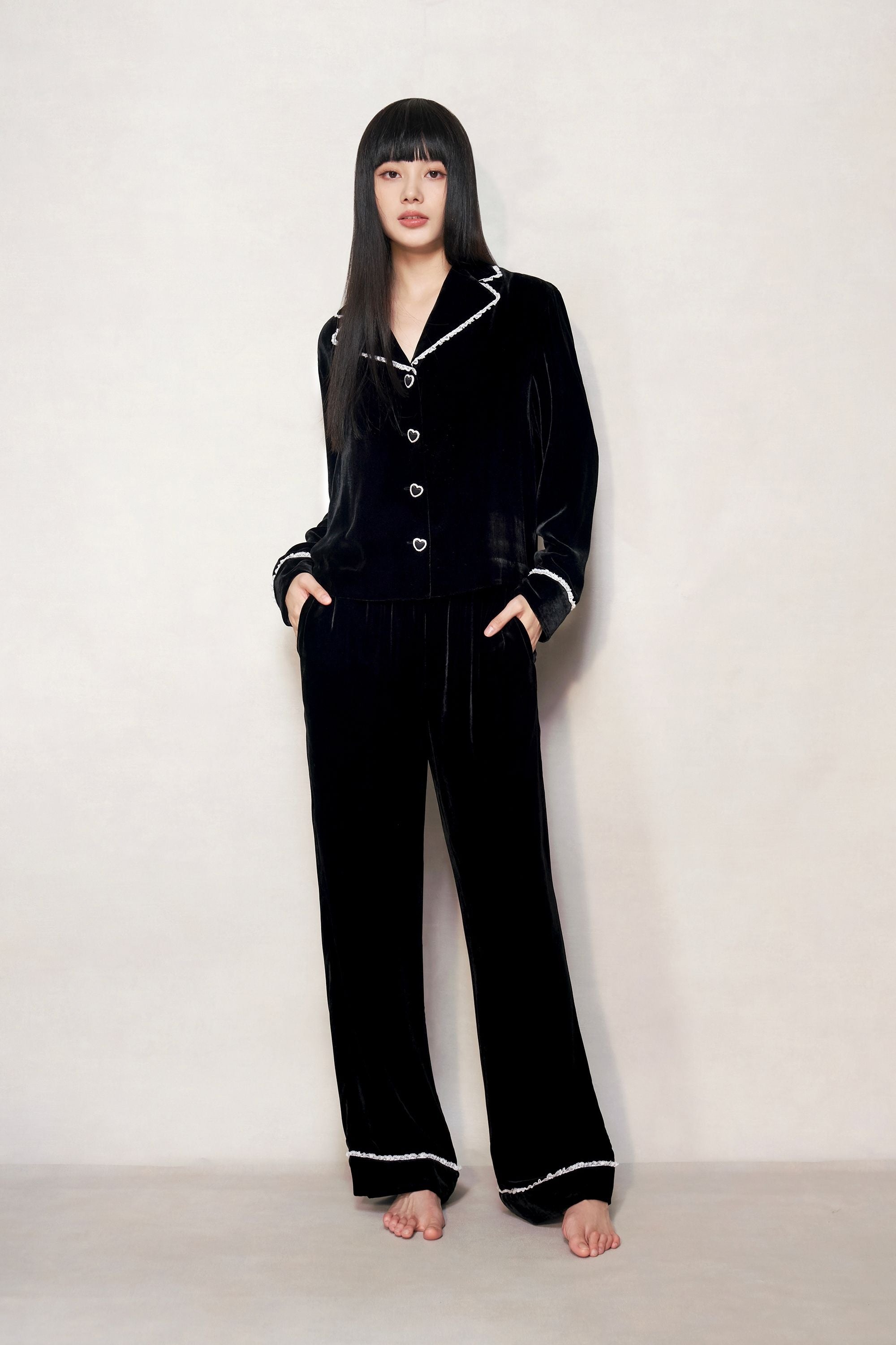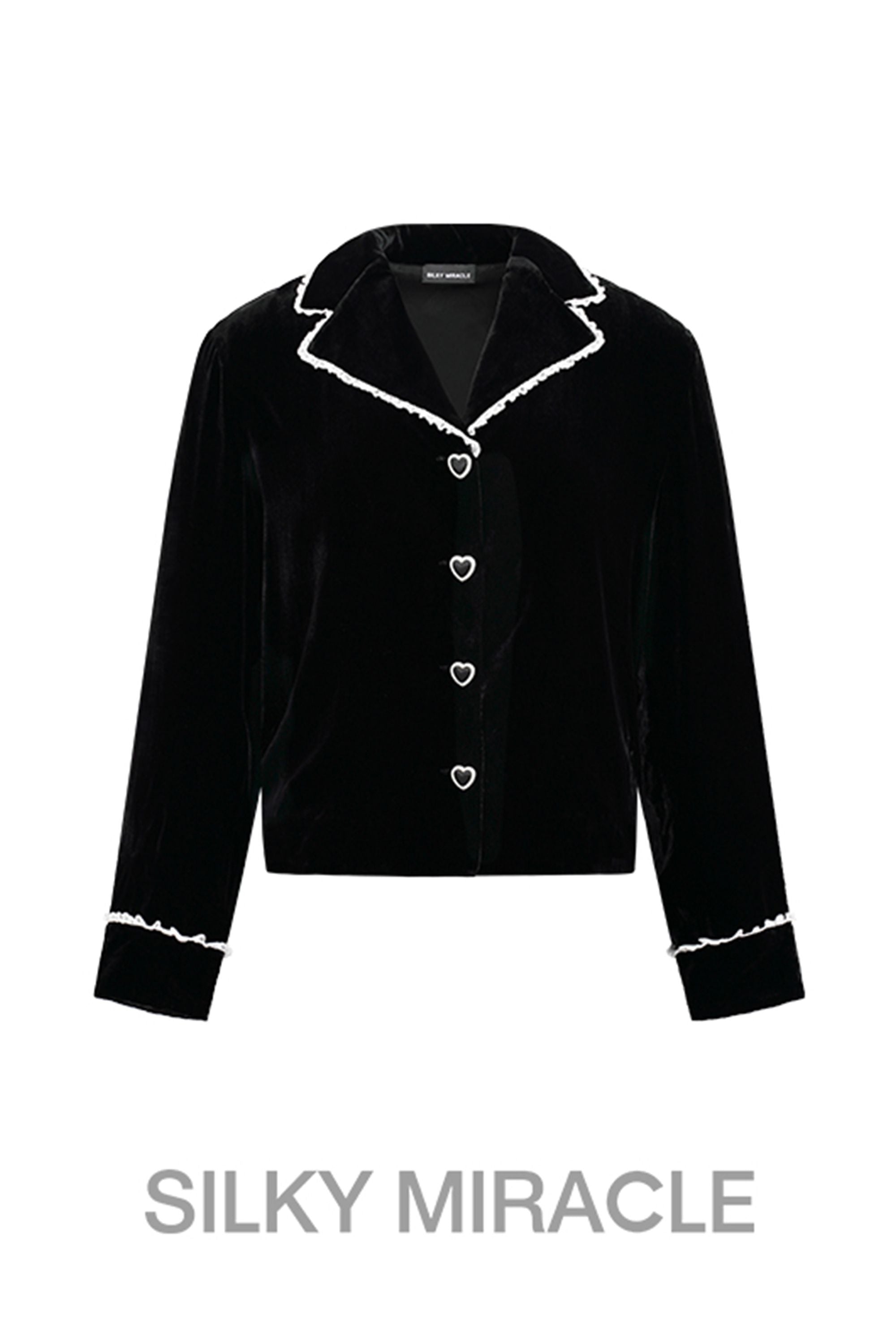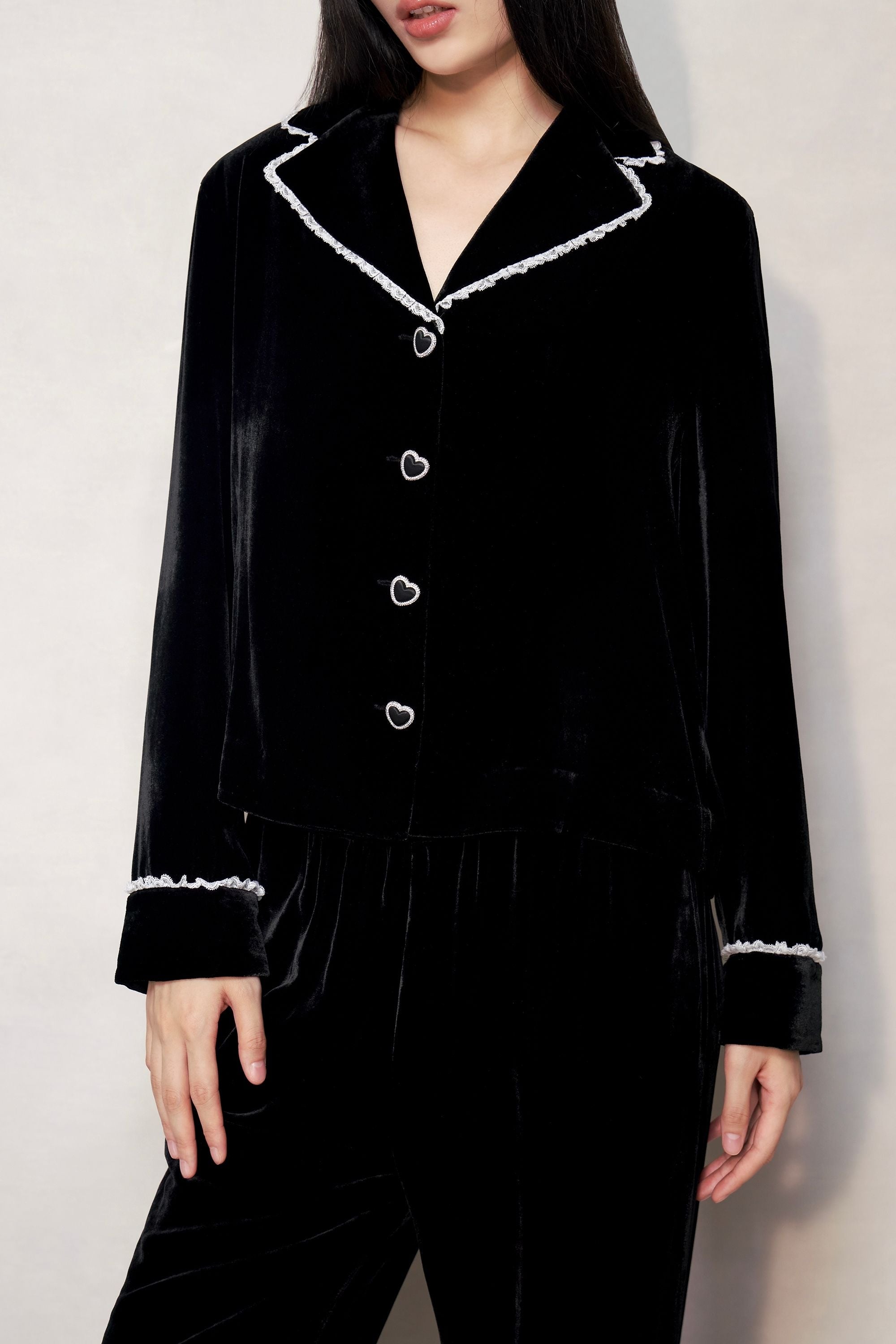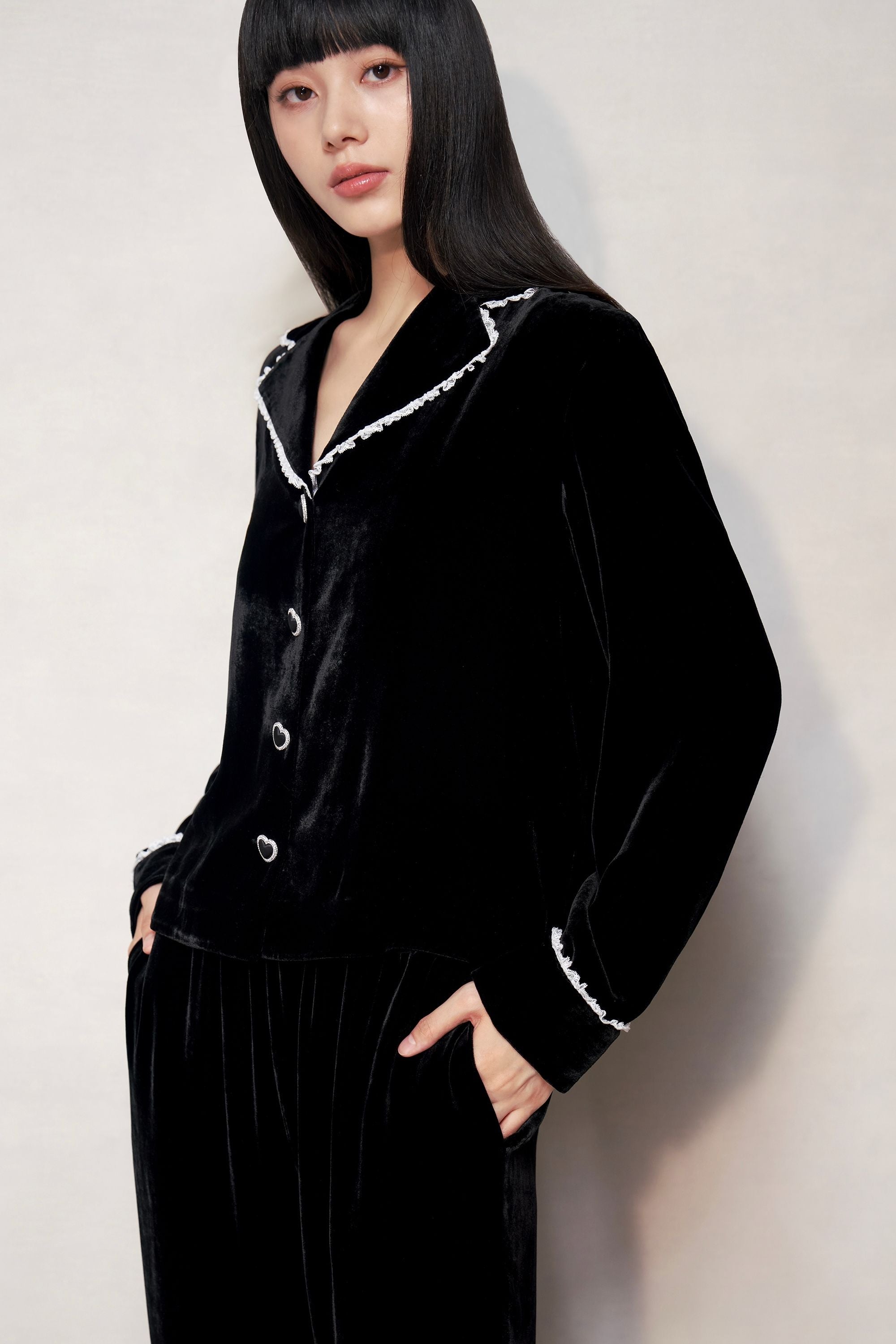 Elevate your wardrobe with our black velvet vintage high-grade attire, enriched with exquisite Mulberry lace embellishments. To enhance its girly charm, we've adorned it with silk buttons featuring diamonds and love hearts. For a modern take on classic style, consider pairing it with lace and mullion velvet trousers, adding a contemporary twist to your ensemble.Fabric A:82% Viscose 18% Mulberry Silk