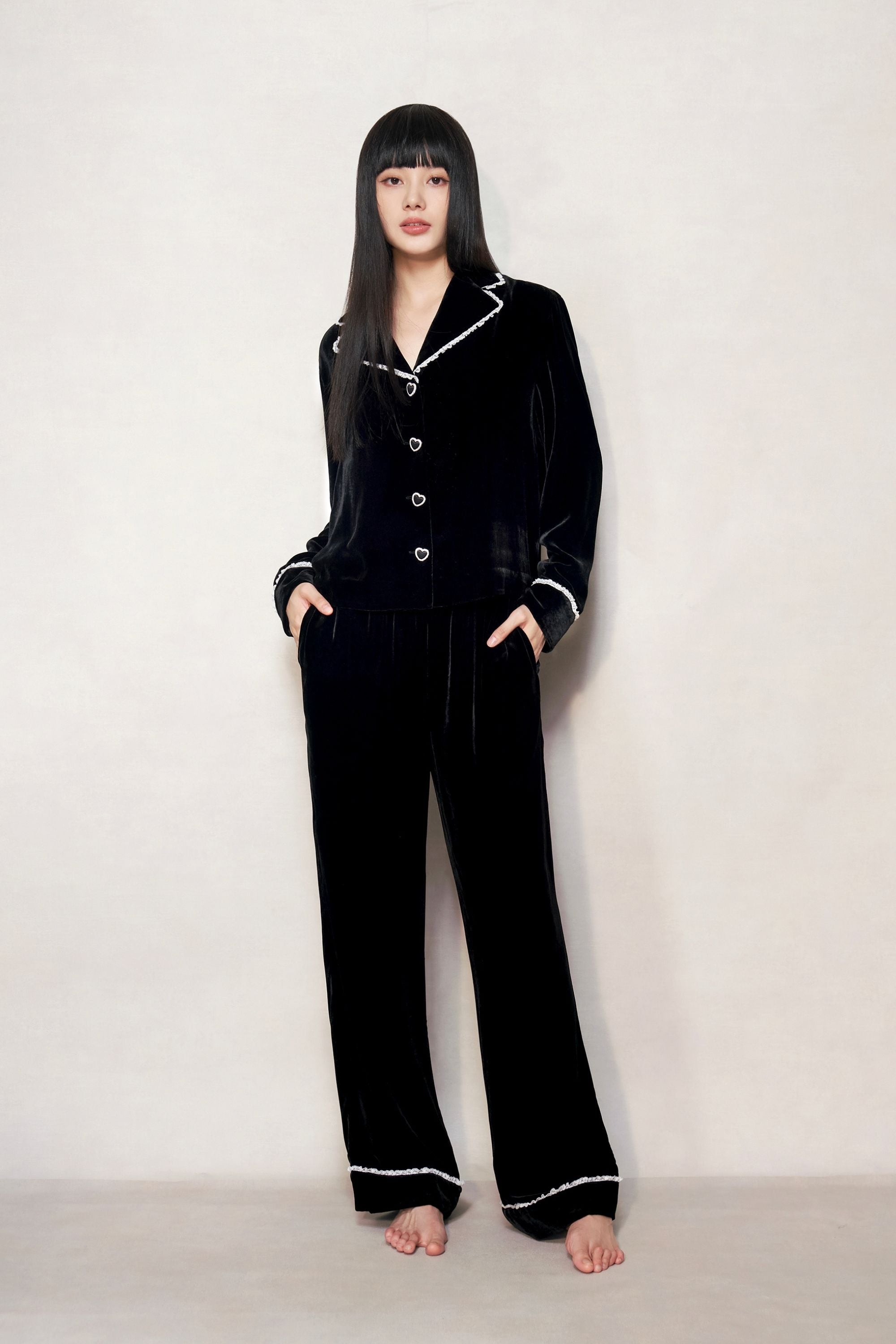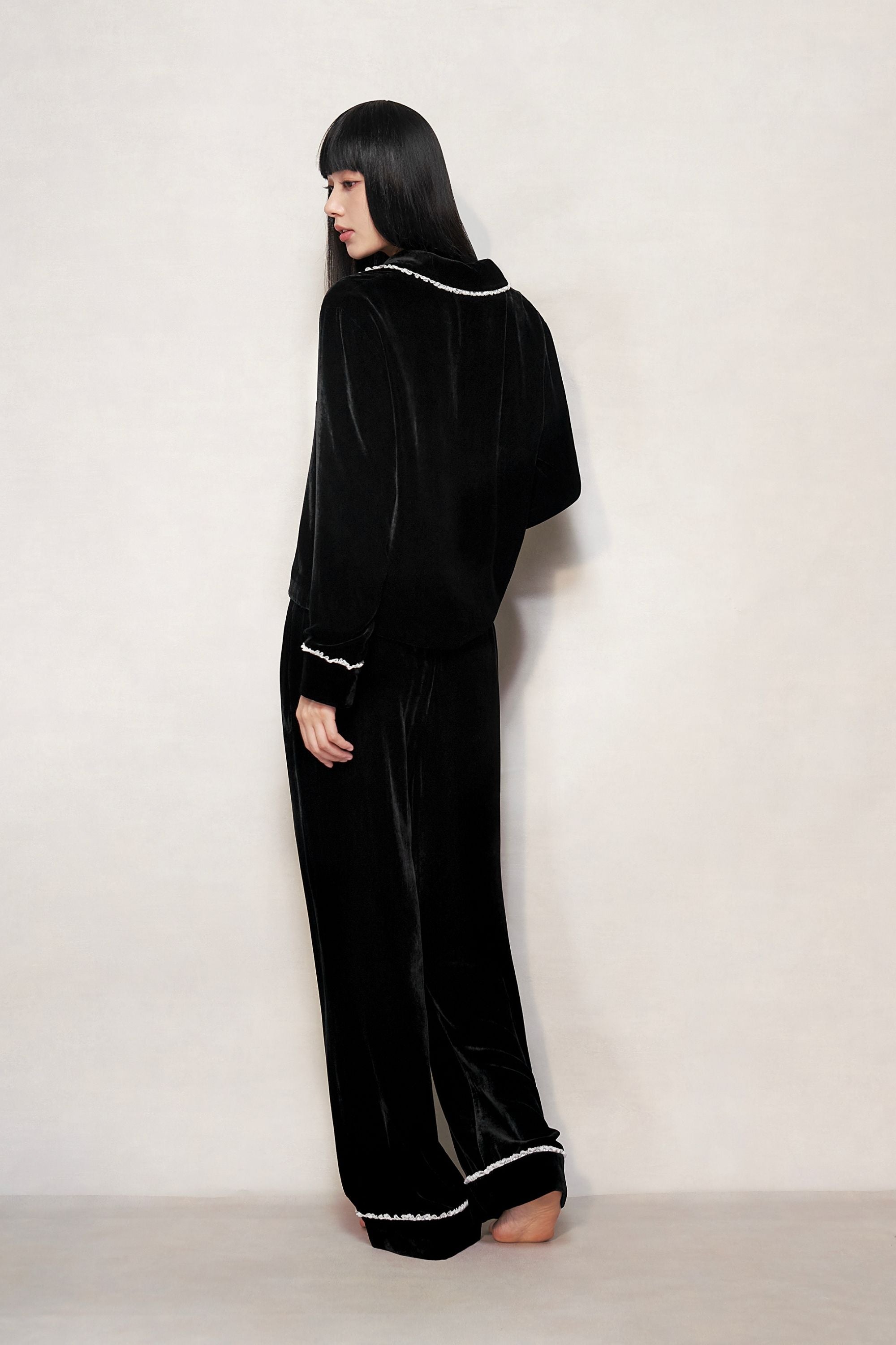 Crafted from 100% Italian silk velvet, this fabric exudes softness and delicacy. The pearl white silk lapel design imparts a subtle and serene ambiance.