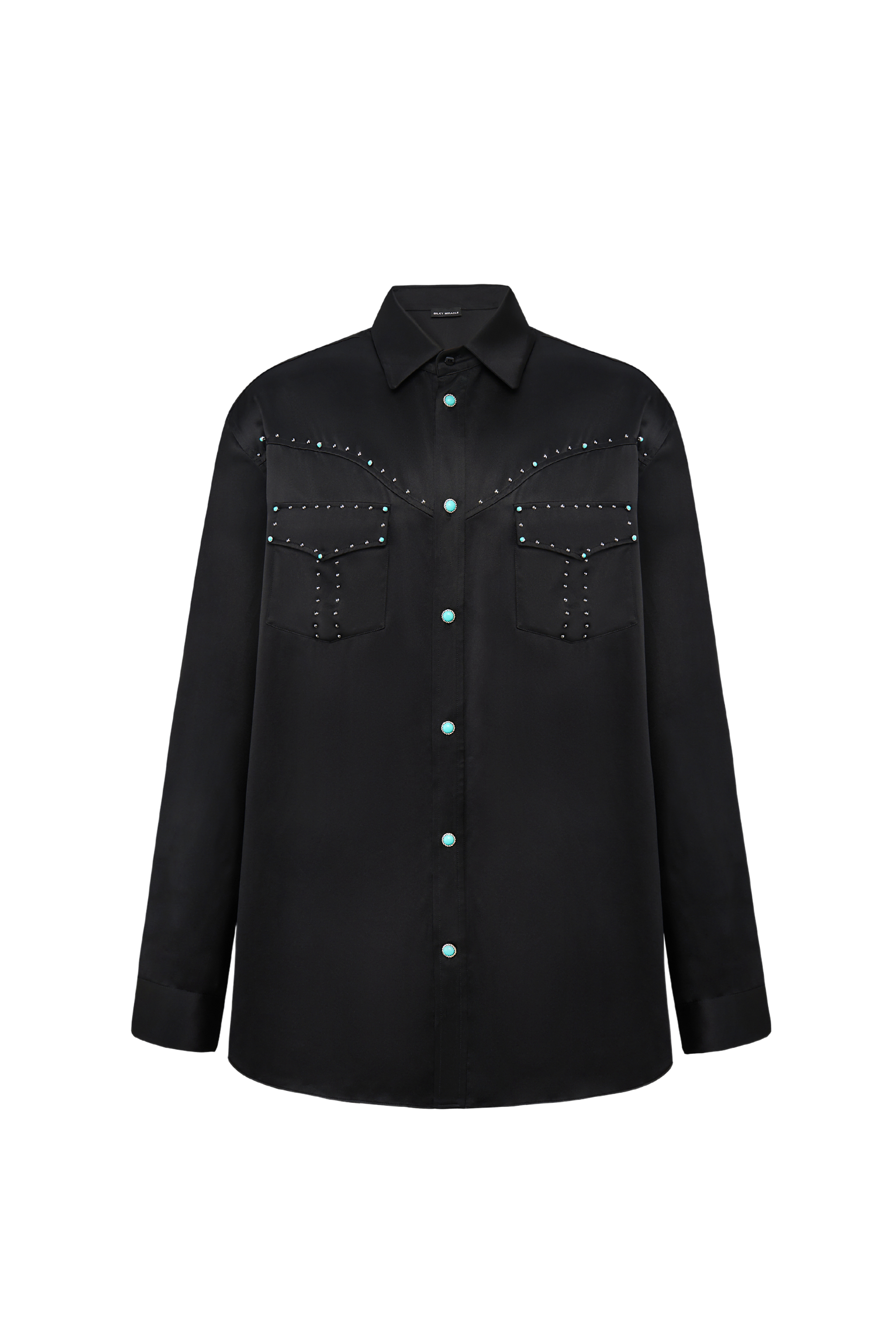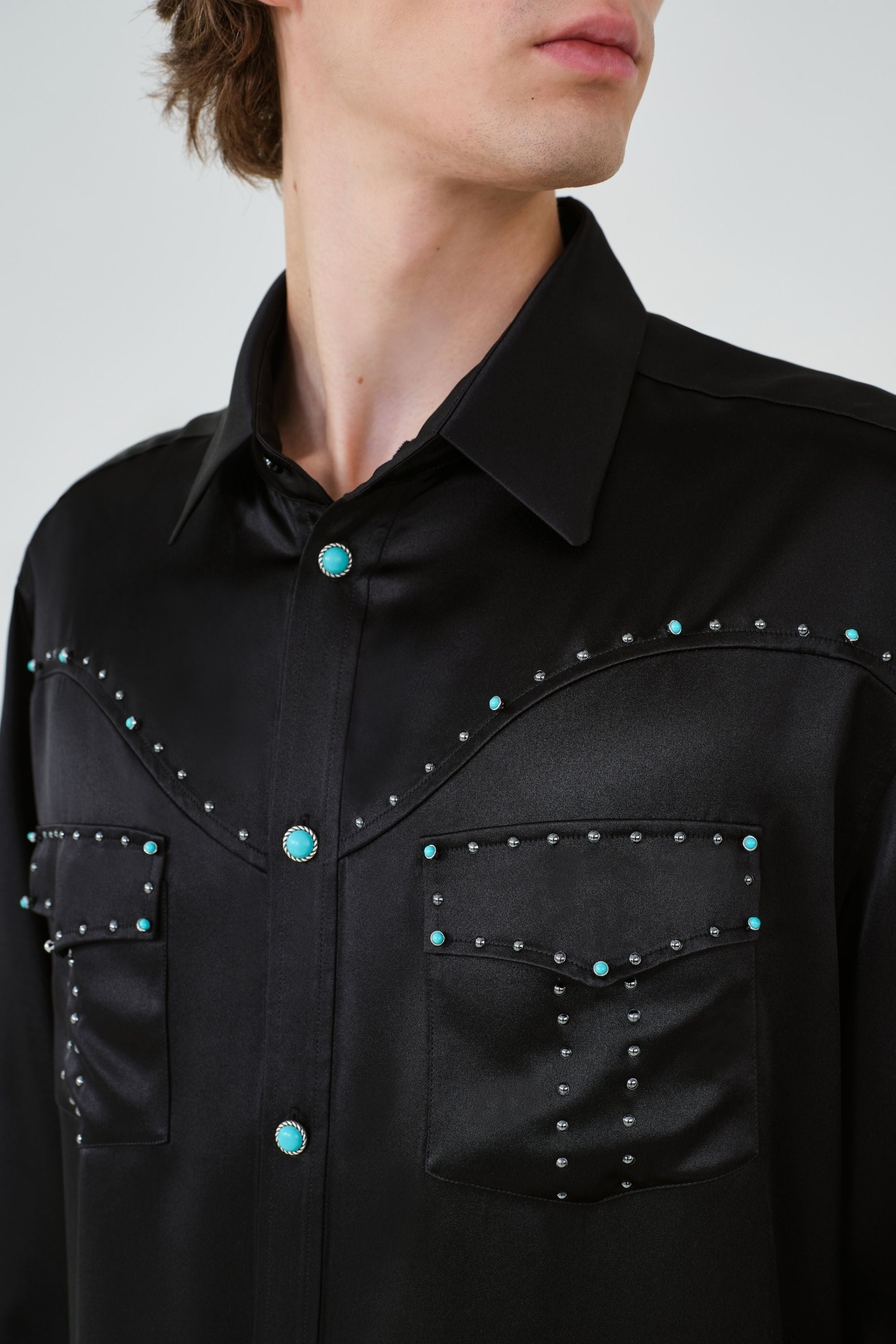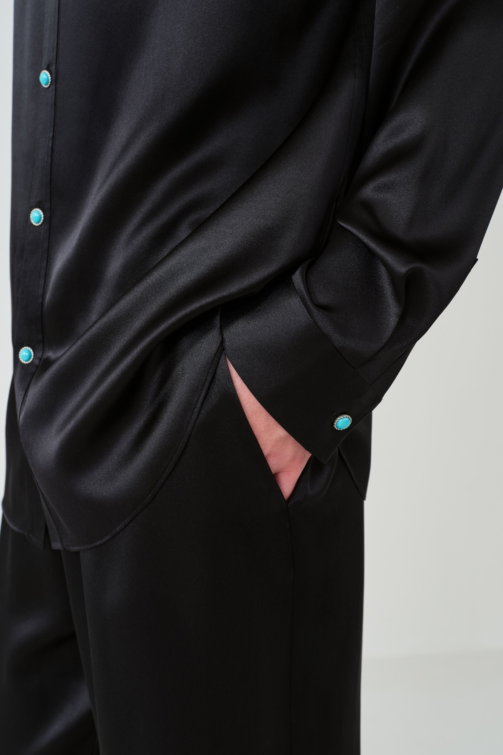 This classic men's shirt pajama features a cowboy-style curved chest division, with riveted lines and turquoise hand-stitched stone decorations on the front pockets. The turquoise buttons complement the design.