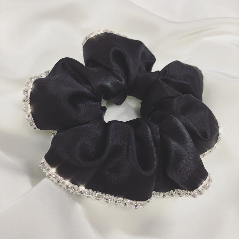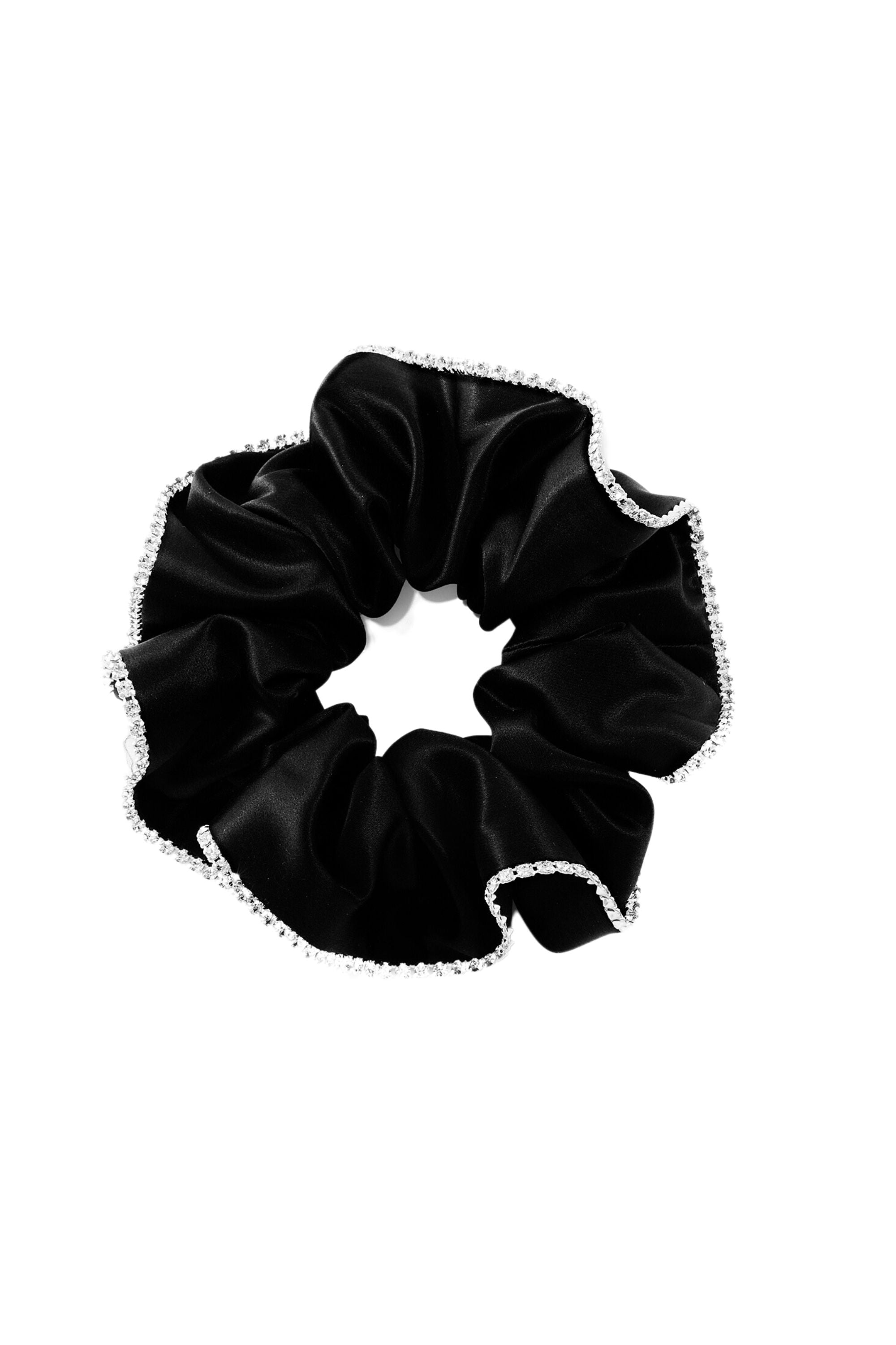 The Black Scrunchie is cut from a high shine Mulberry Silk and detailed with a Swarovski crystal trim.