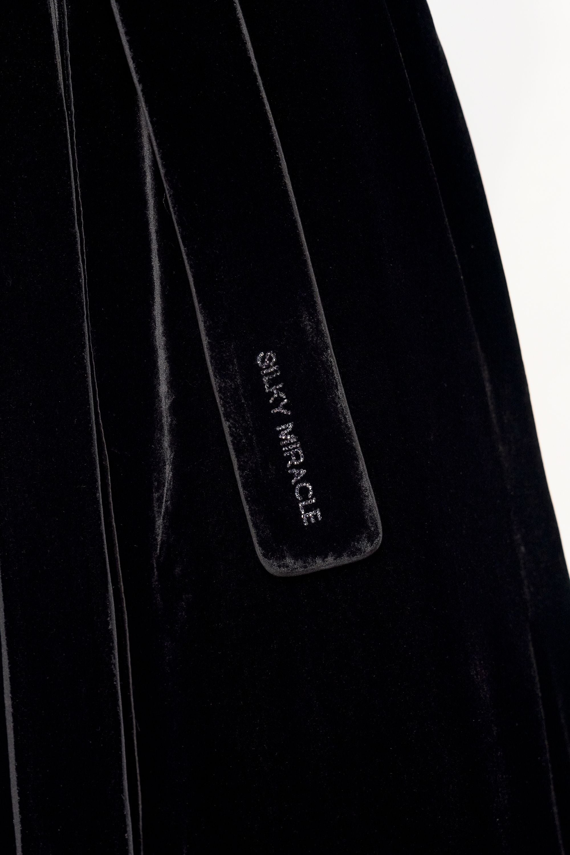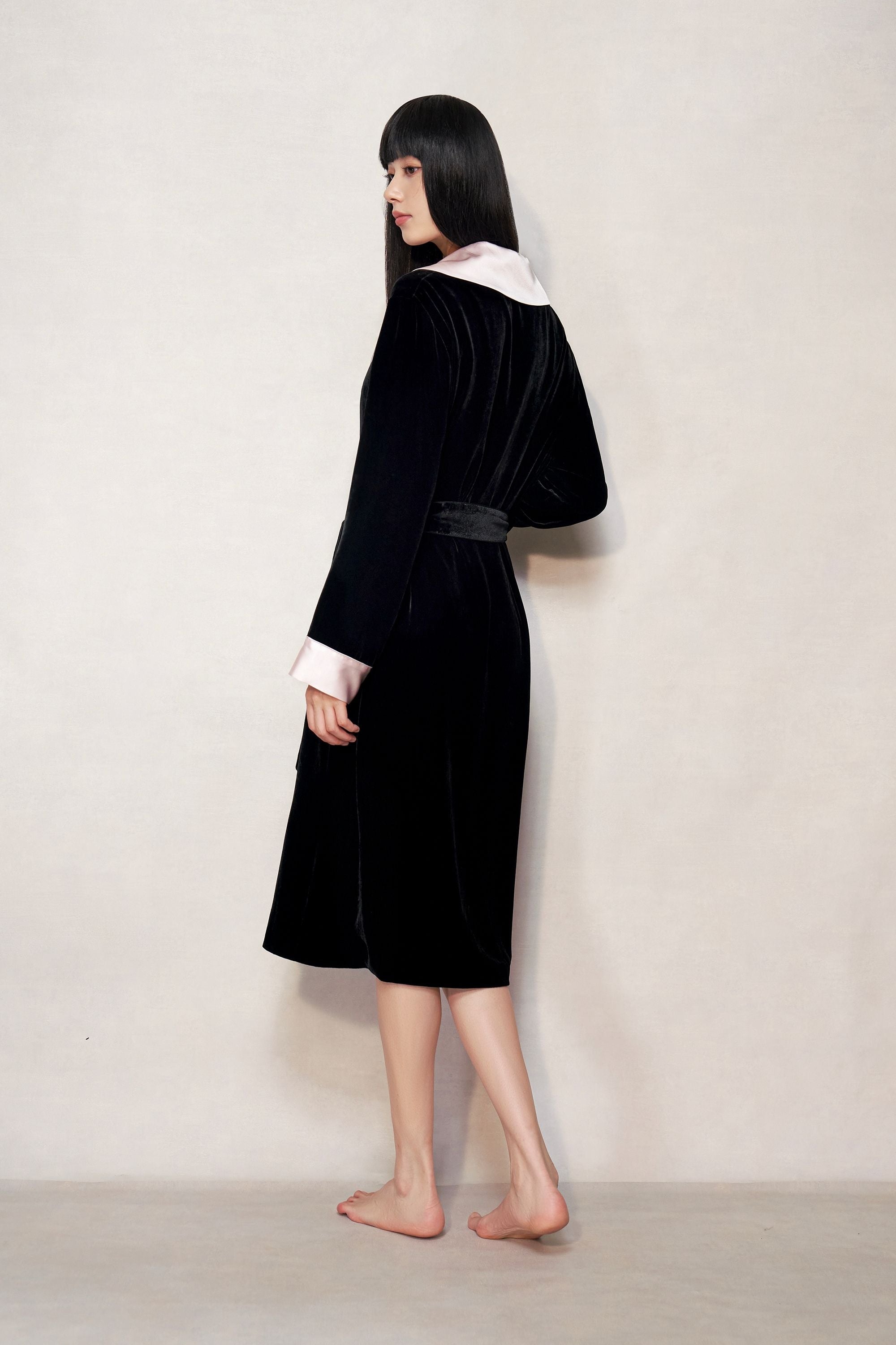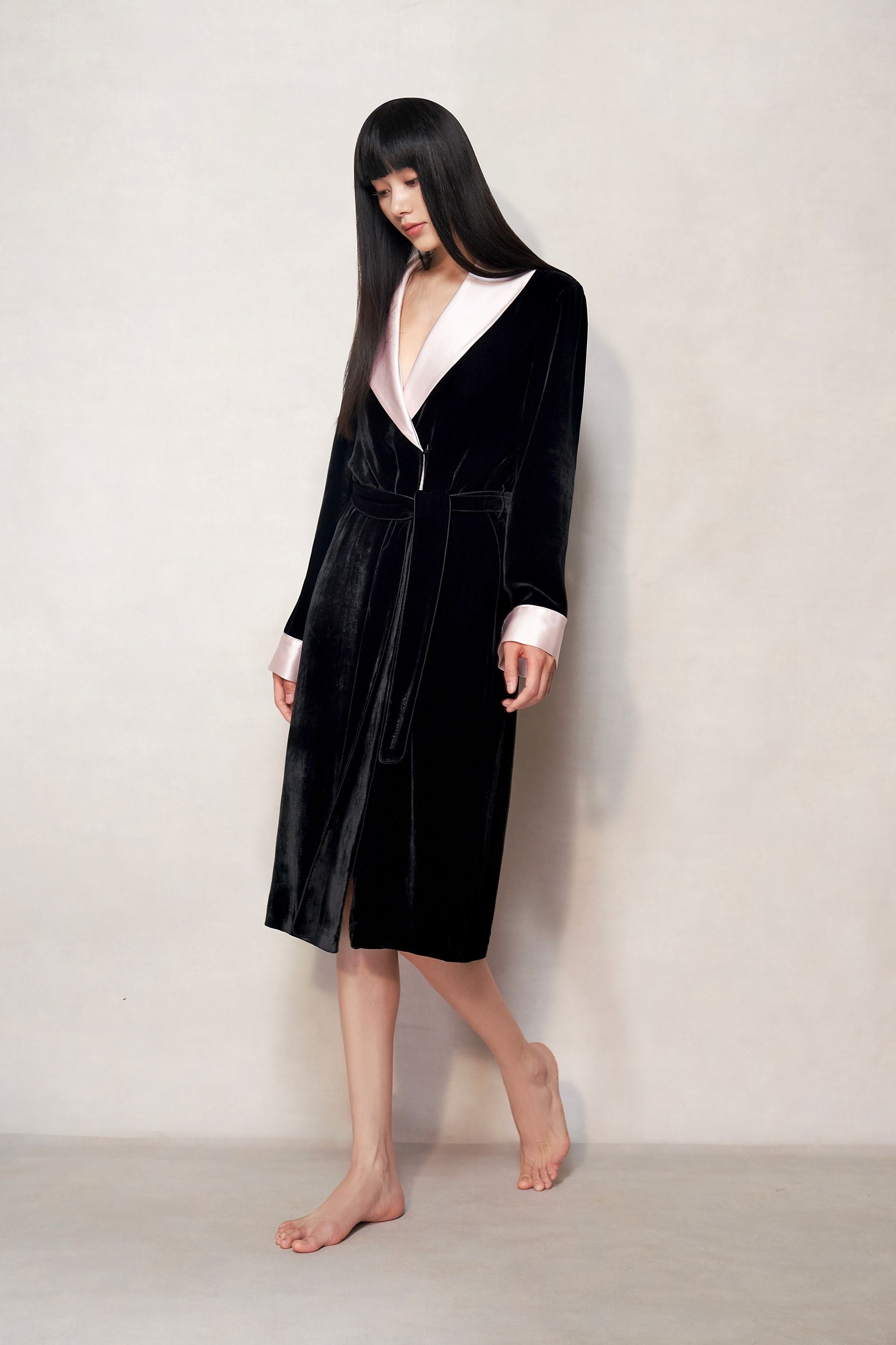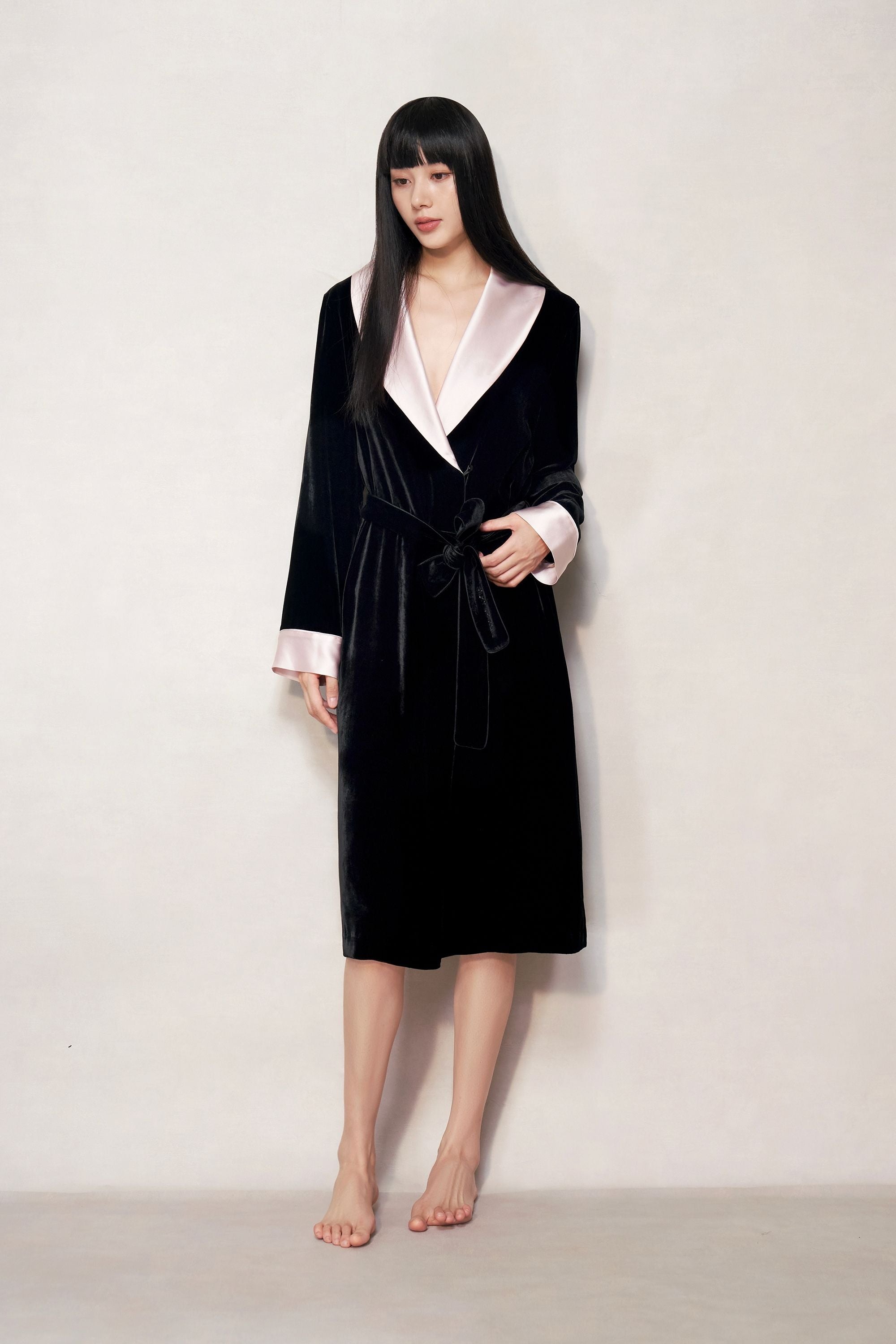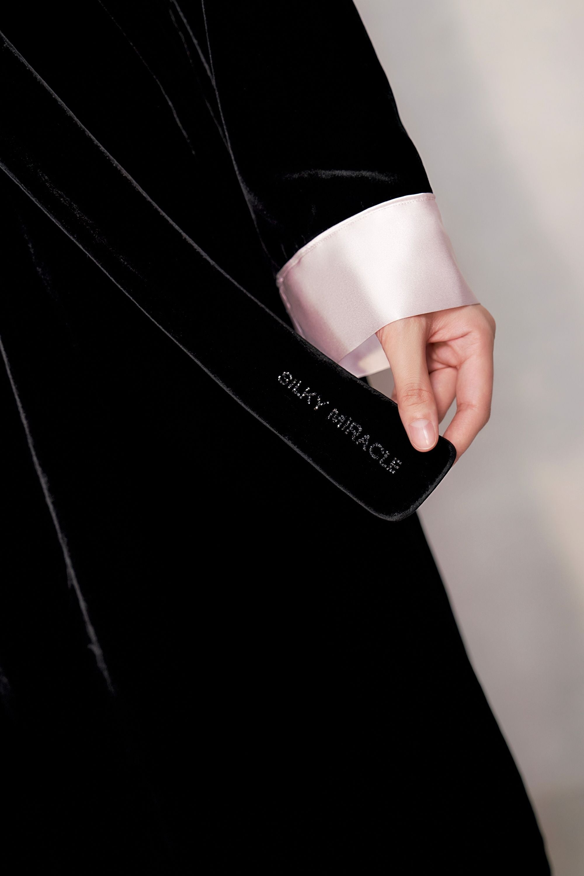 Introducing the Black Velvet Silk Robe. A timeless and elegance piece cut from premium black velvet and soft cherry blossom pink silk. Adorned with Swarovski crystal details.