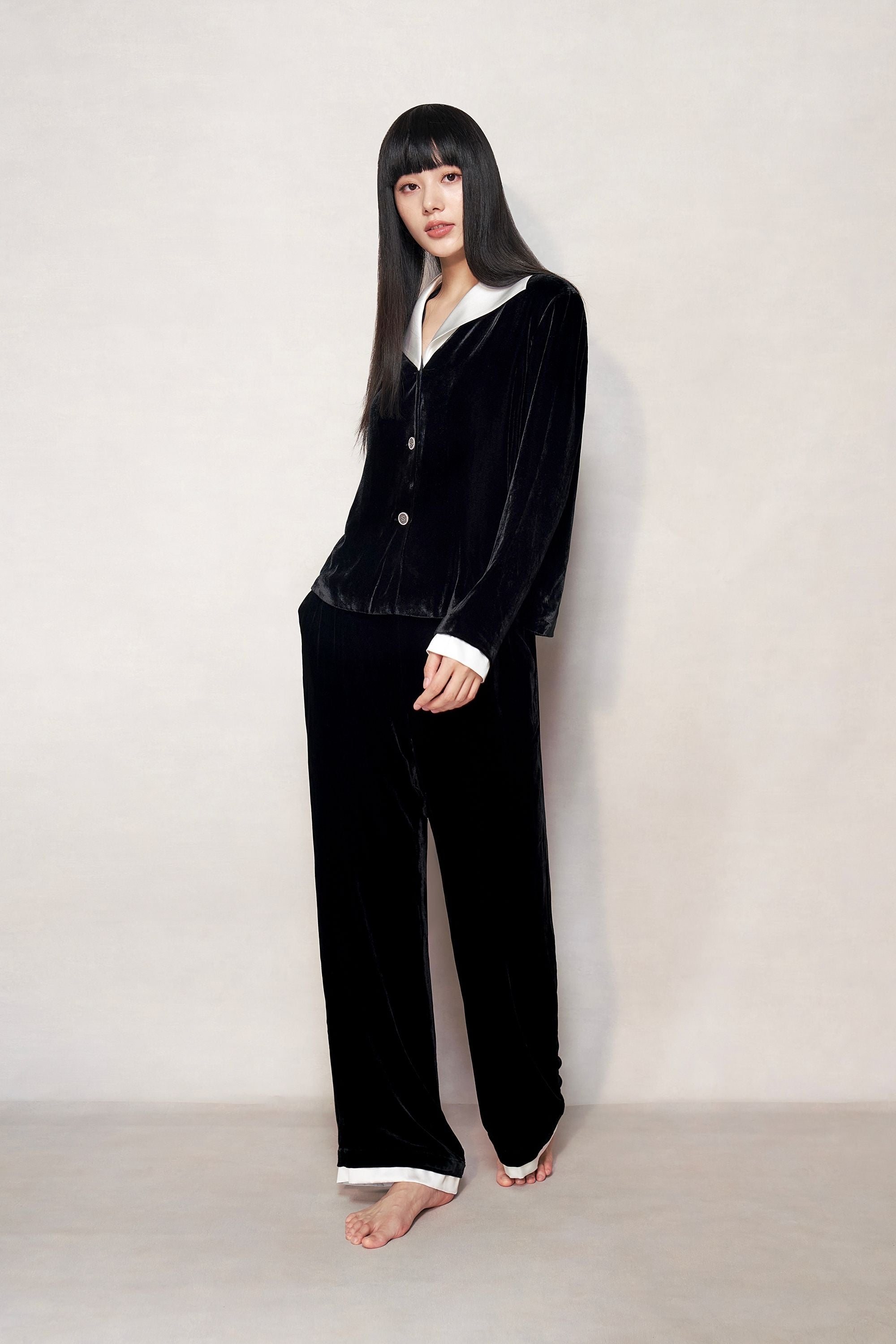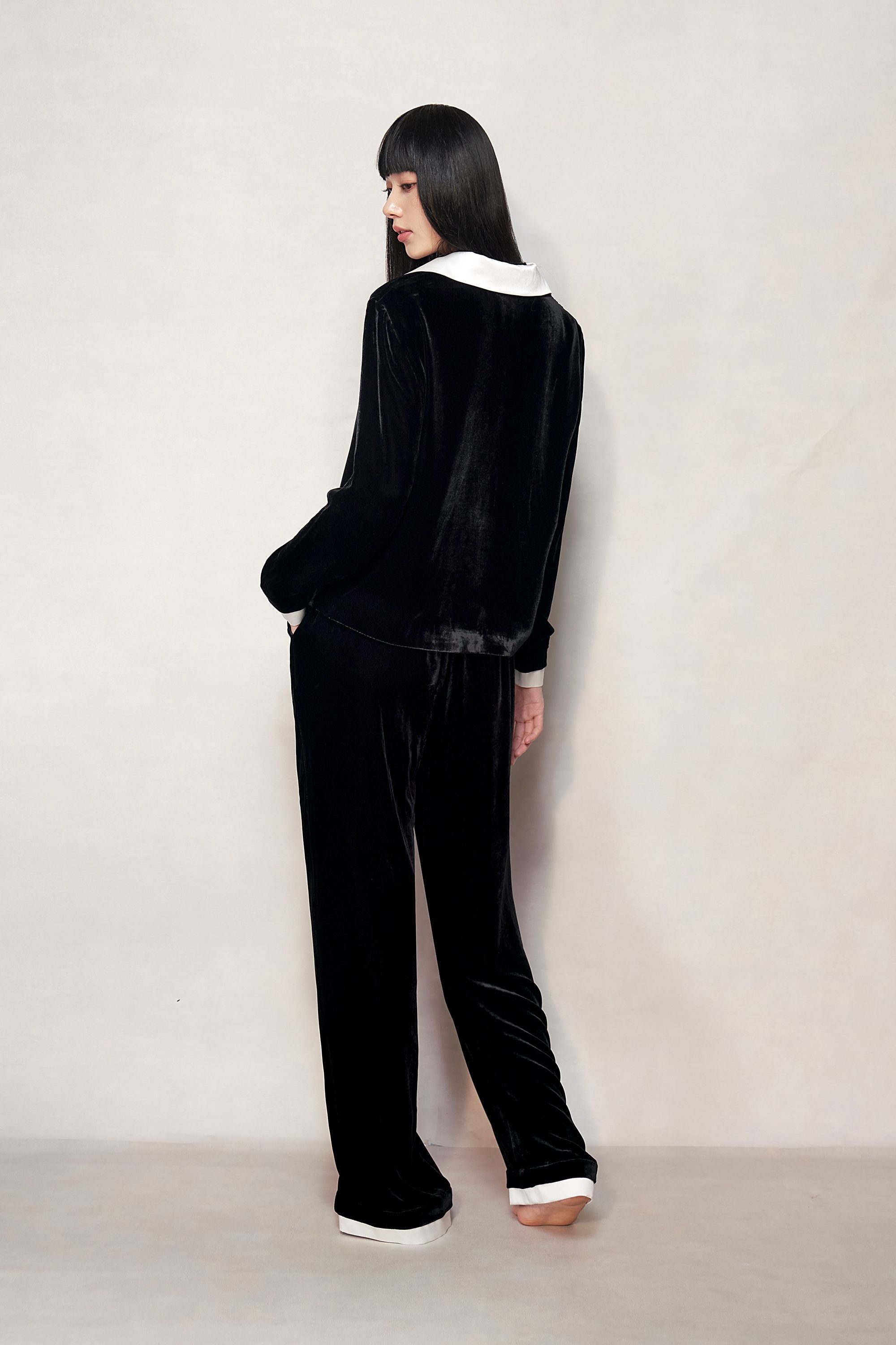 Crafted from Italian silk velvet, this fabric exudes softness & delicacy. Pearl white lapel design brings subtle, serene ambiance. Boasting 16mm silk lining w/ double layer for warmth & comfort, it ensures pampering. Silk straight-leg lounge trousers designed to flatter silhouette. Fabric A: 82% Viscose, 18% Mulberry Silk; Fabric B & C: 100% Mulberry Silk.