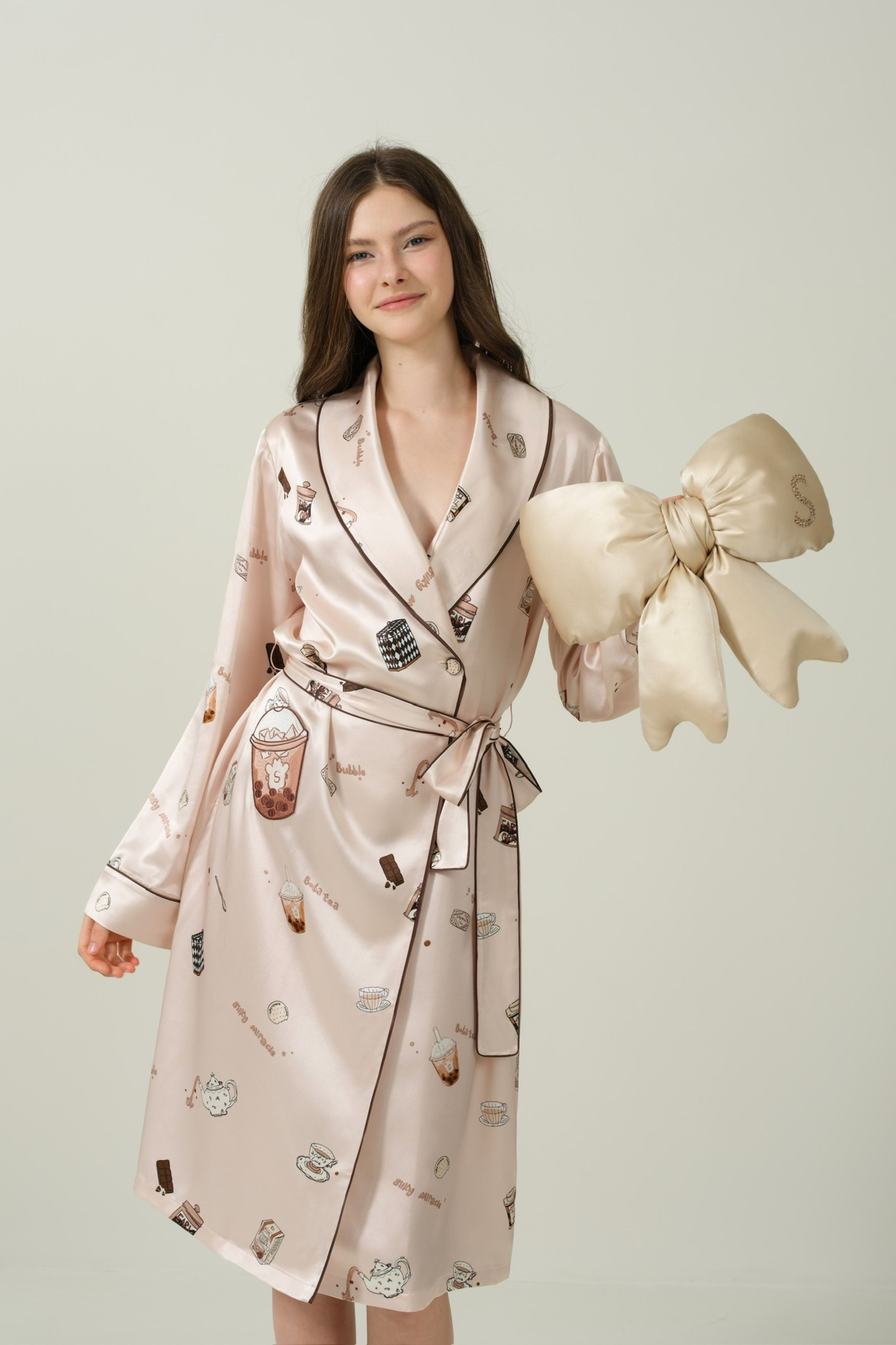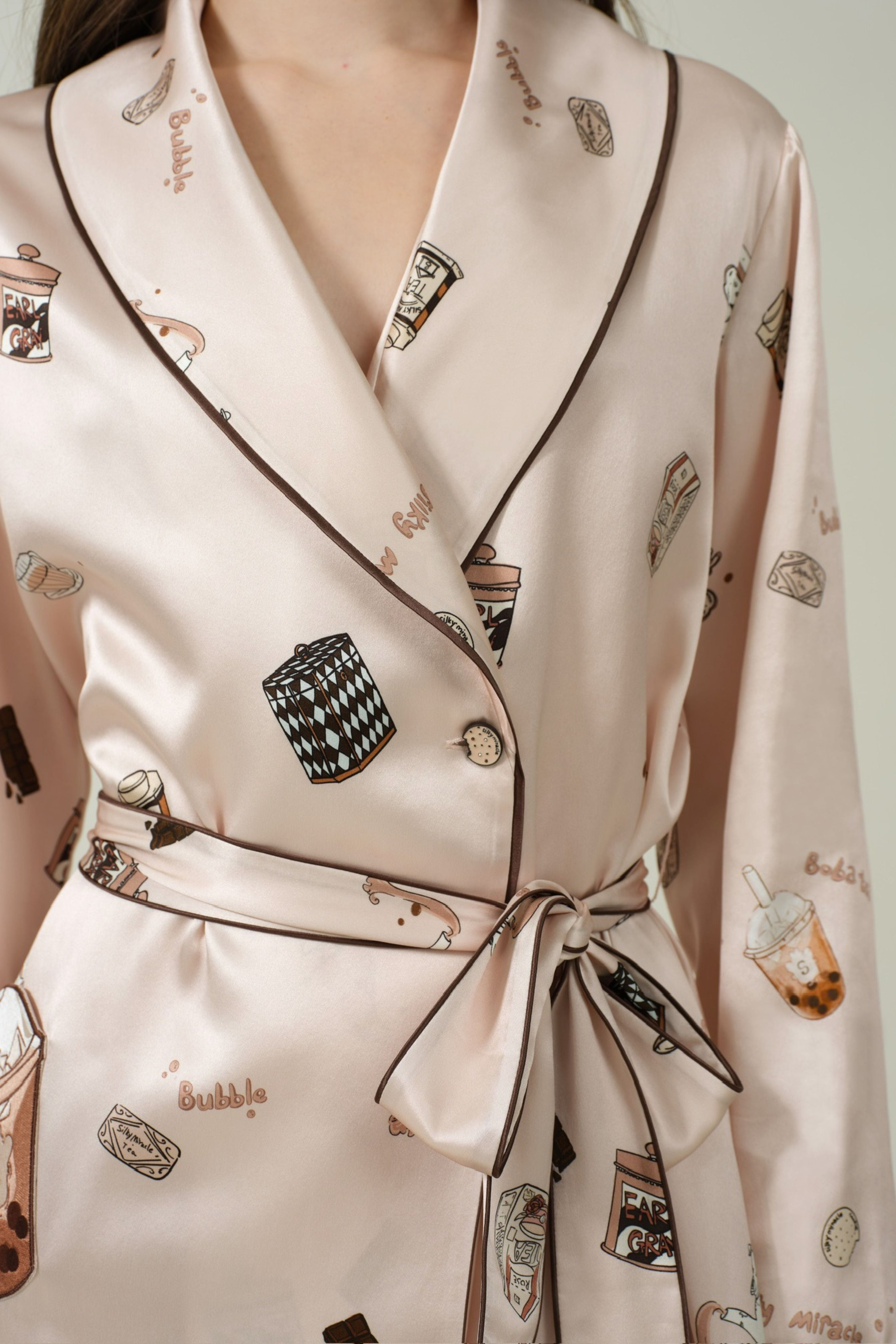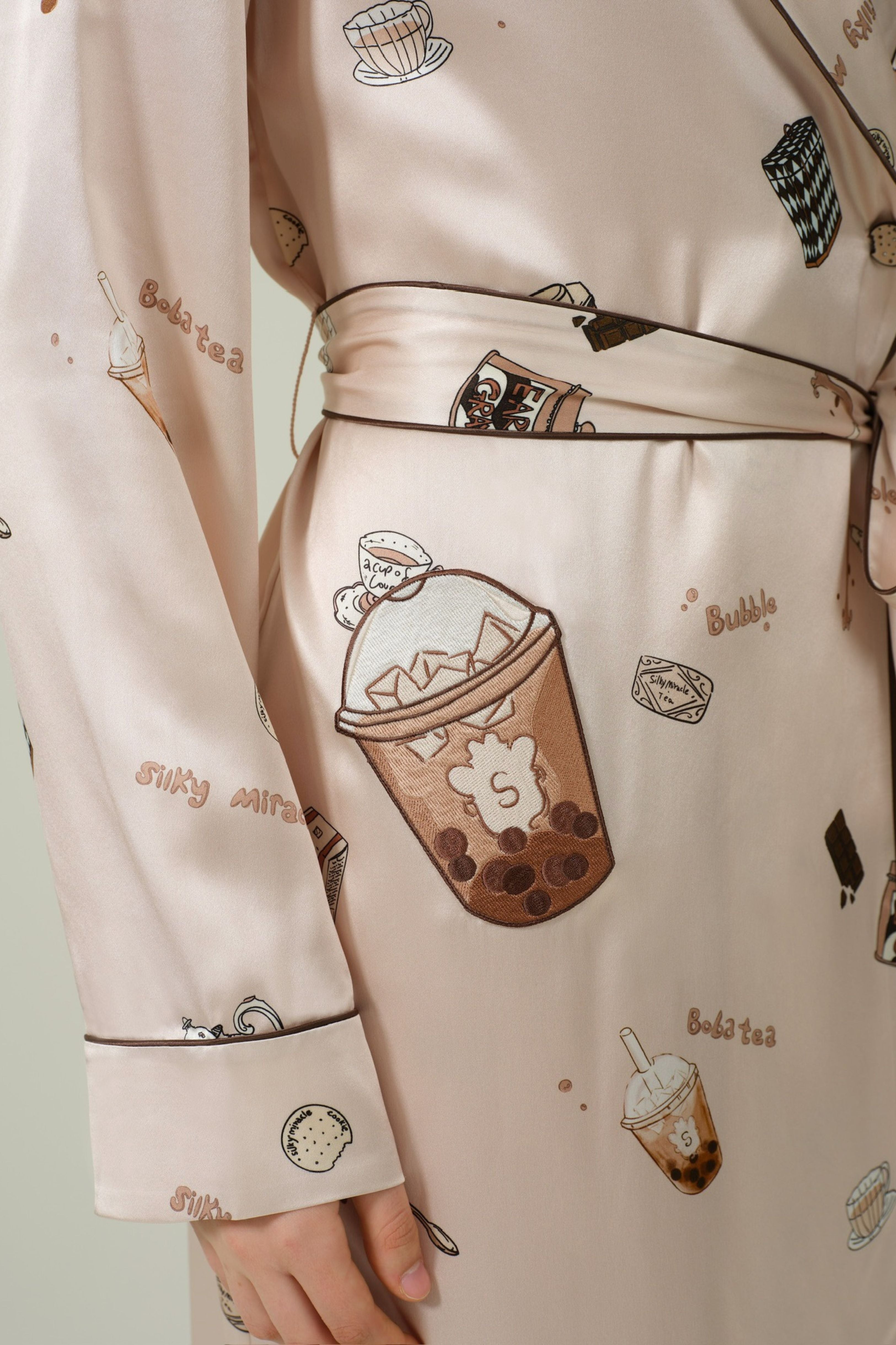 Crafted from 100% Mulberry Silk, the Boba Tea Robe showcases delightful milk tea, sugar jar, and cookie motifs brought to life with intricate embroidery, custom buttons, and exclusive prints. The robe features a soft shawl collar that comfortably wraps the shoulders and neck, cookie-shaped rhinestone button and an embroidered patch pocket with a pearl milk tea motif to add a unique sparkle.