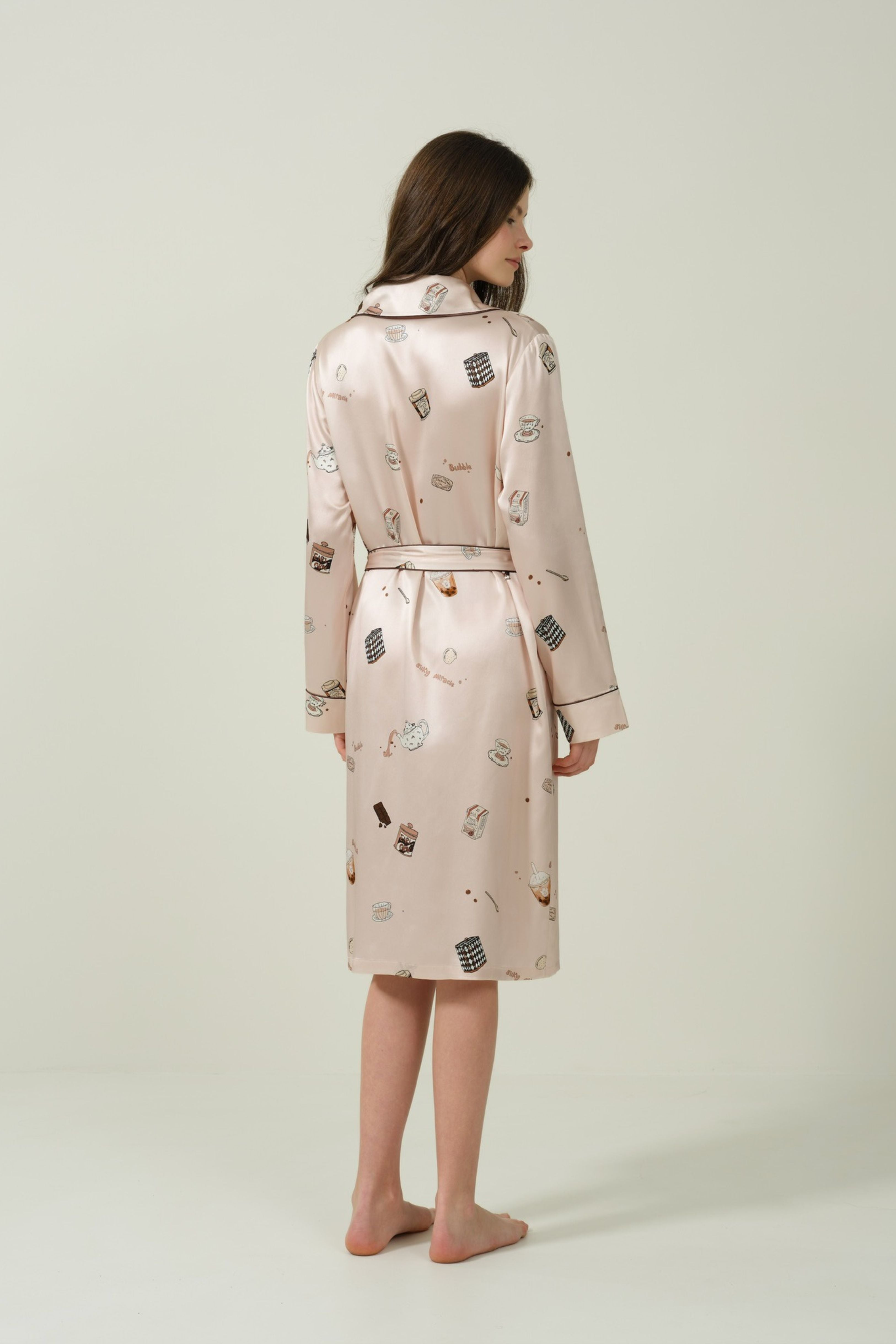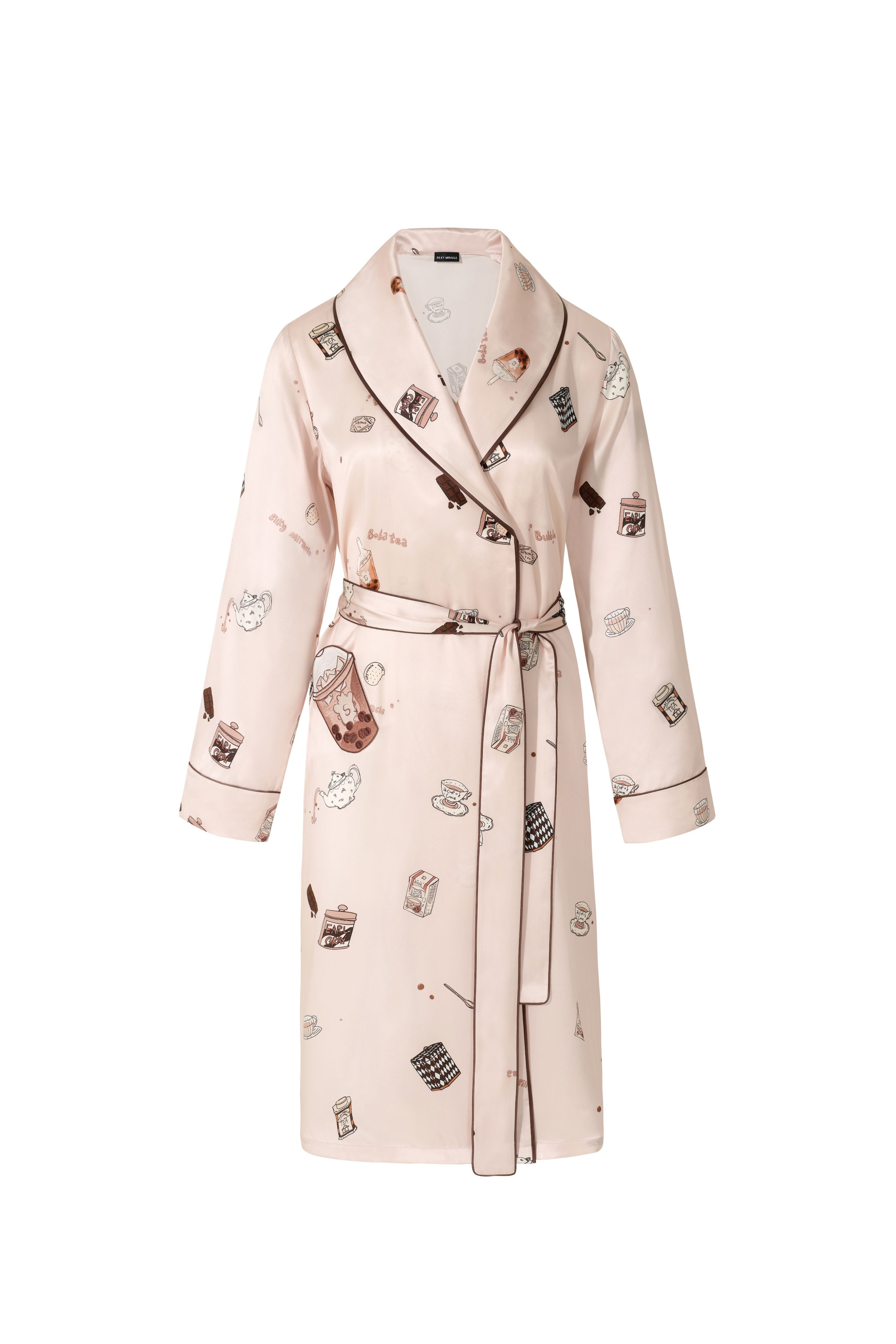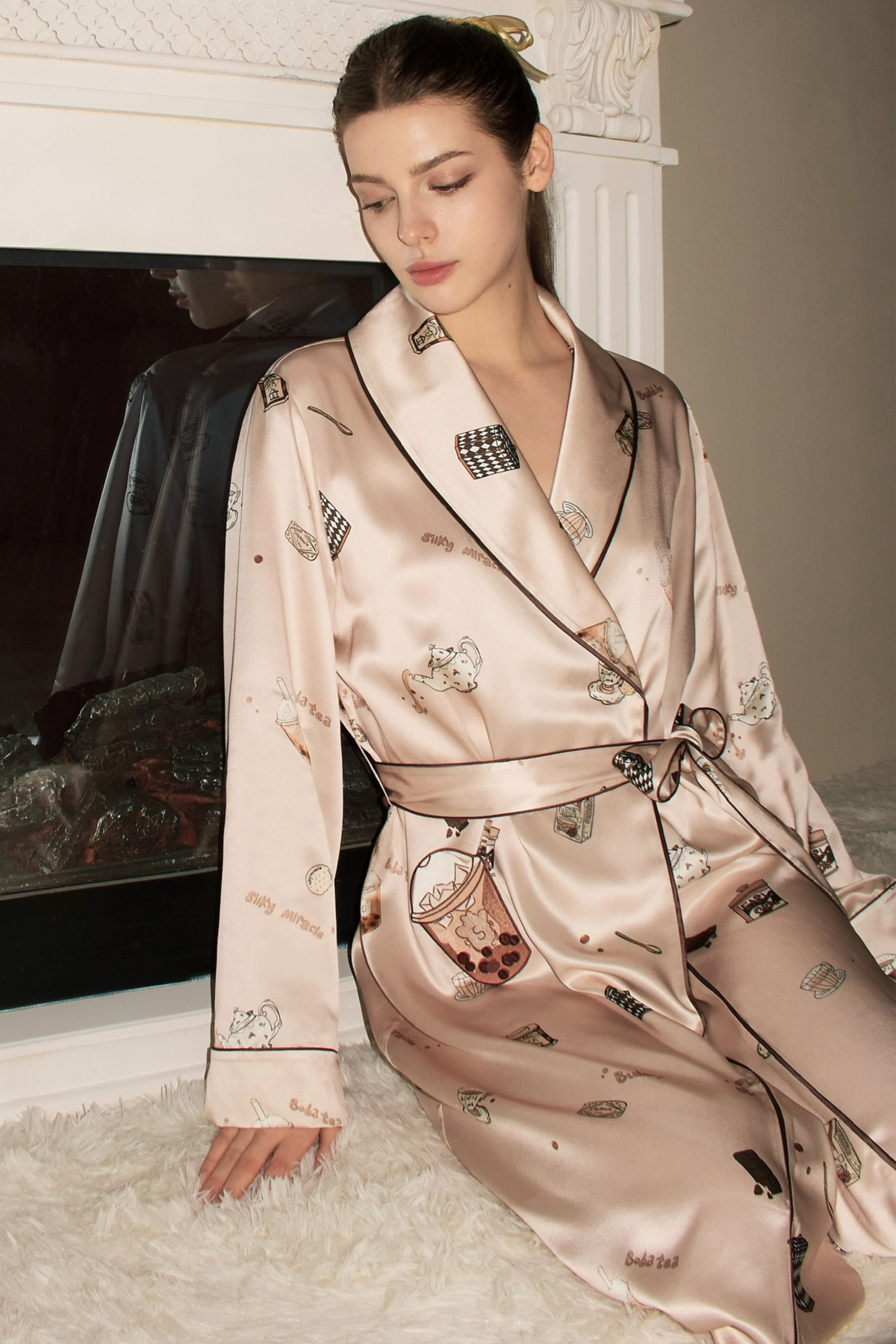Crafted from 100% Mulberry Silk, the Boba Tea Robe showcases delightful milk tea, sugar jar, and cookie motifs brought to life with intricate embroidery, custom buttons, and exclusive prints. The robe features a soft shawl collar that comfortably wraps the shoulders and neck, cookie-shaped rhinestone button and an embroidered patch pocket with a pearl milk tea motif to add a unique sparkle.