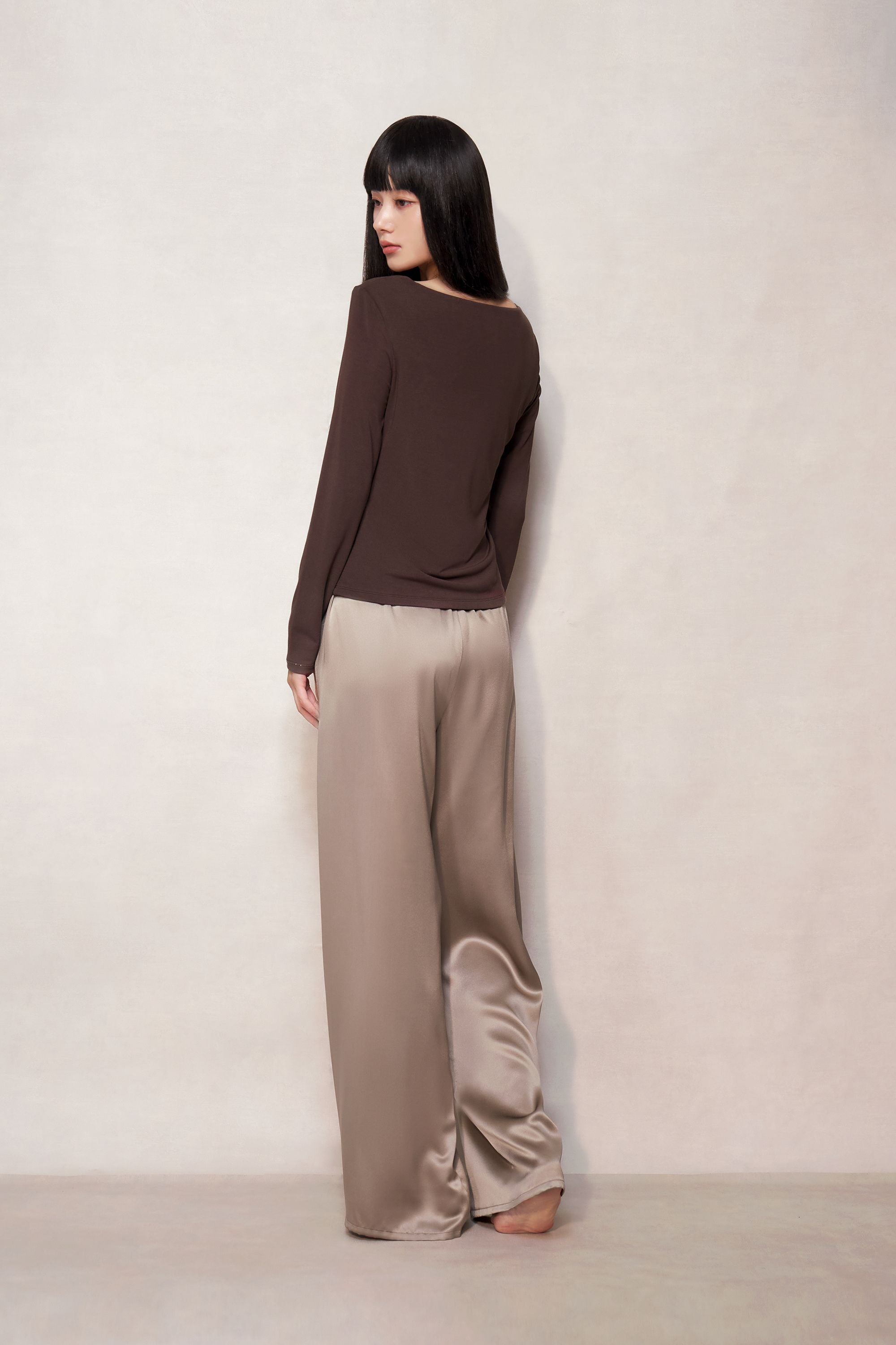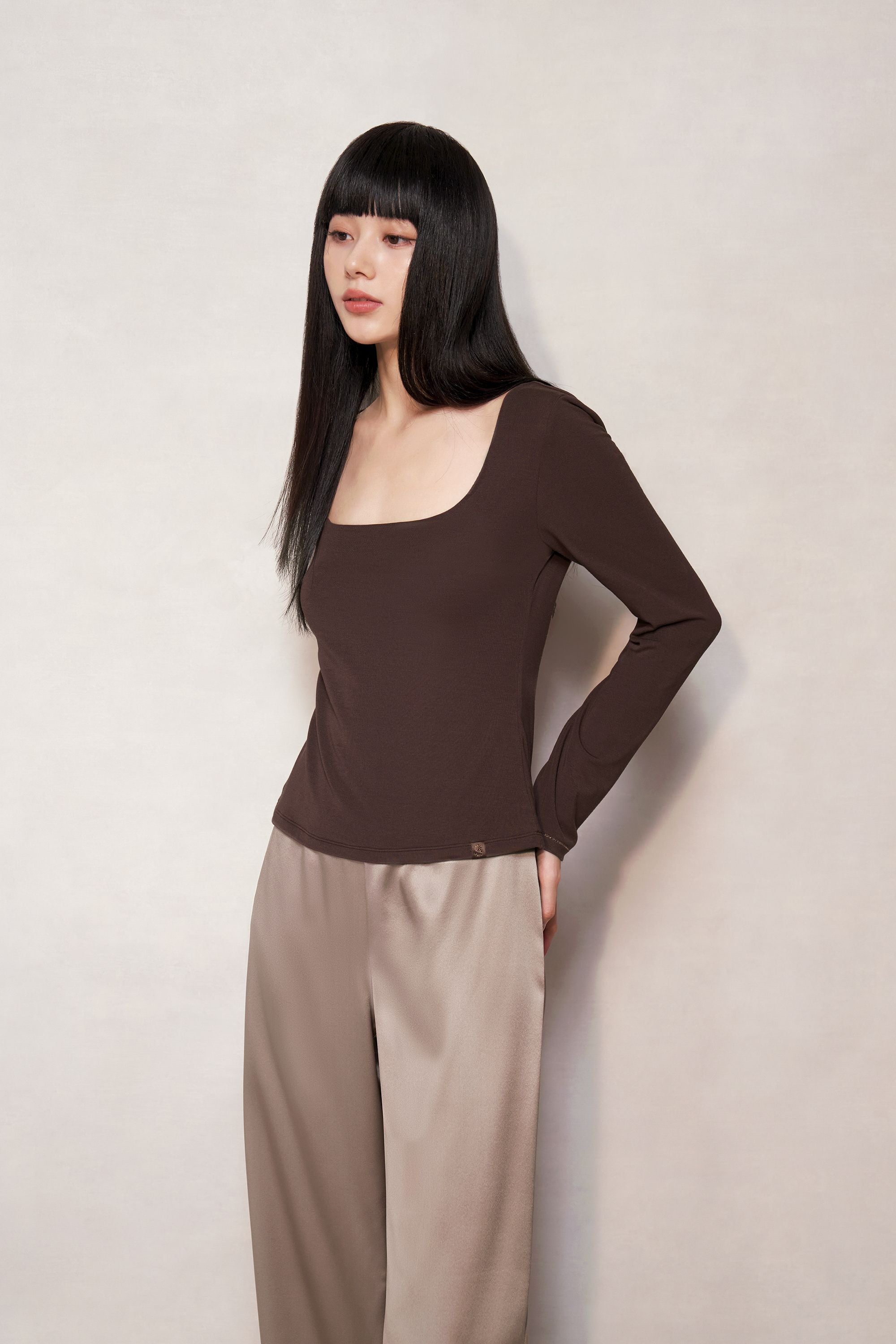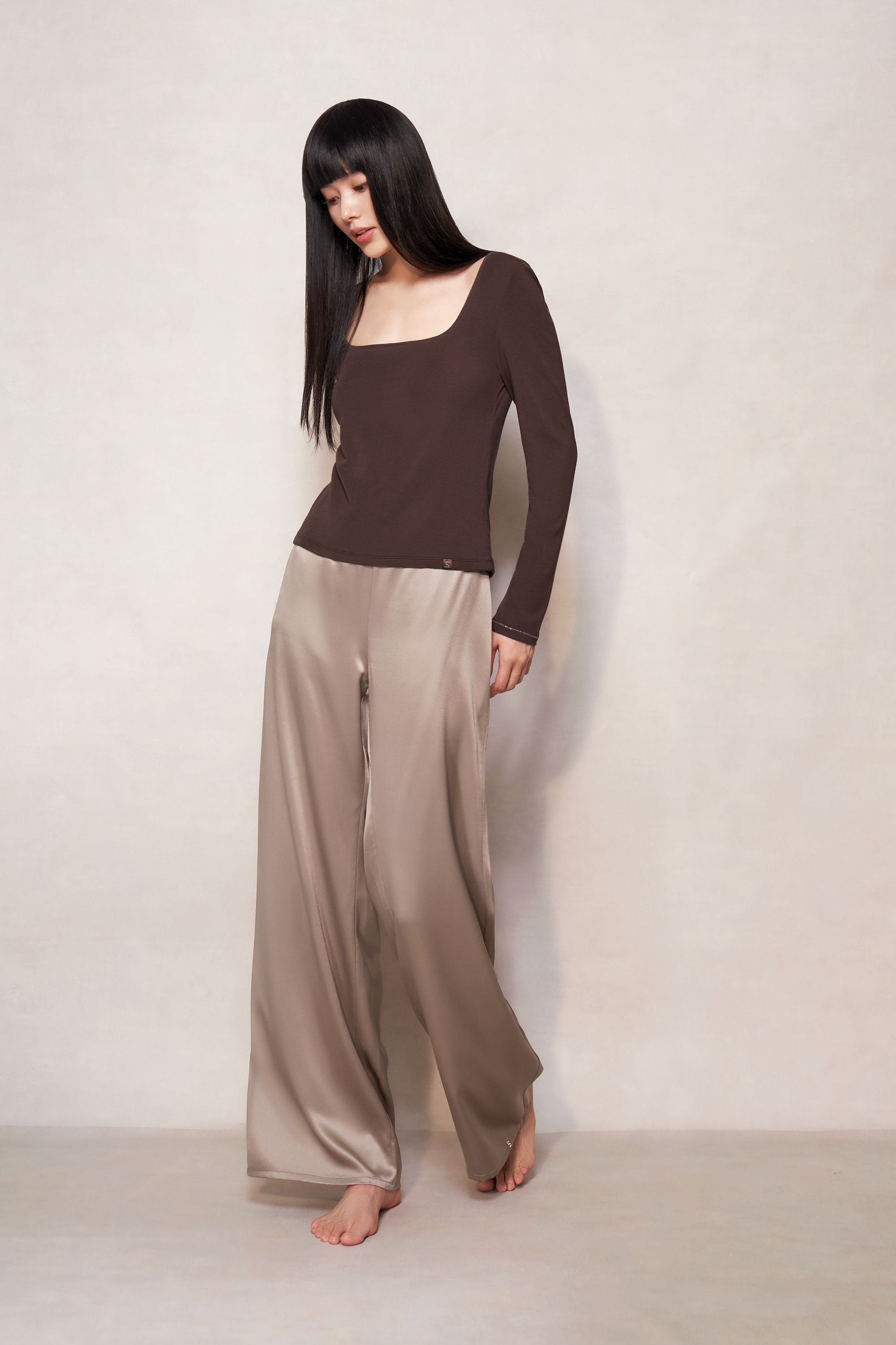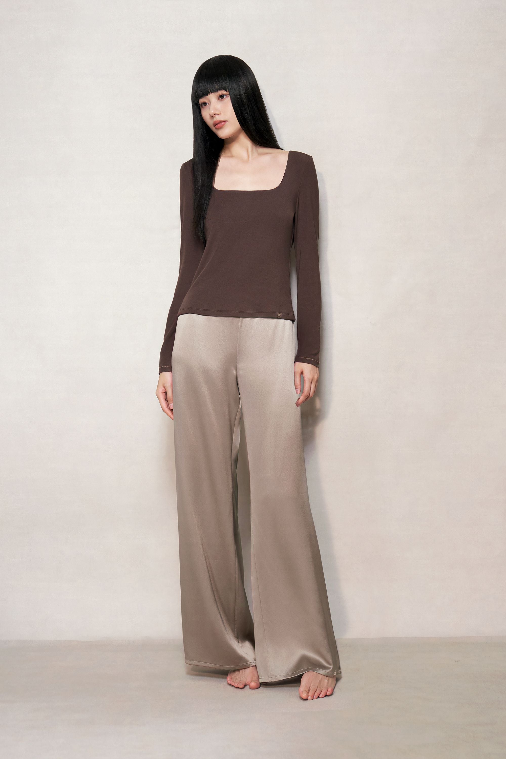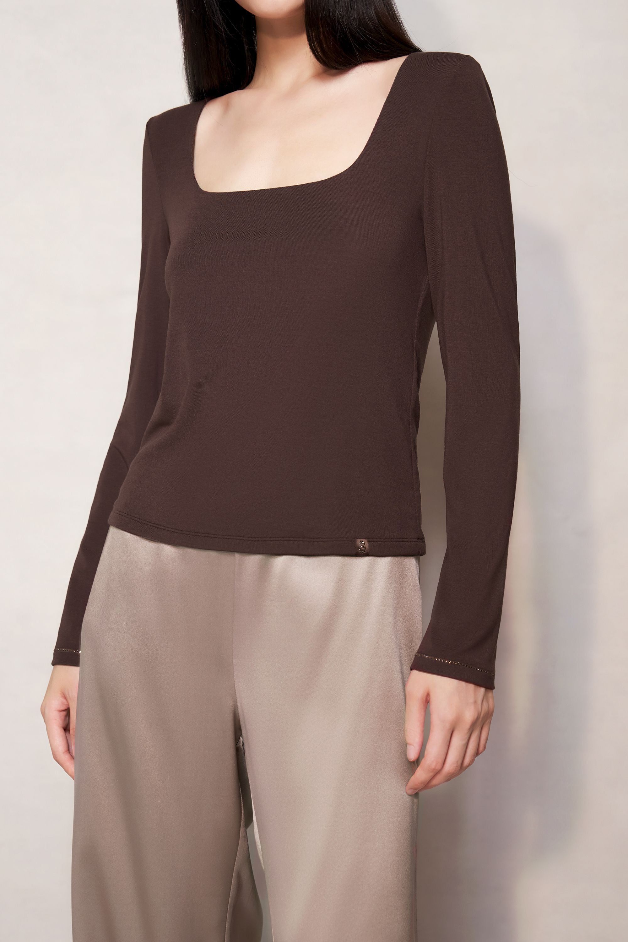 Live beautifully in the light chocolate brown mulberry silk blend stretchy fabric renowned for its supple feel. Featuring a slim fit, square neckline and long sleeves.