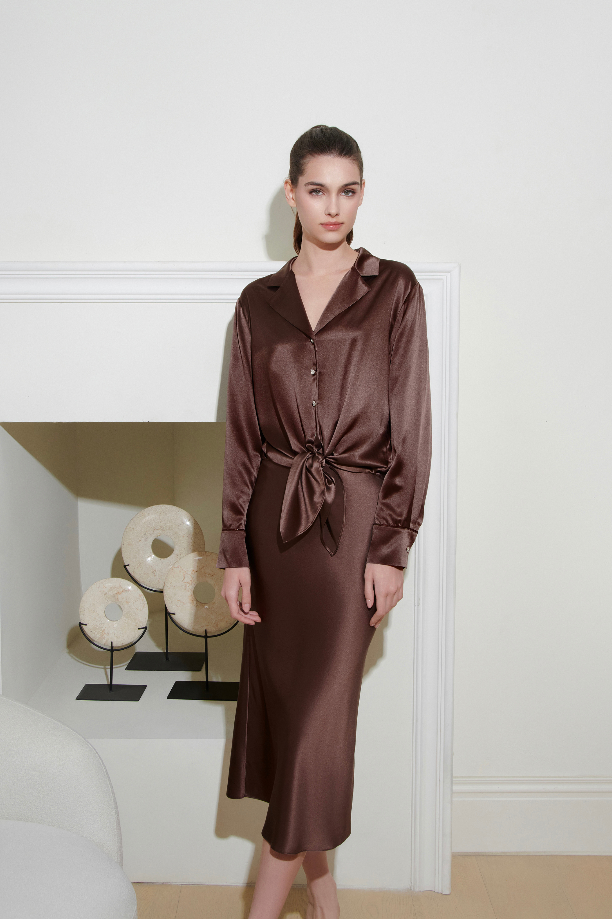 The Women's Silk Bow Shirt is adorned with Swarovski crystal buttons shaped like love hearts and a charming bow hemline.