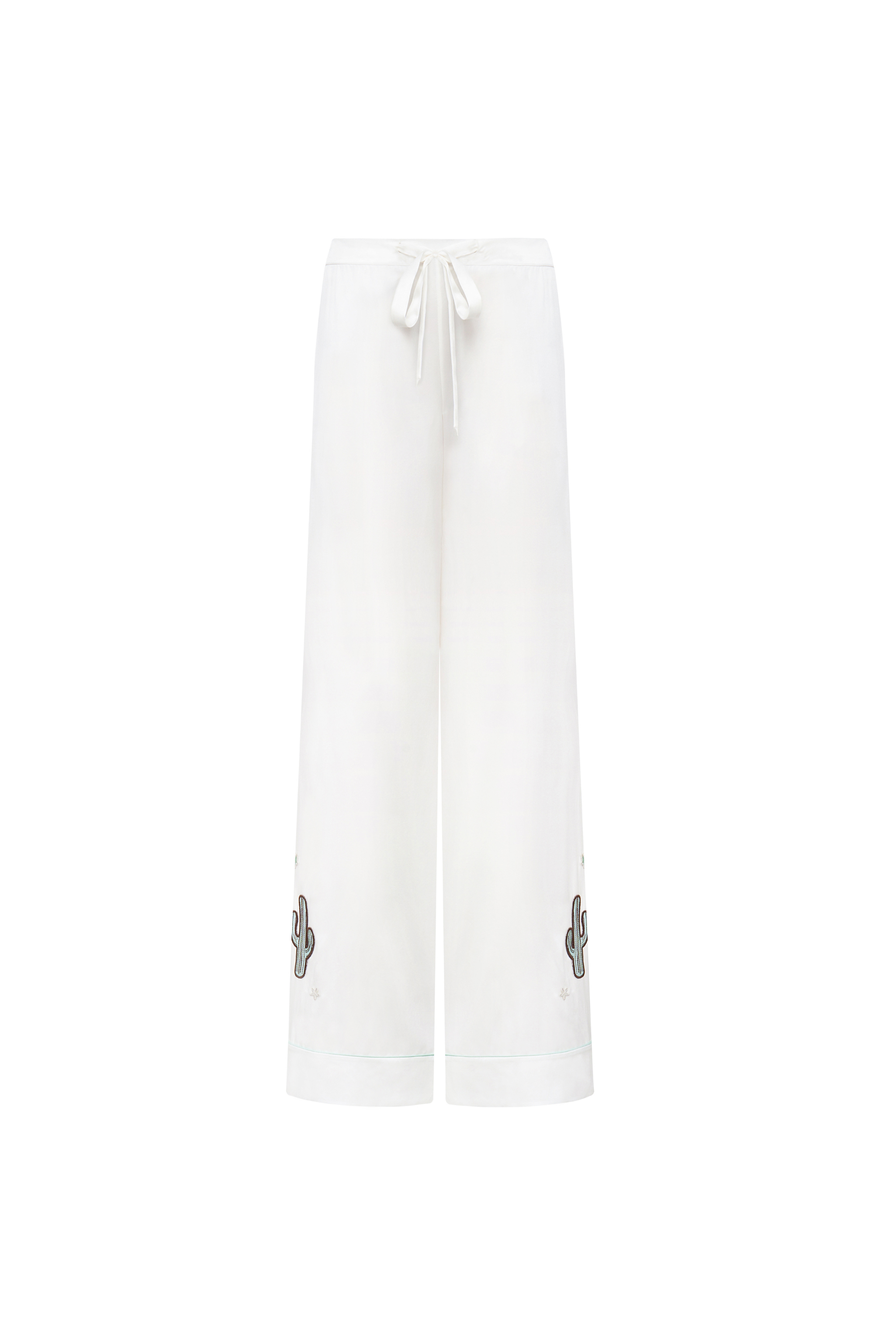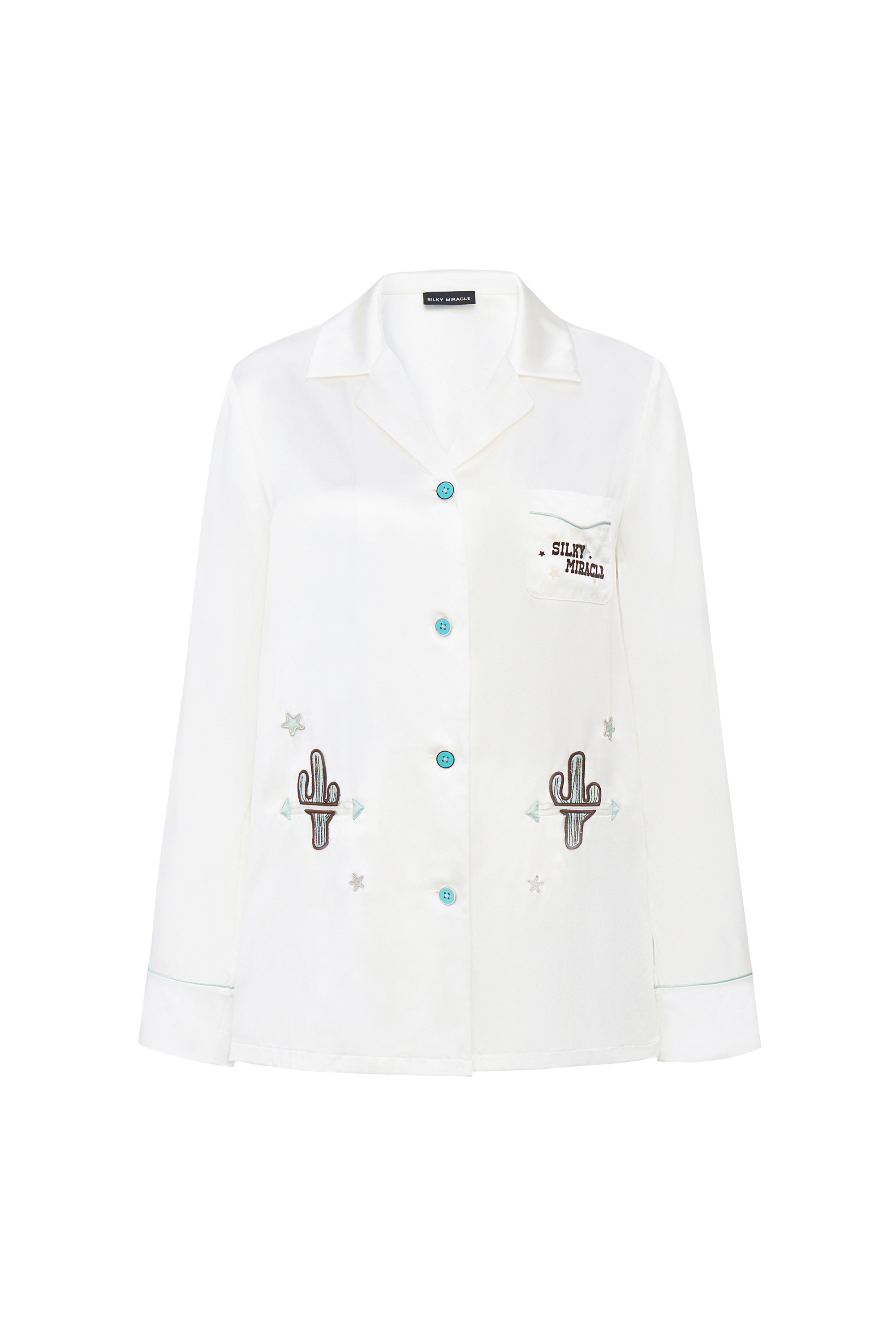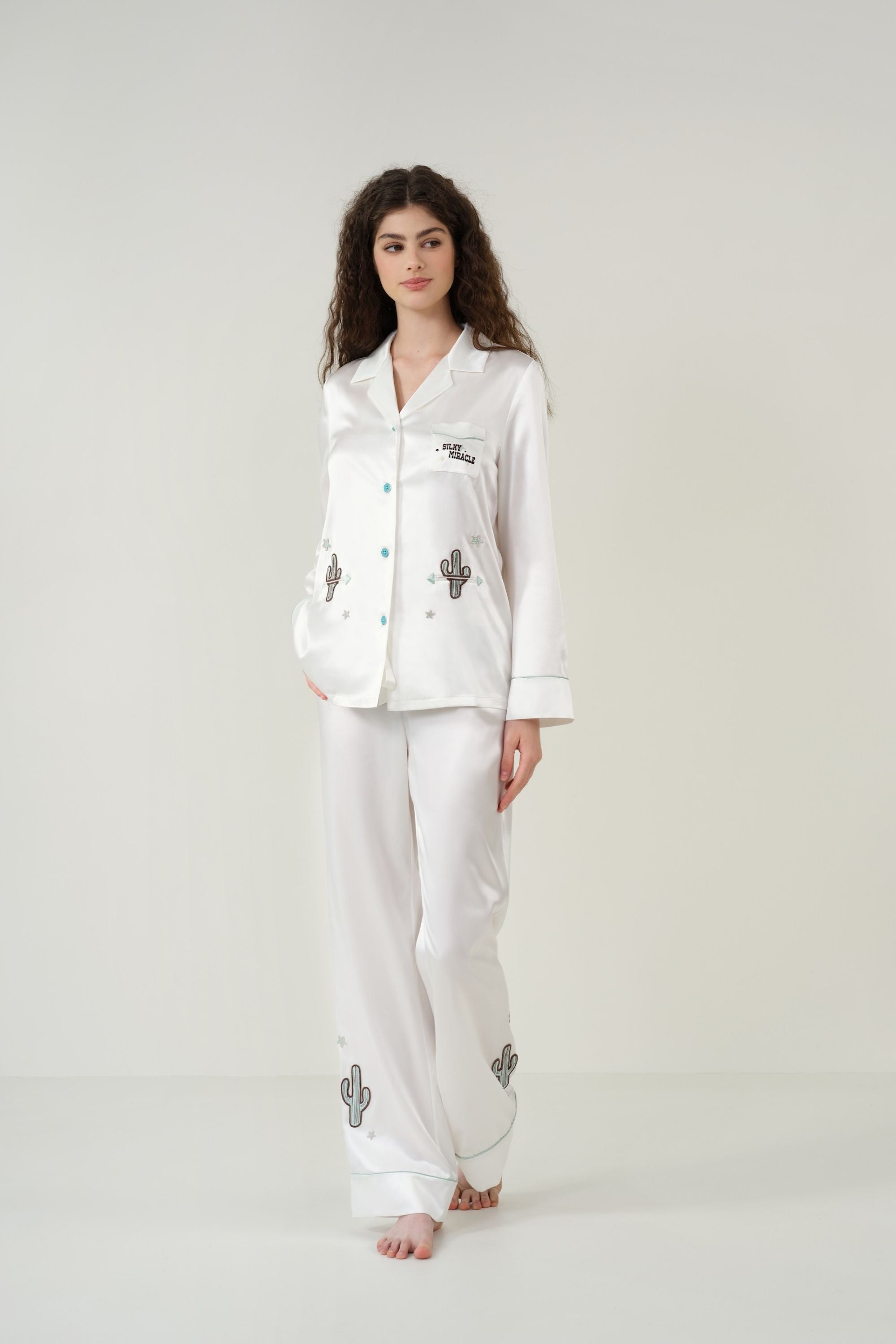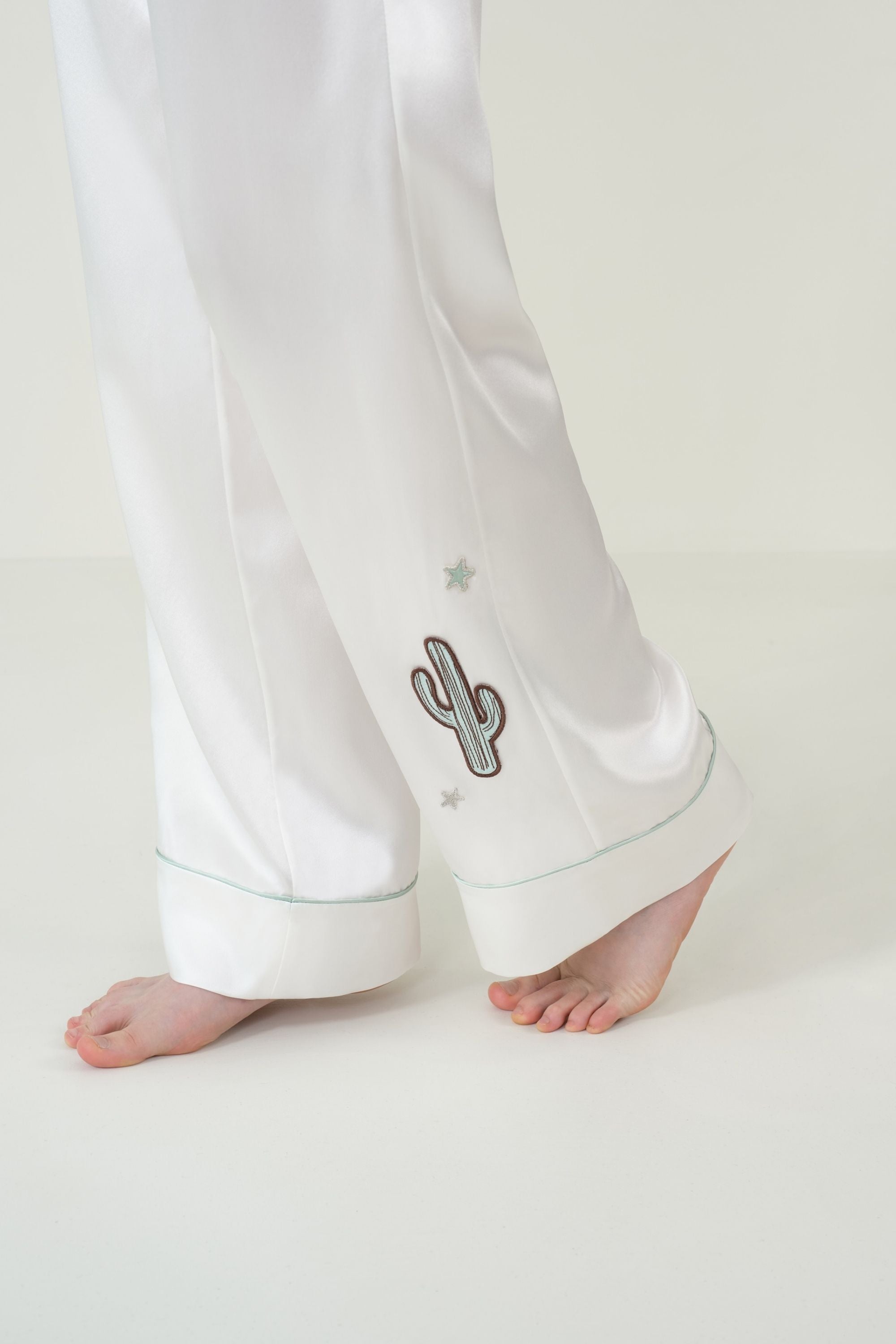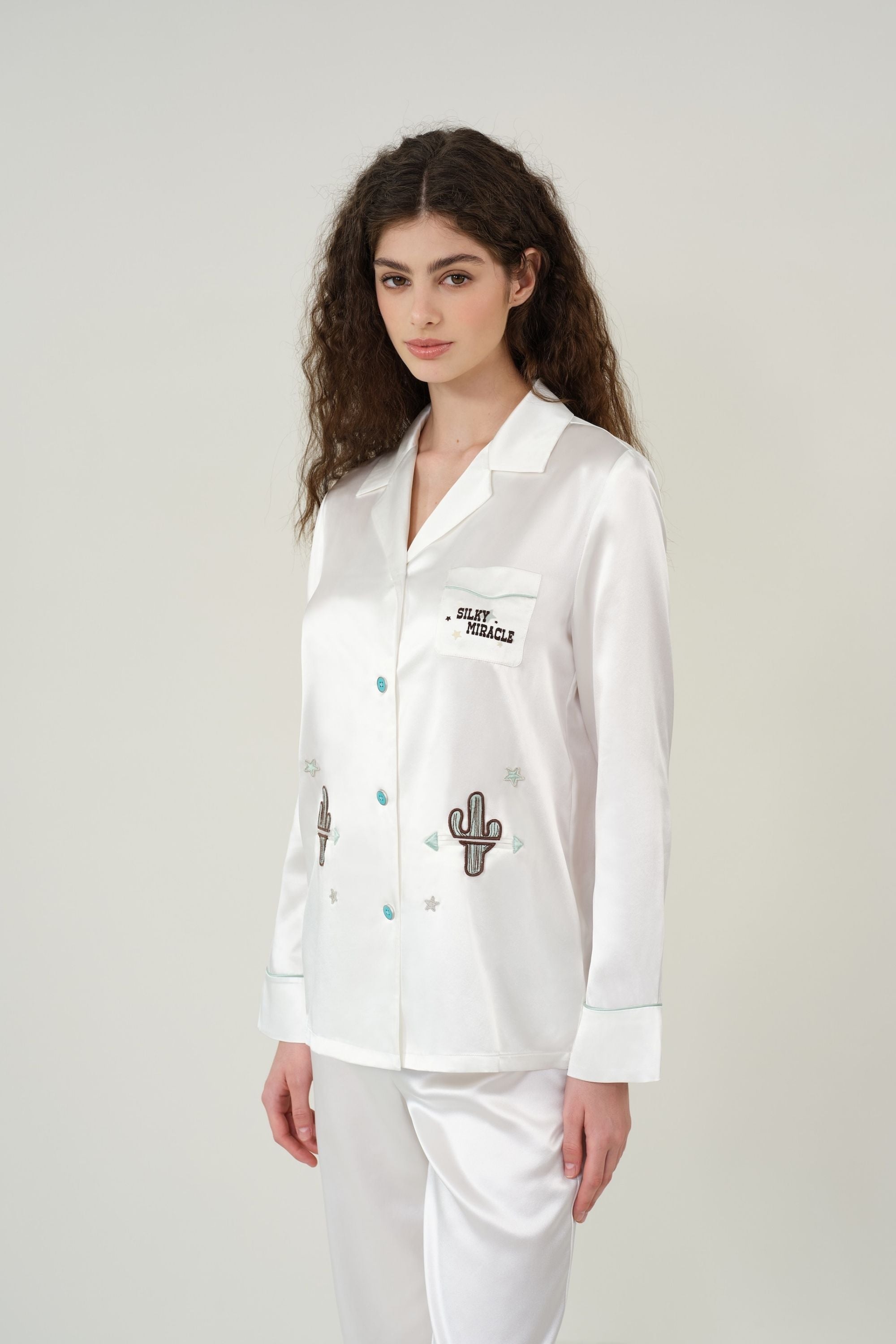 The relaxed, loose-fit white silk pajamas feature colorful cactus and star patch embroidery with a flocked logo, blending playful charm with a touch of wild elegance.