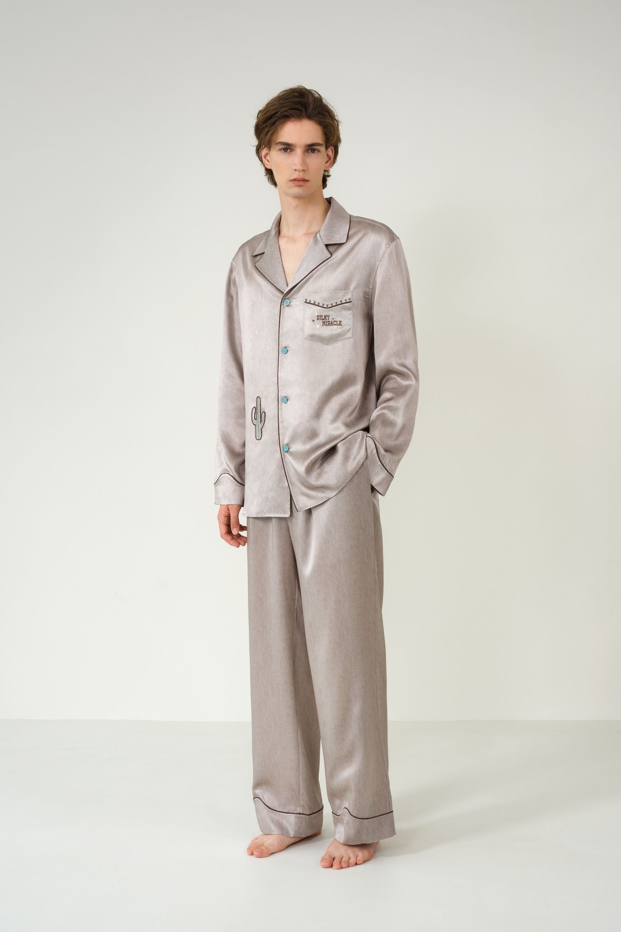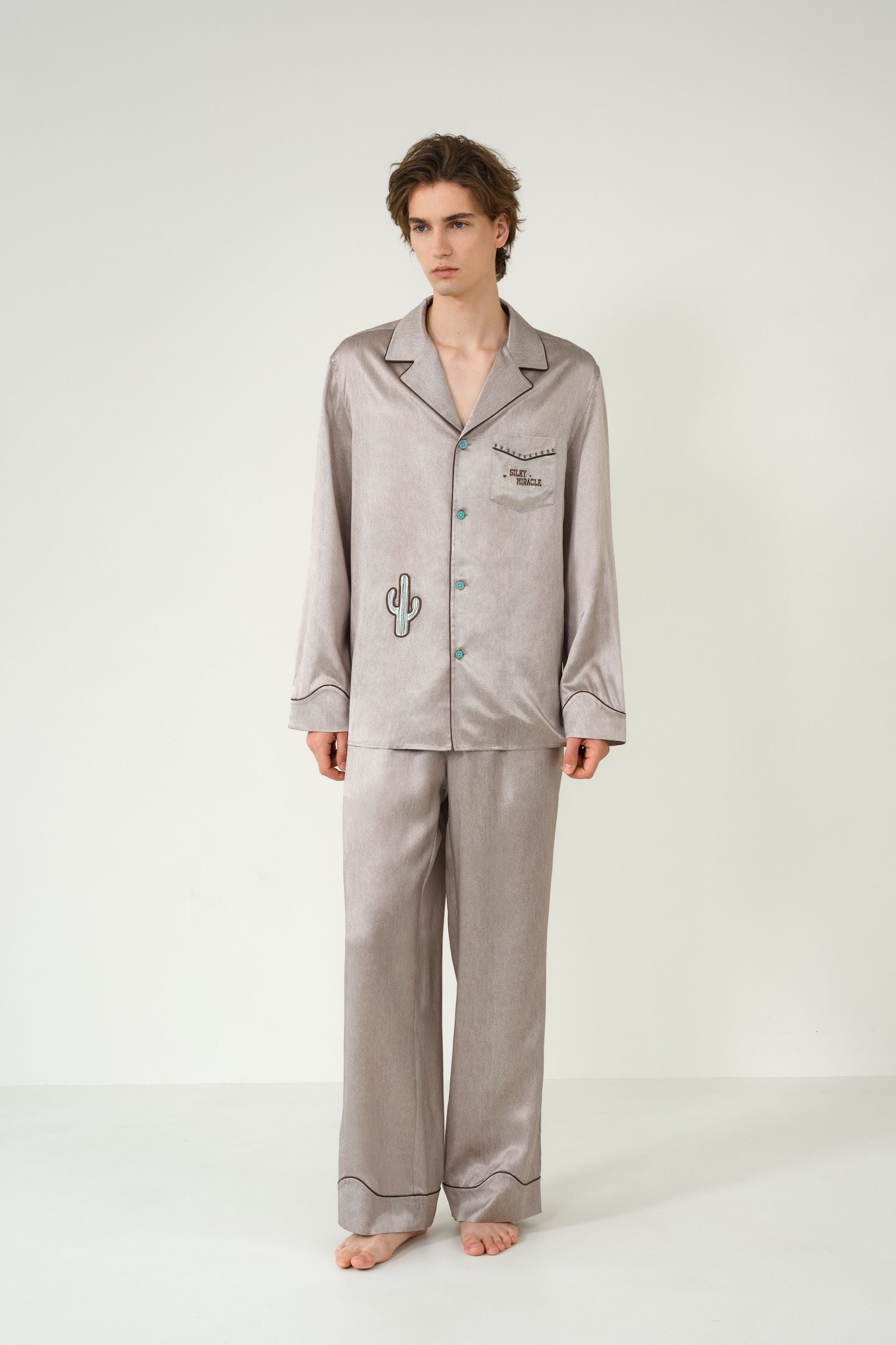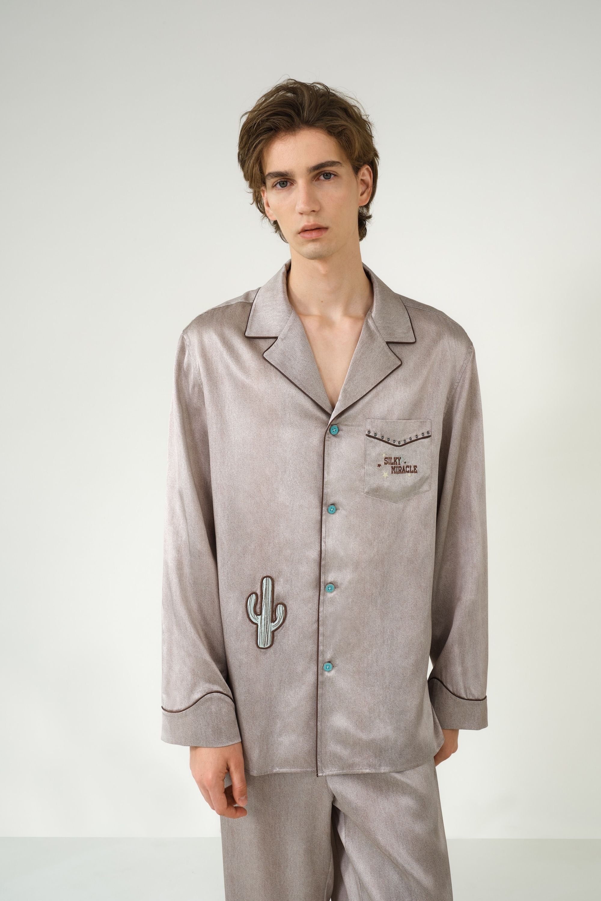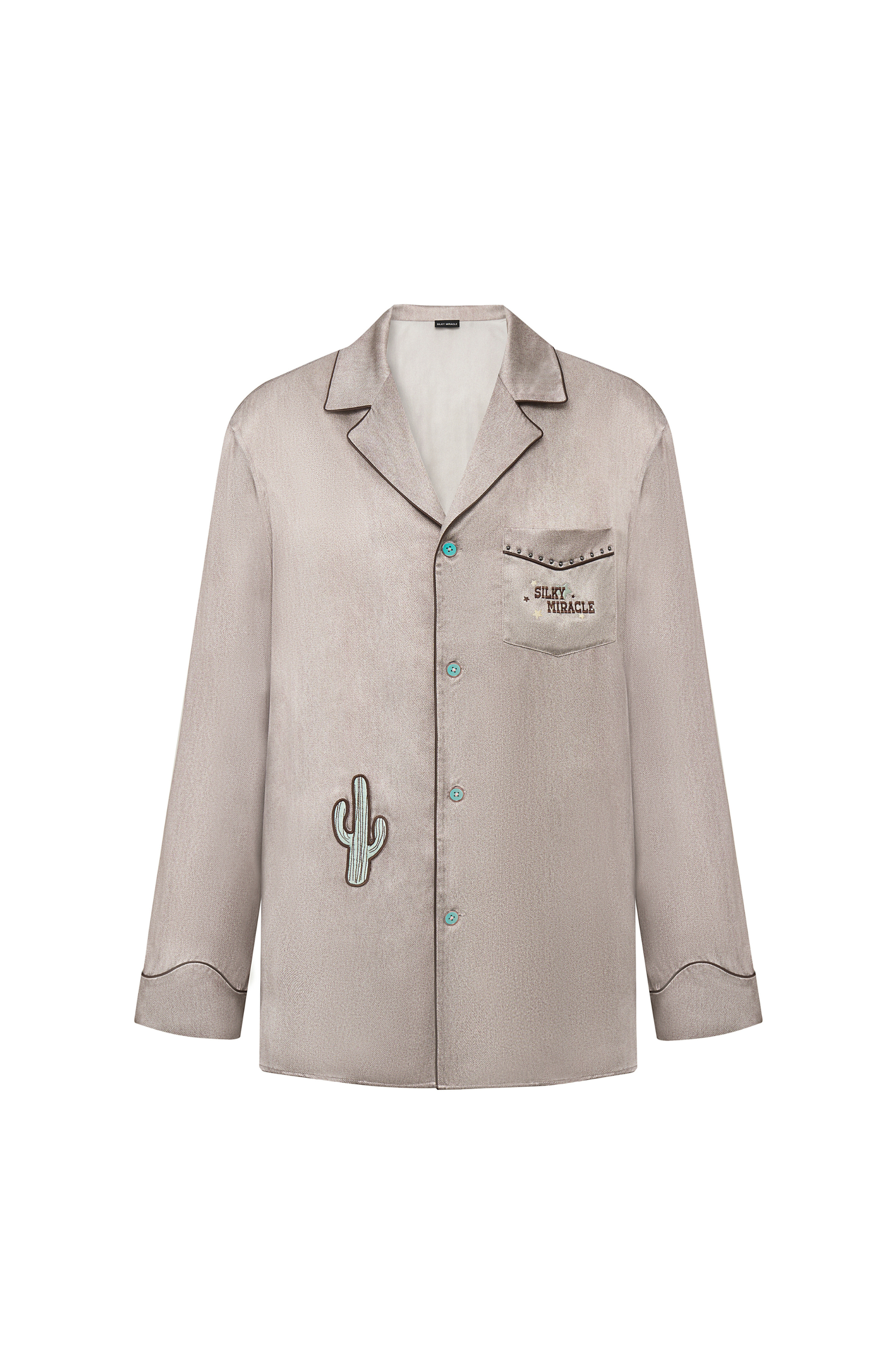 Featuring a cowboy base print with a classic suit shape, this design includes curved cuffs and split hems. The chest pocket is embroidered and adorned with metal rivets and hot stones, while silk cactus cotton appliqué adds a subtle yet lively touch of vitality and fun.