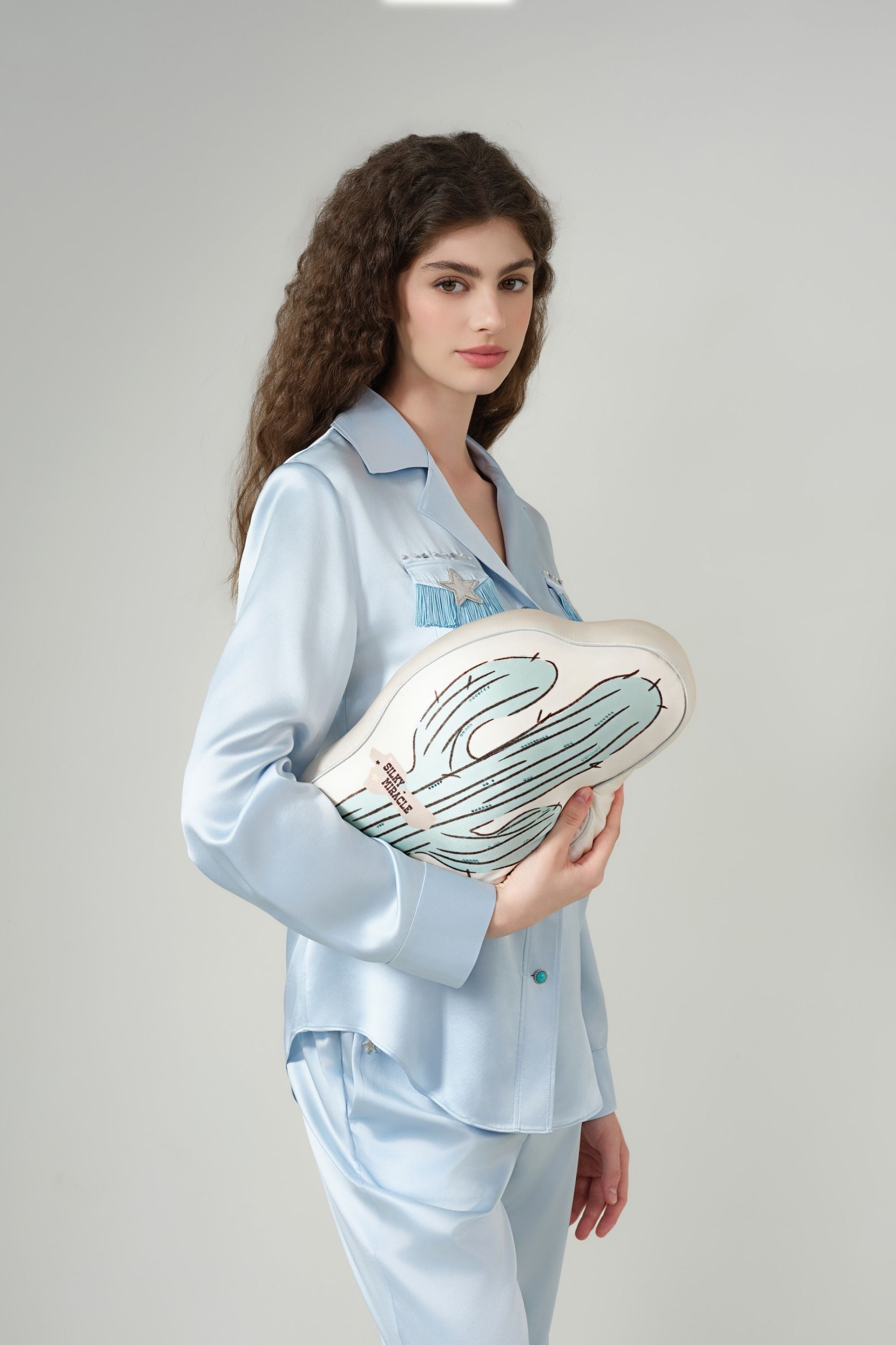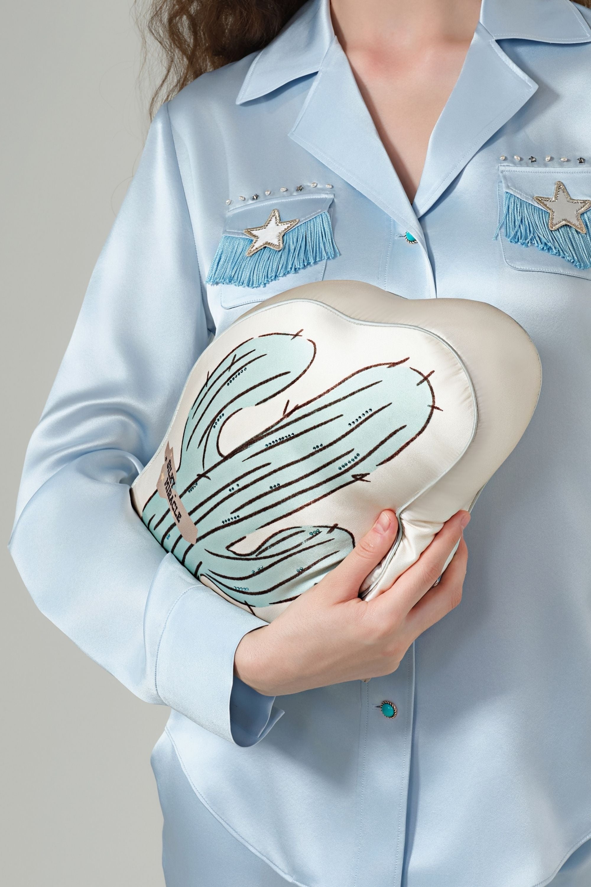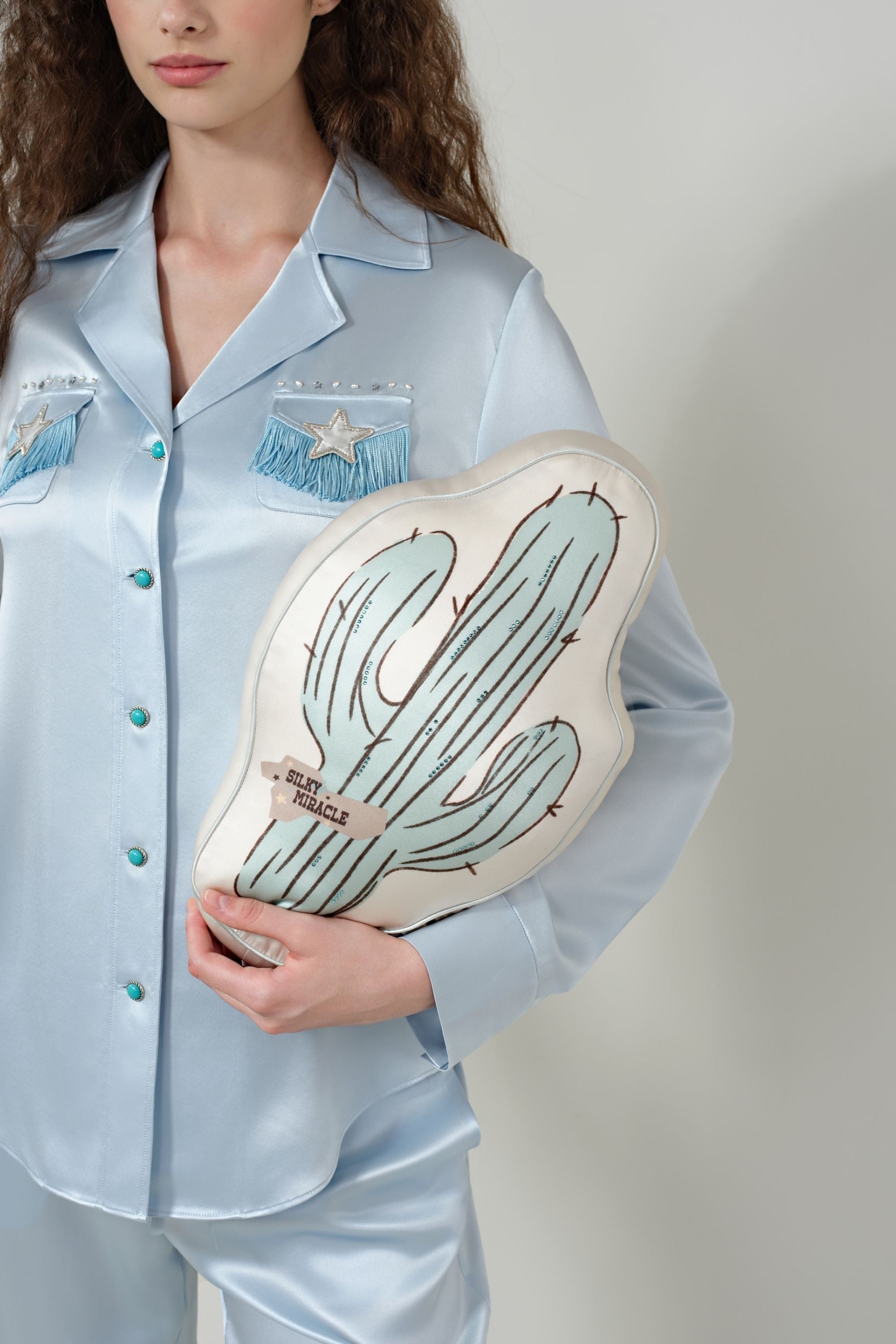 Introducing the Western Cactus Pillow. Shaped like a cactus and inspired by the rugged charm of the American West, this statement piece features a wild and free cactus print on the front. The lower left corner proudly displays a subtle, inkjet-style brand logo. Hand-painted brushstrokes are elevated by strips of turquoise green Swarovski rhinestones.