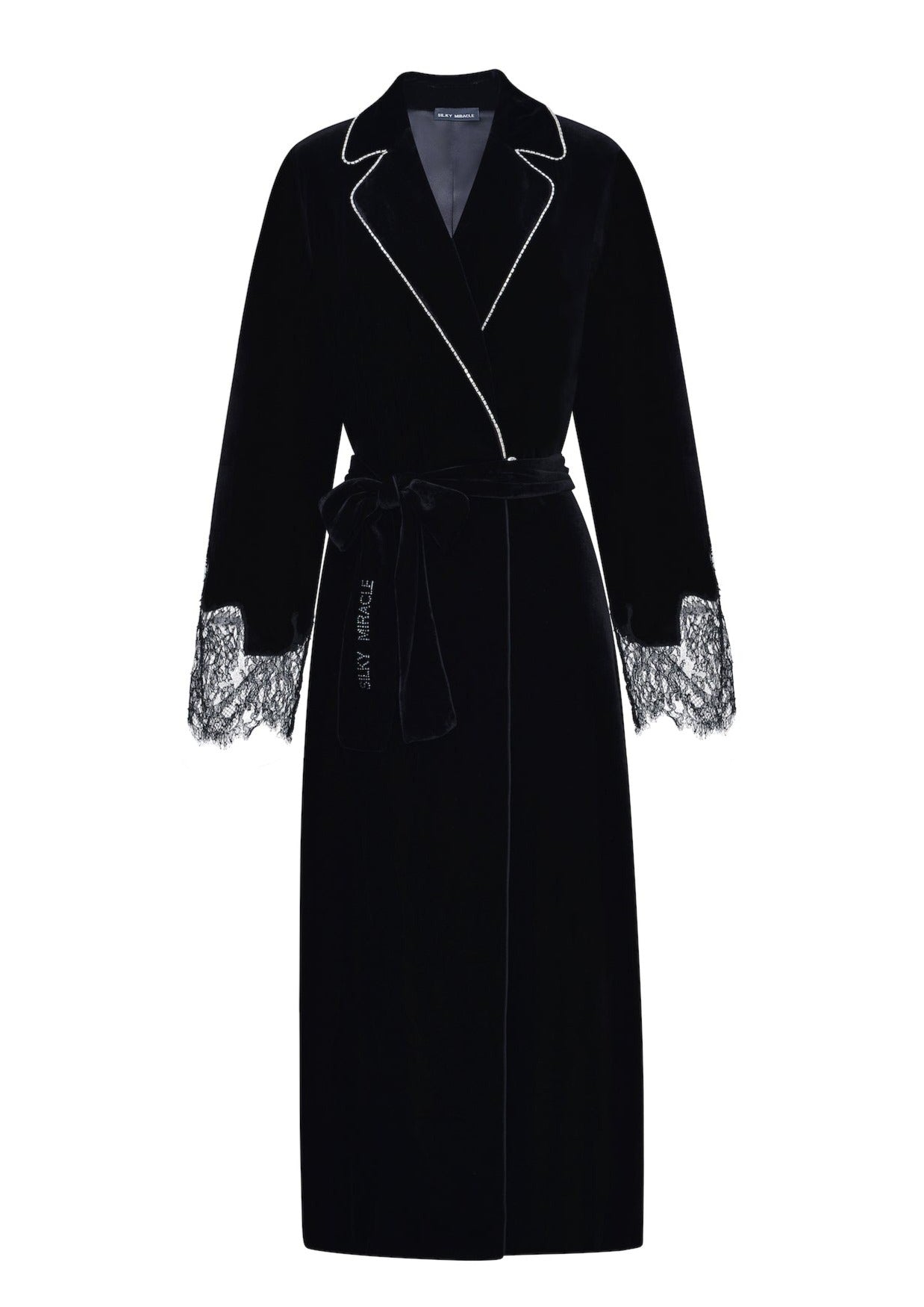 Attentively cut from a premium soft velvet, the Black Velvet Lace Robe is detailed with supple lace cuffs, emblazoned with Swarovski crystals and a brand studded tie waist.