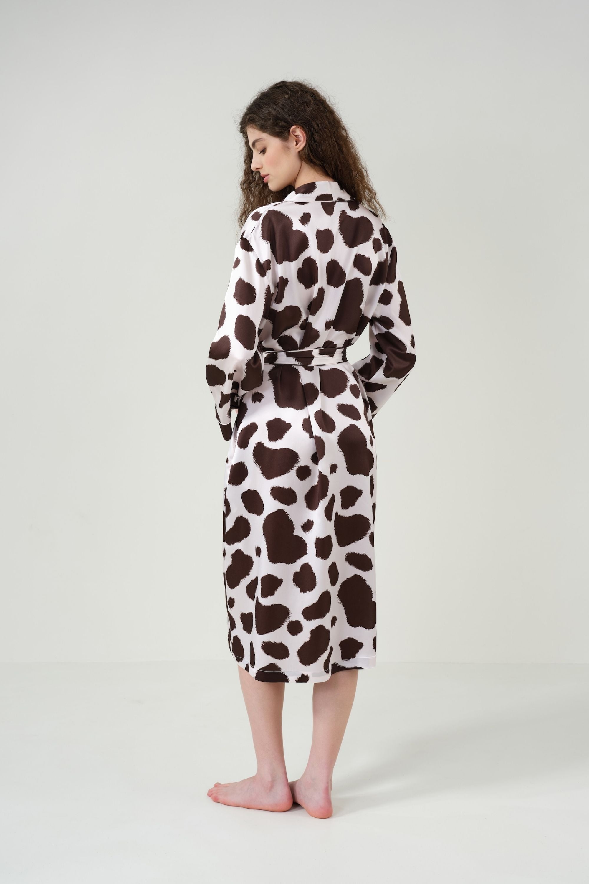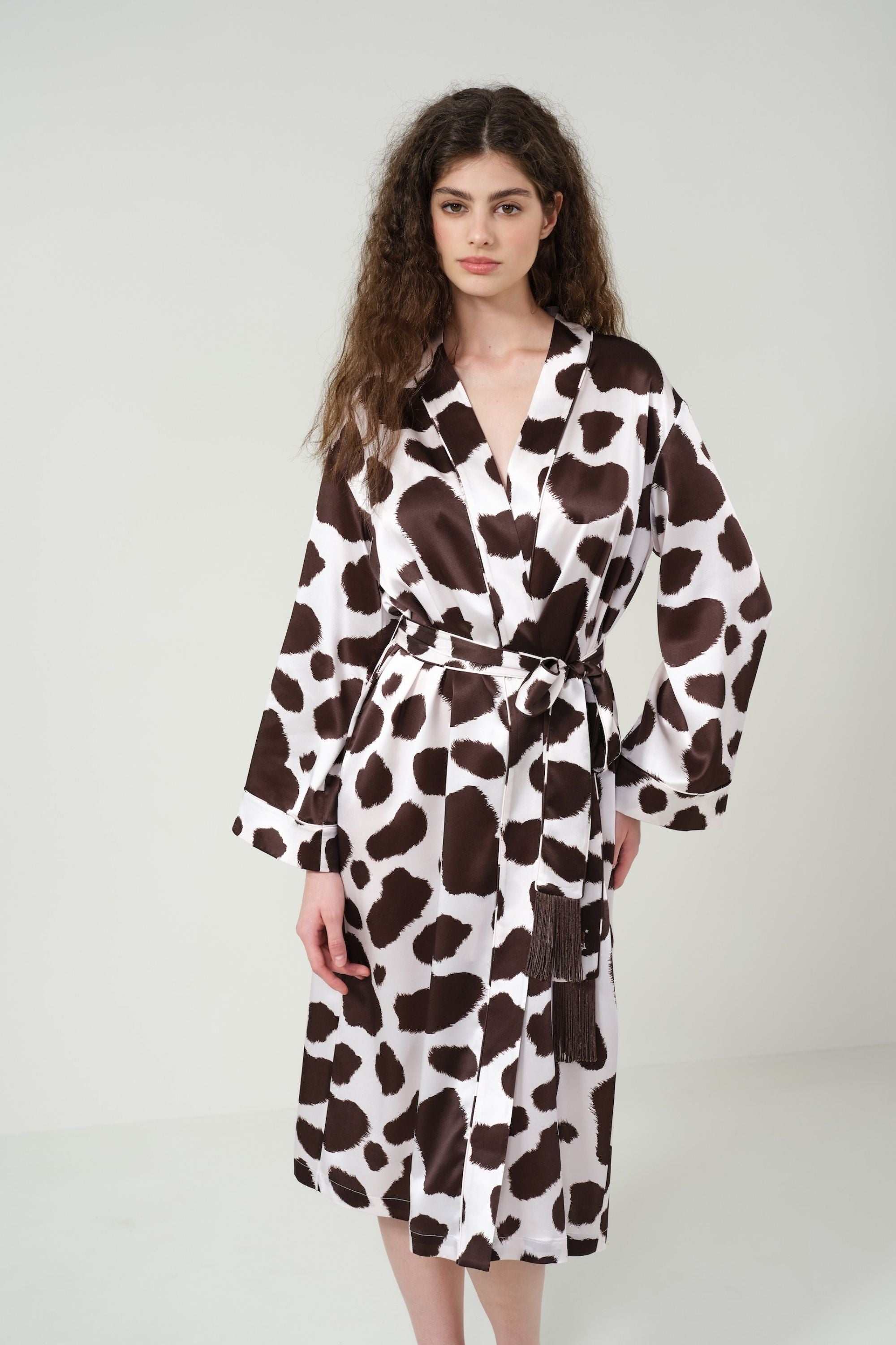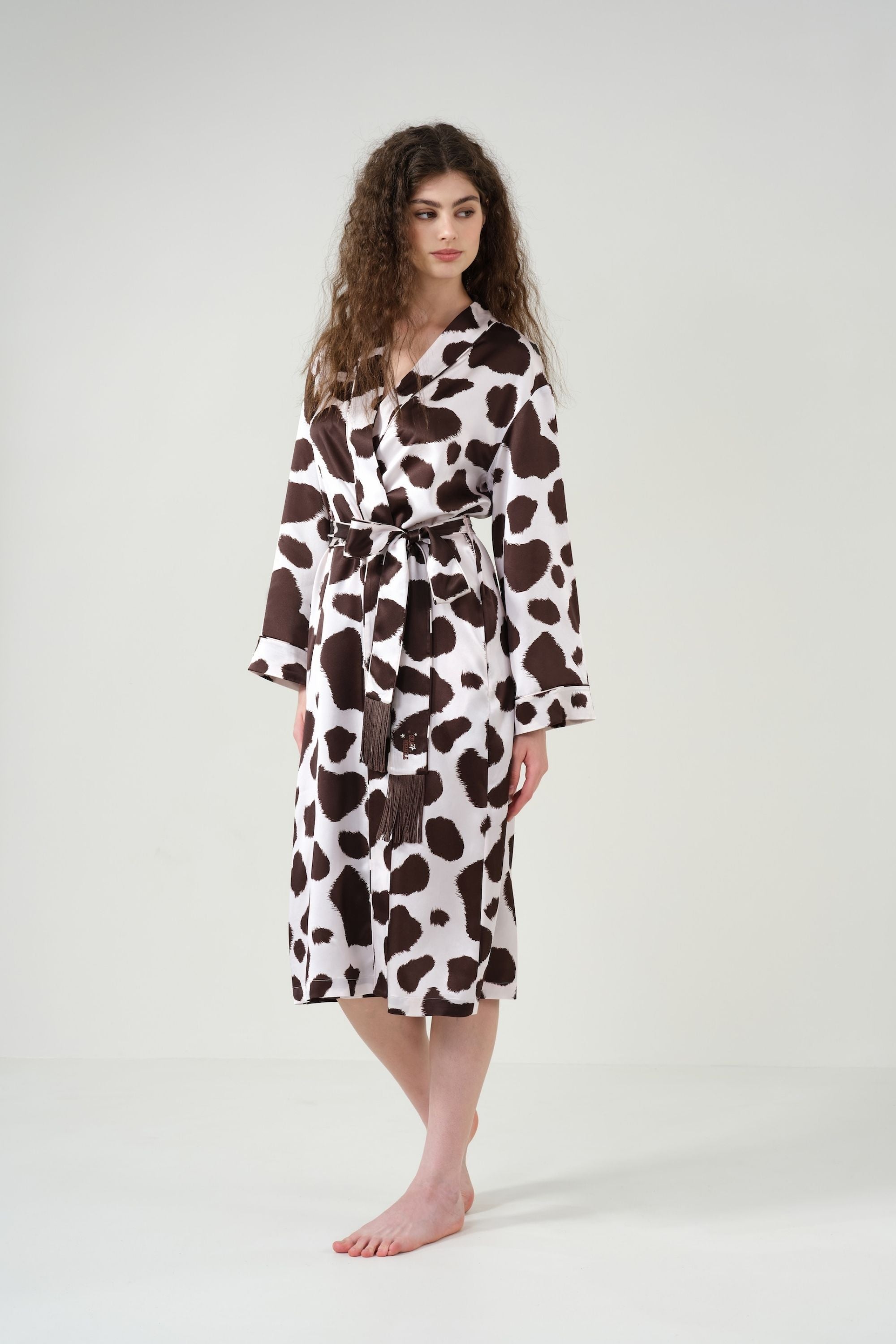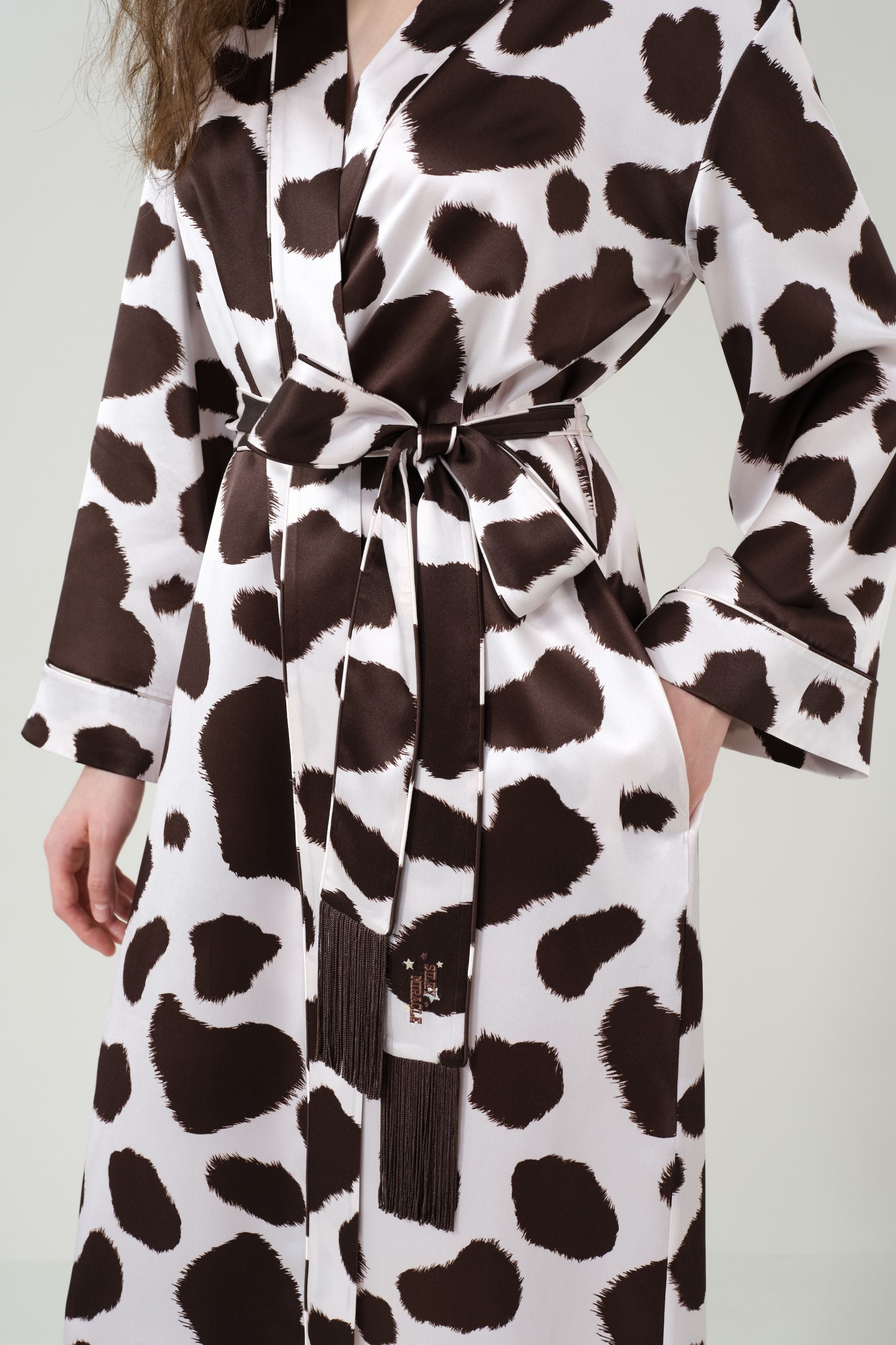 Inspired by the cowboy style, this robe brings vibrant colors, embroidery, and casual details like tassels and turquoise. The light pink cow print adds sweetness to the classic mid-length robe, paired with a fringe-embellished embroidered belt for both style and comfort.