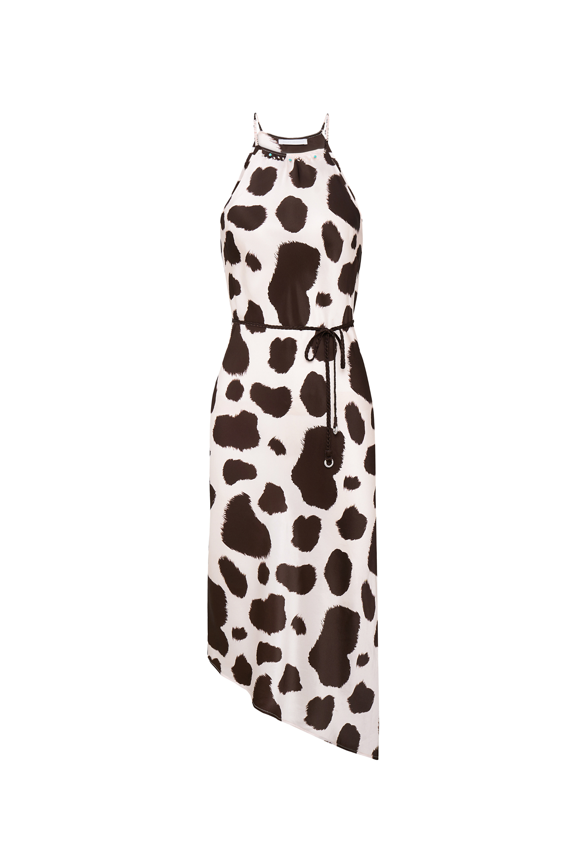 Inspired by the cowboy style, this dress features vibrant colors, embroidery, and casual details like tassels and turquoise. With pleated scooped shoulders, a sloping hemline, and a diamond-encrusted waistband.