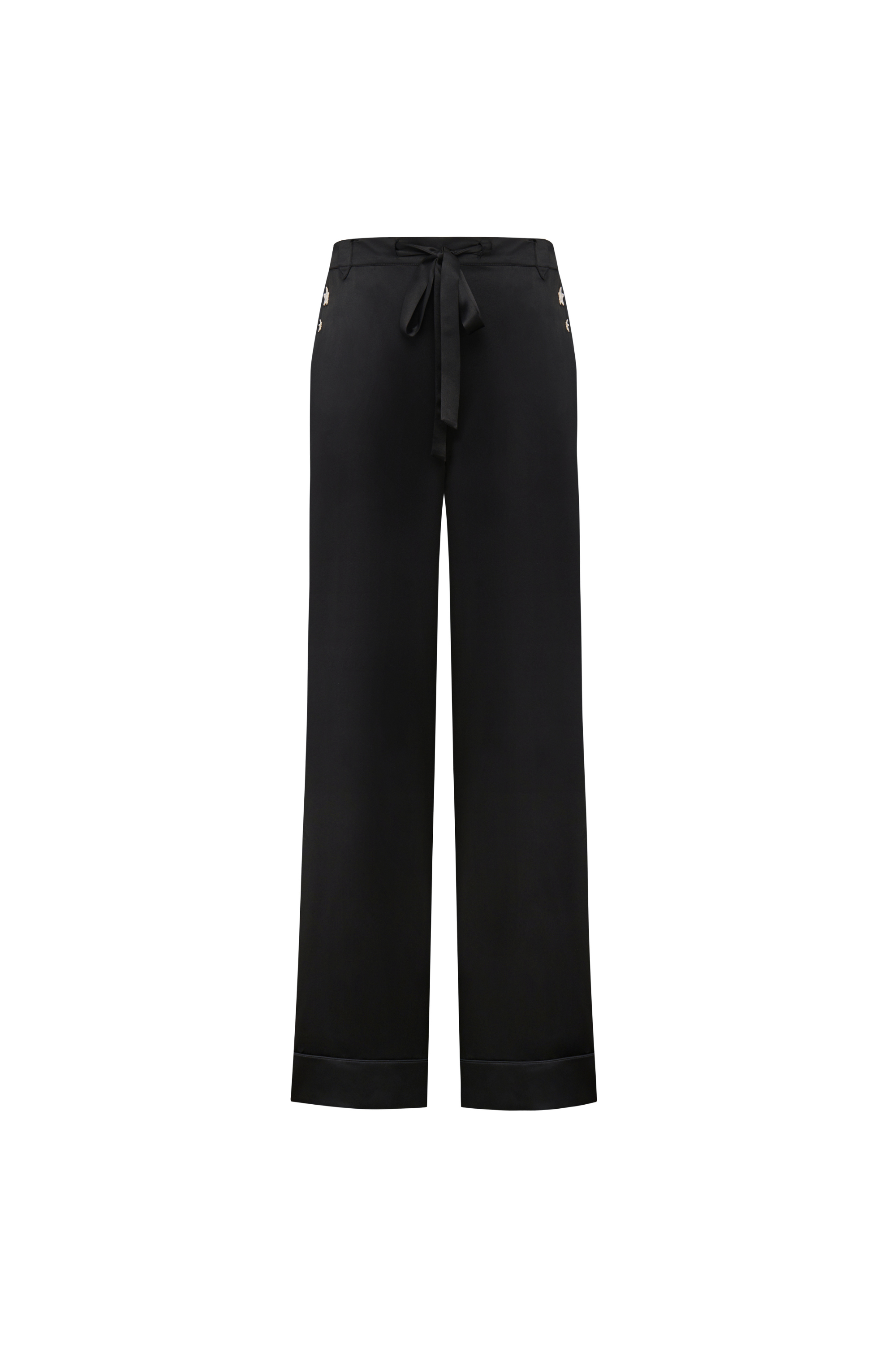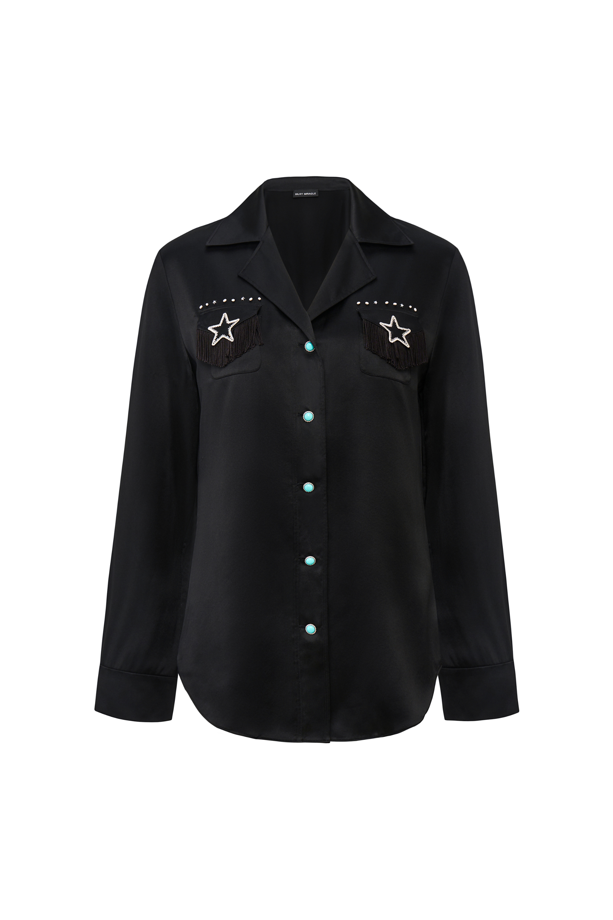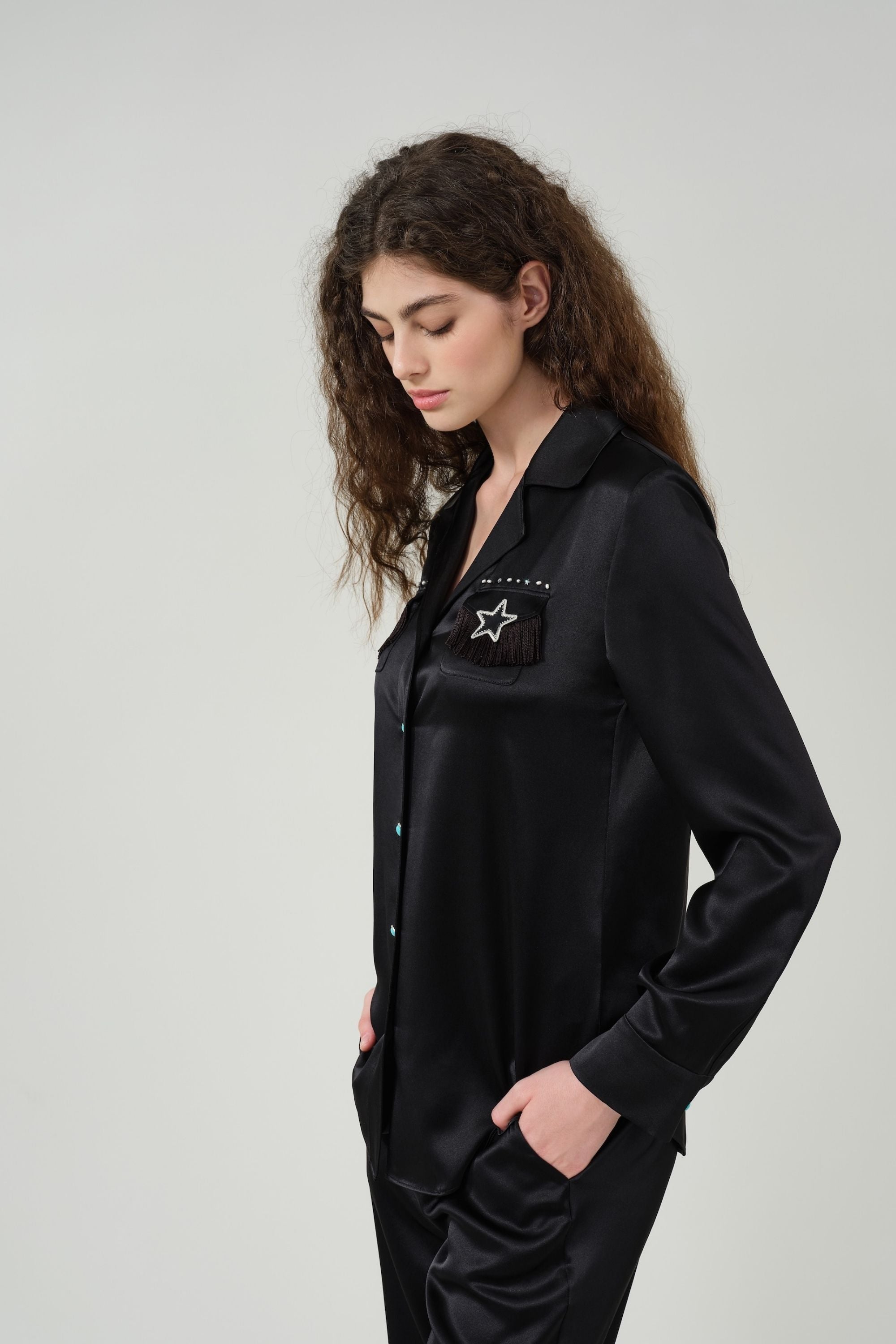 This pyjama set combines a relaxed, casual fit with exceptional comfort. The cowboy-inspired tasseled flap pockets are the focal point, featuring hand-beading, rhinestone-appliquéd pentagram embroidery, and turquoise buttons for a touch of surprise. Available in soft blue and cool black.