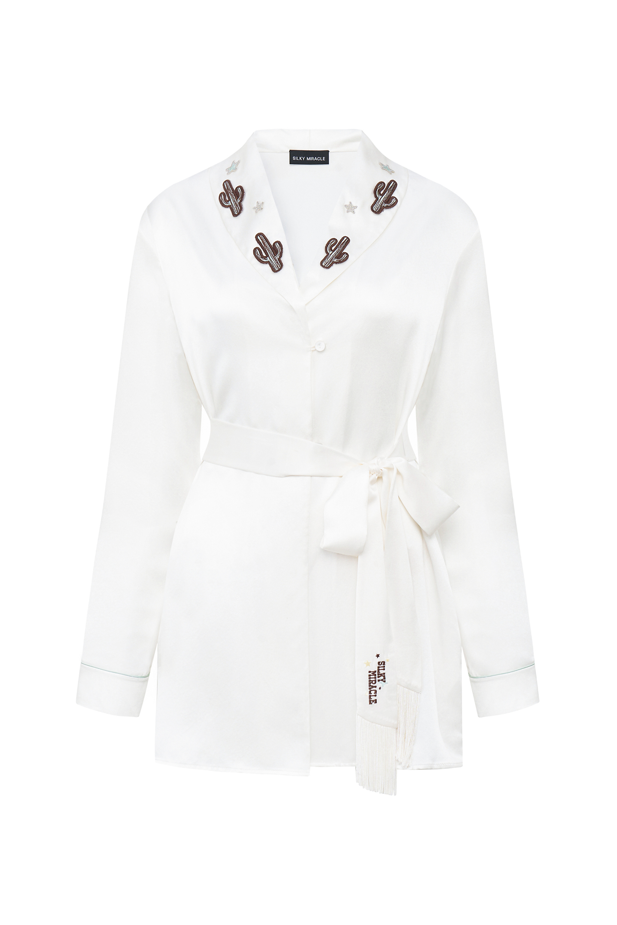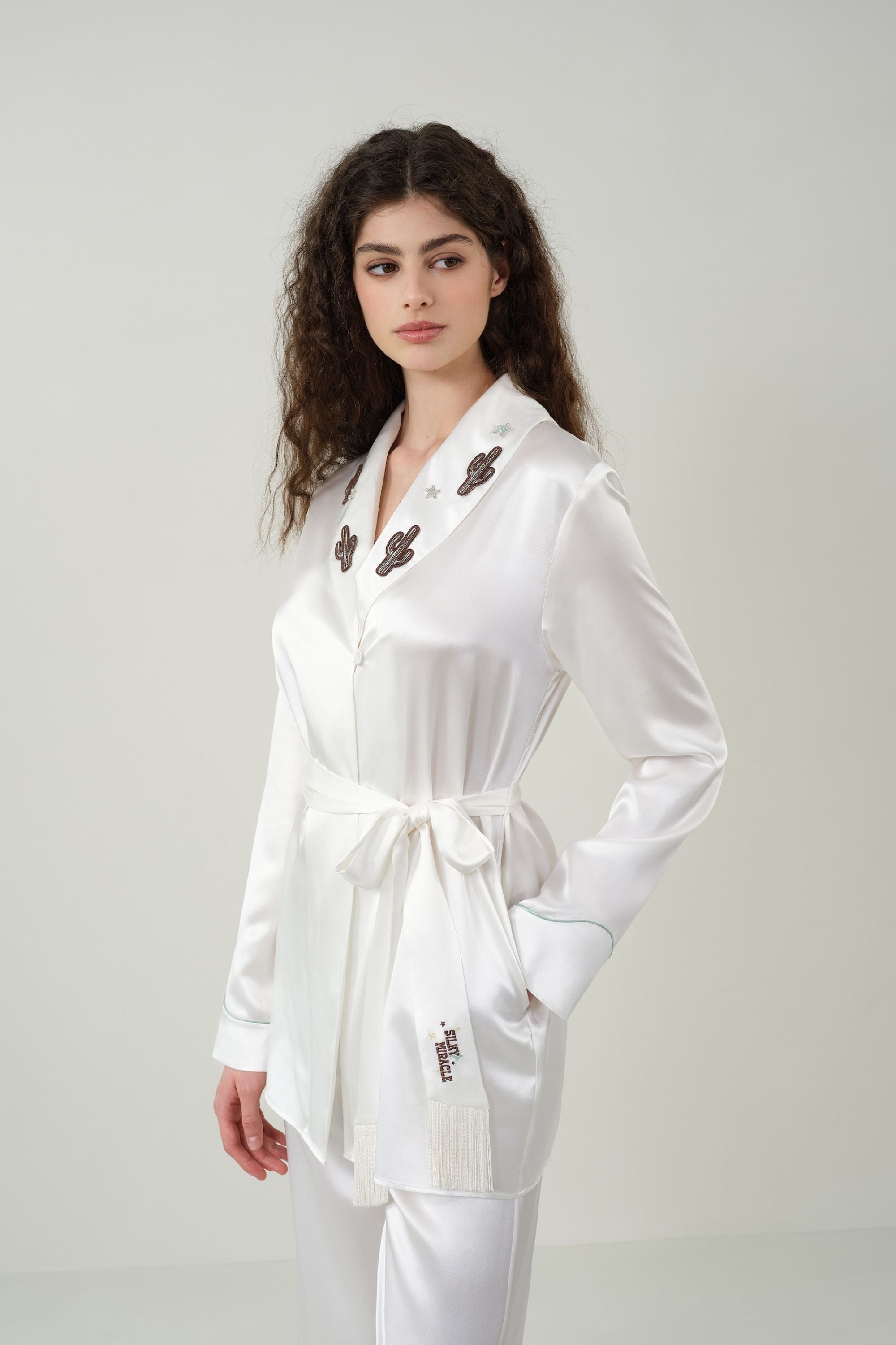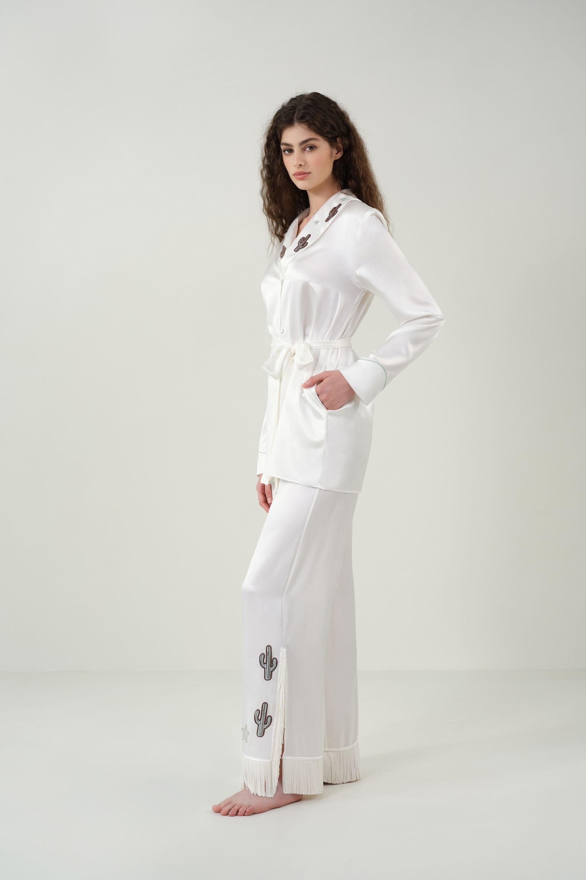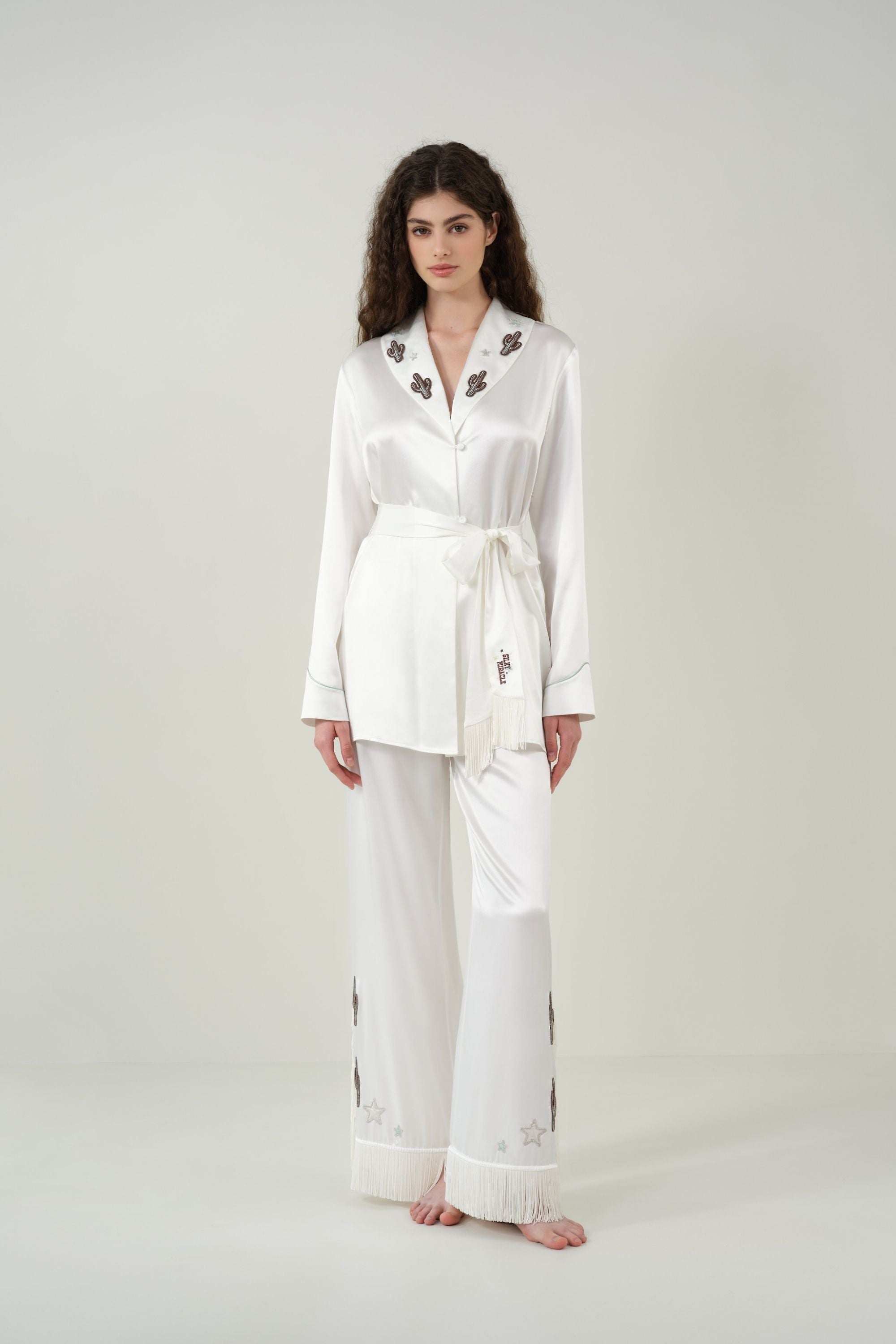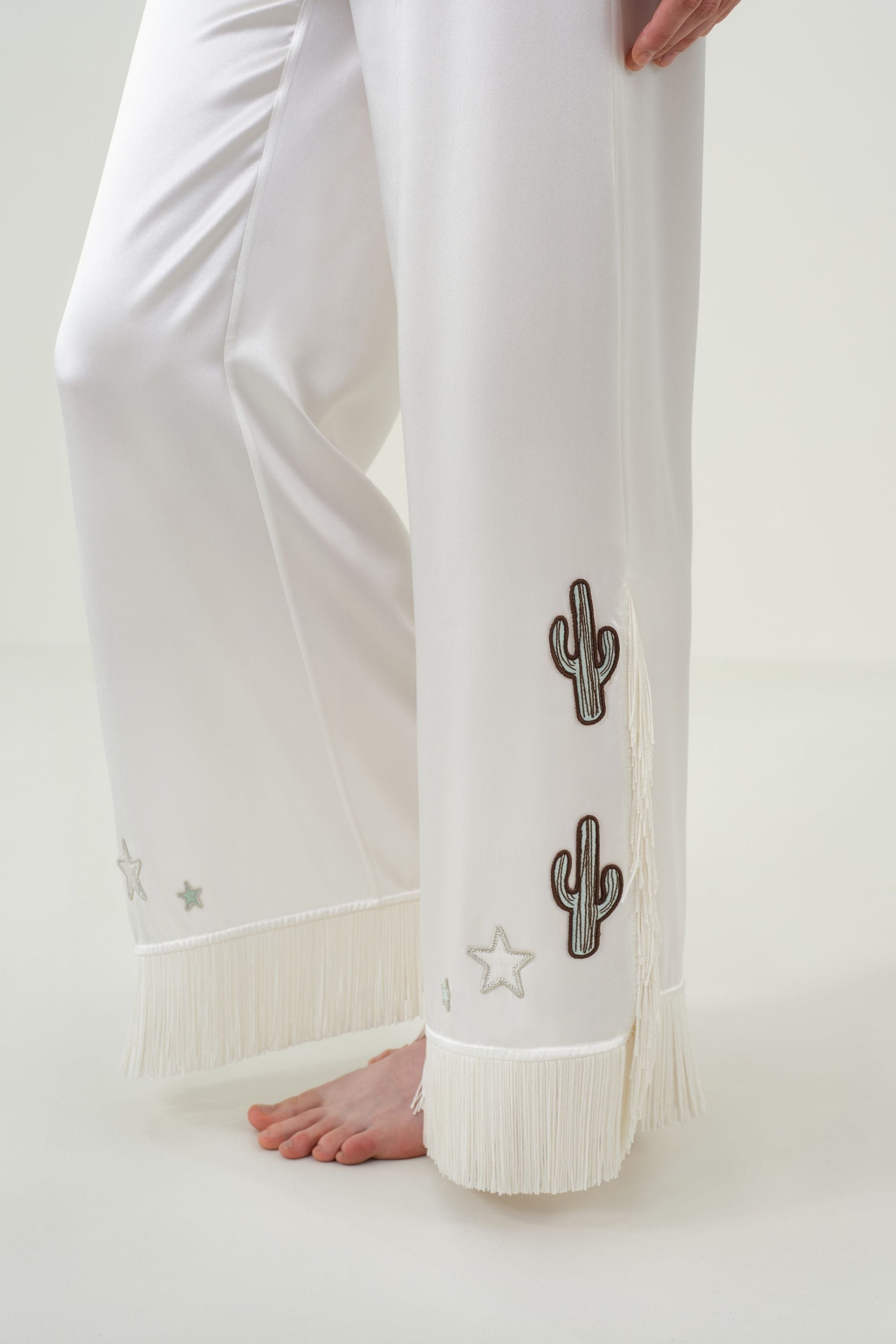 With a relaxed fit and waist tie, this white silk piece doubles as a nightgown. It features colorful cactus and star appliqué, an embroidered logo, and slit wide-leg pants with tassel trim for added movement.