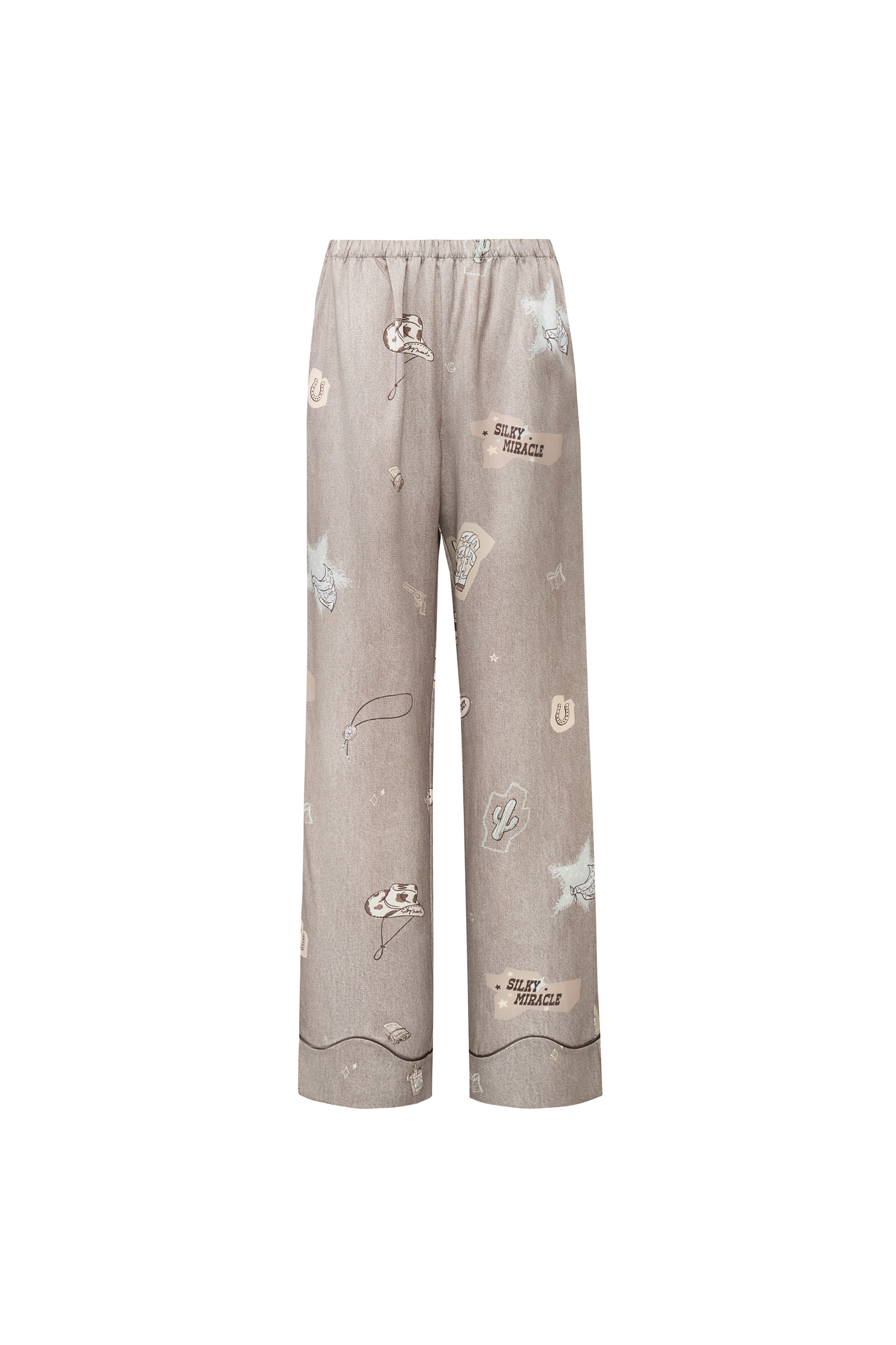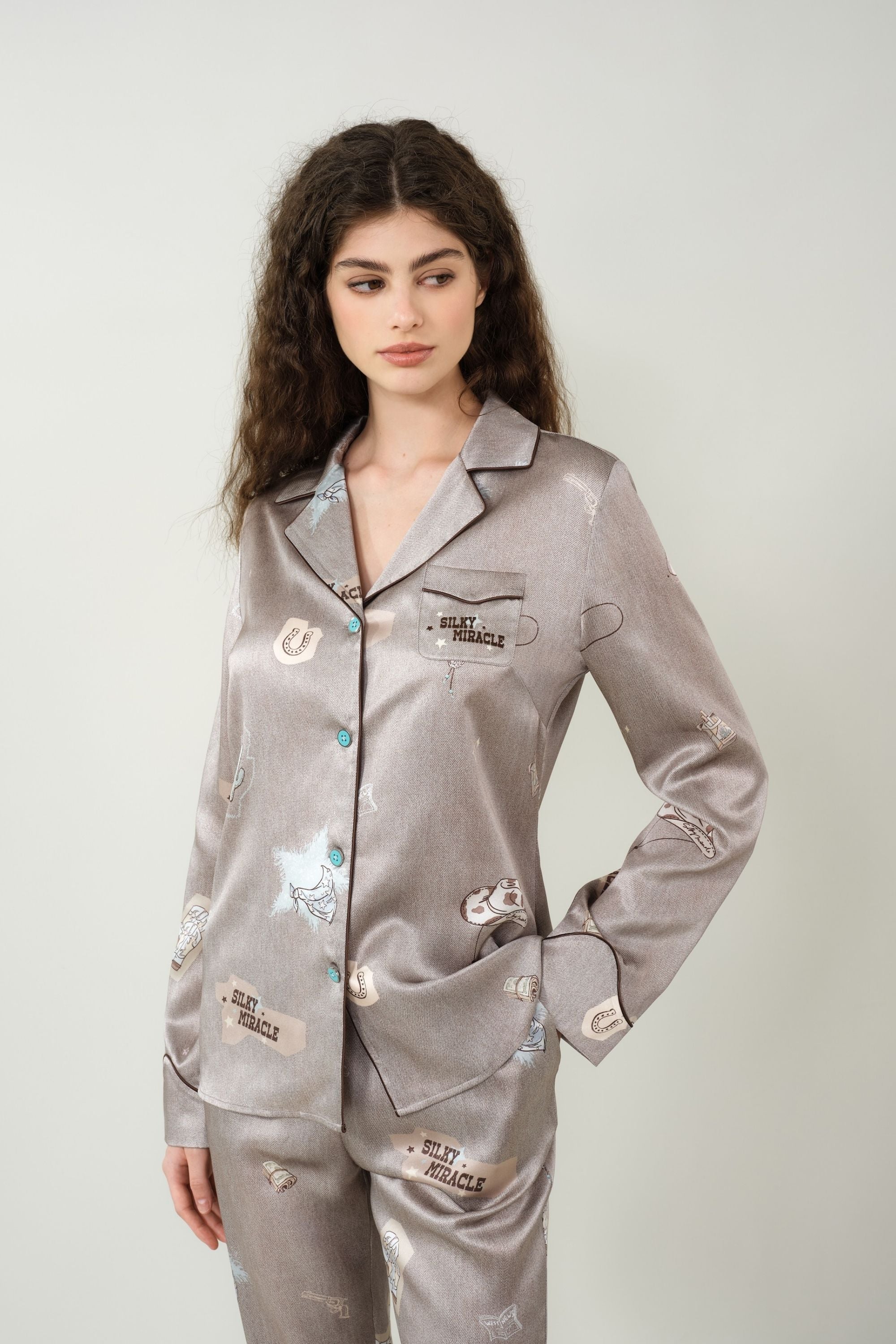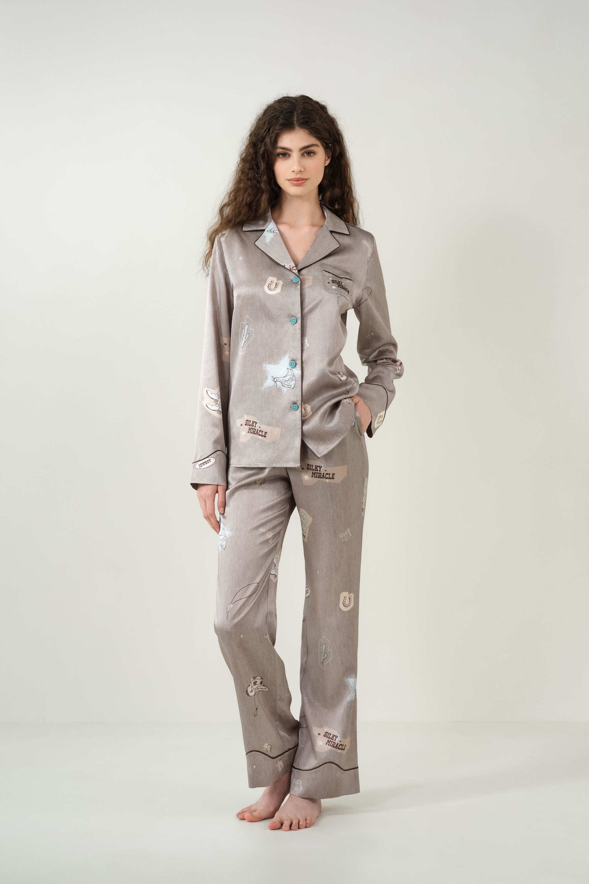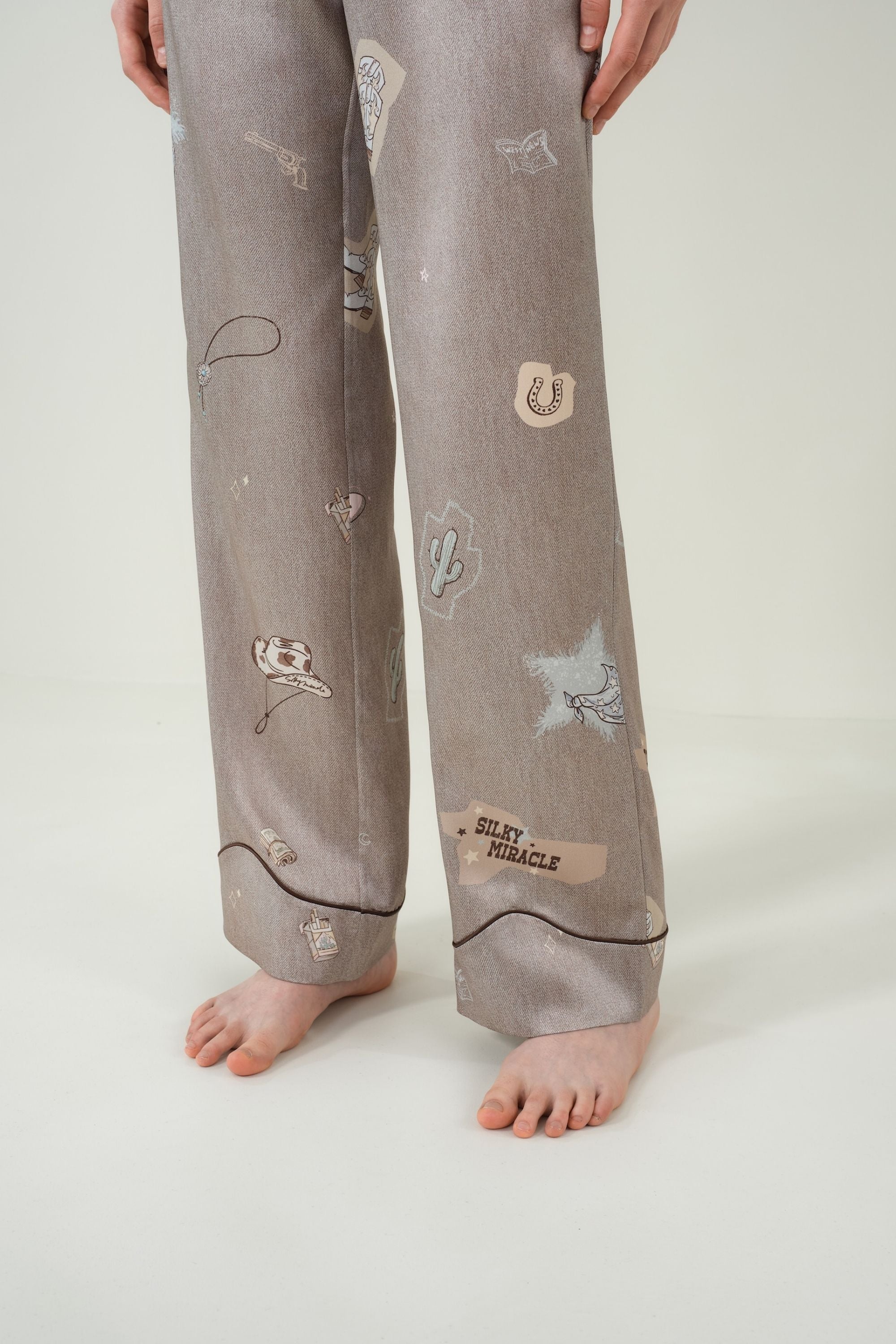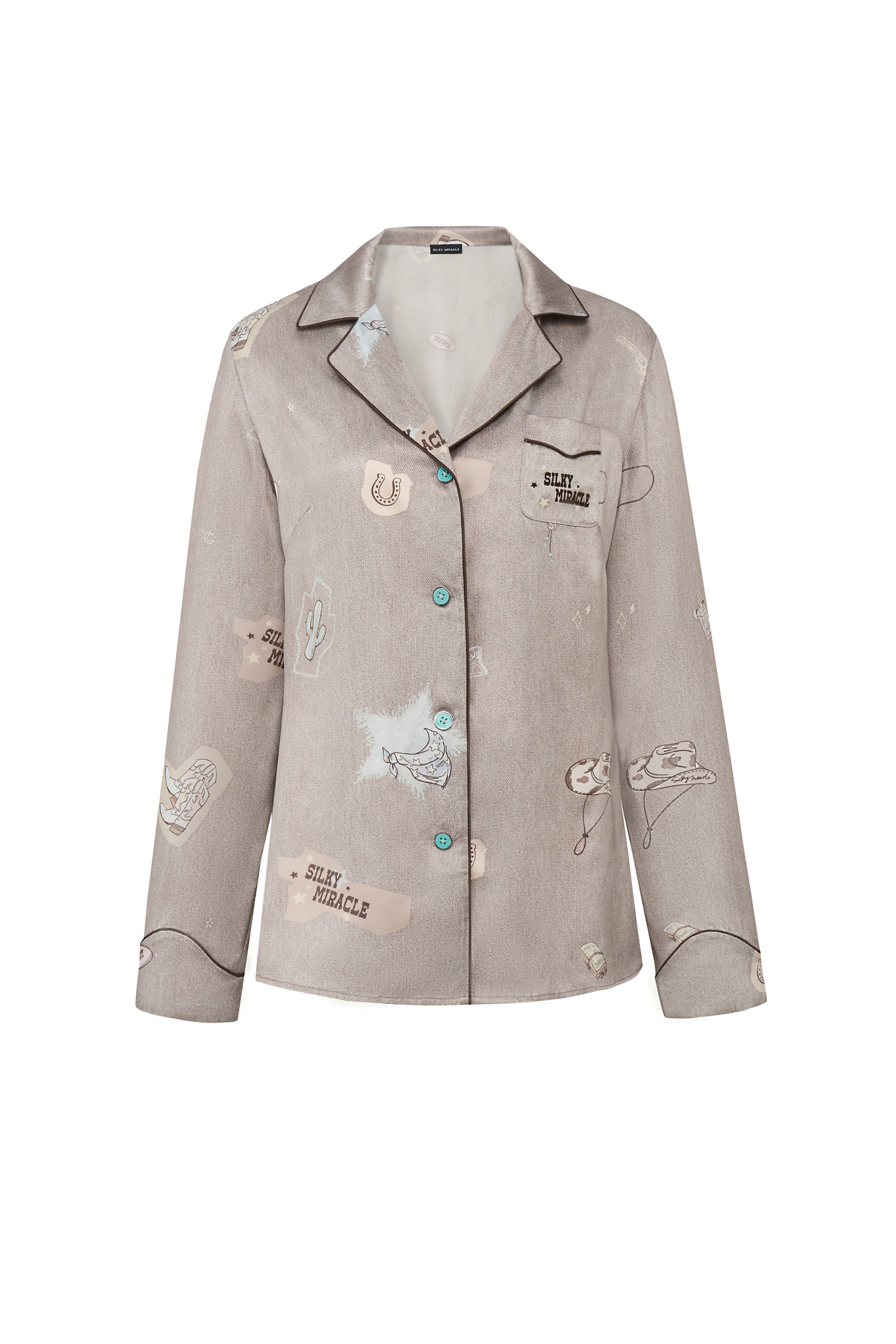 This classic pajama shape is infused with playful Western cowboy elements, featuring curved cuffs and split hems. The design is enhanced with a flocked chest pocket logo, turquoise buttons, and vibrant, energetic details.