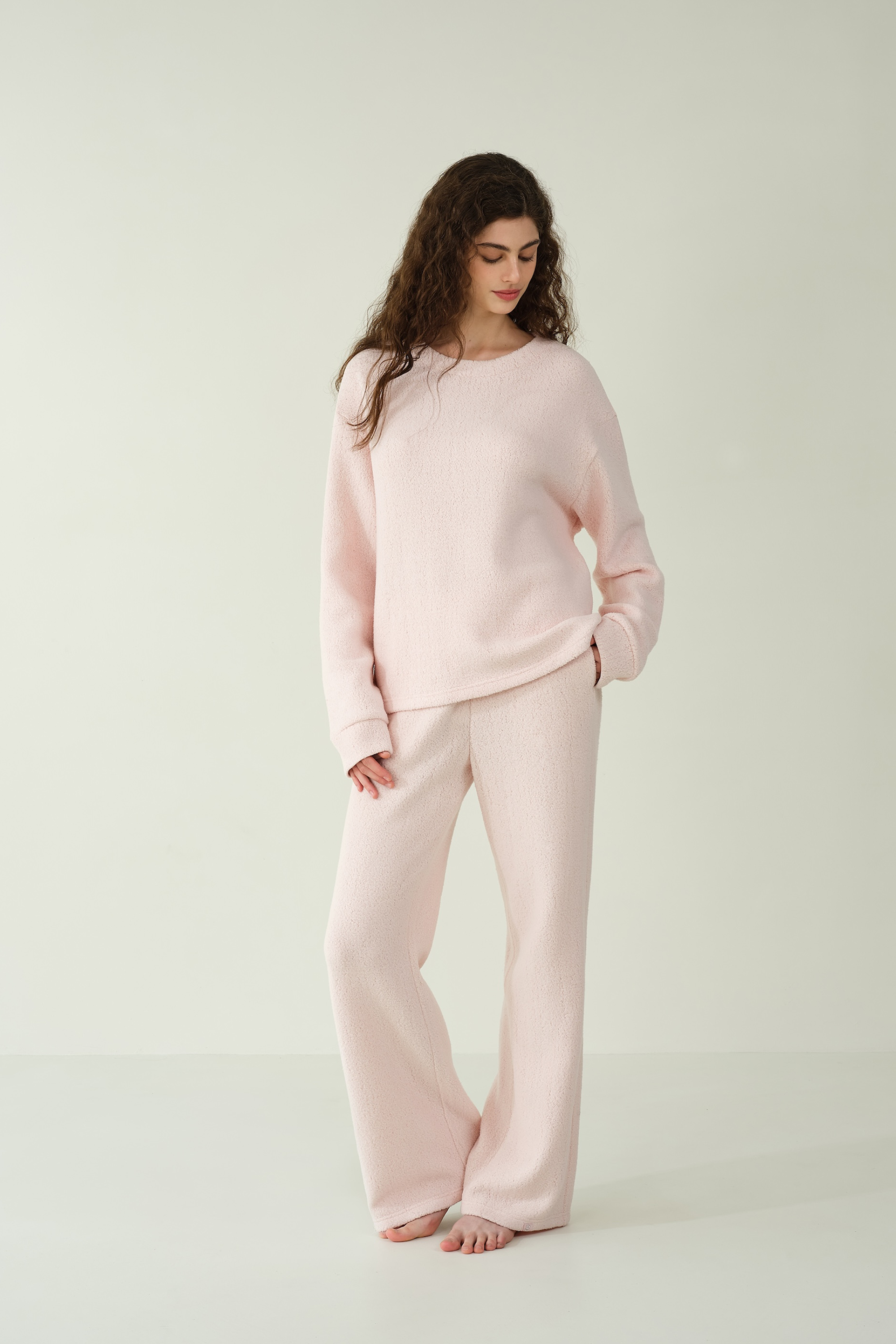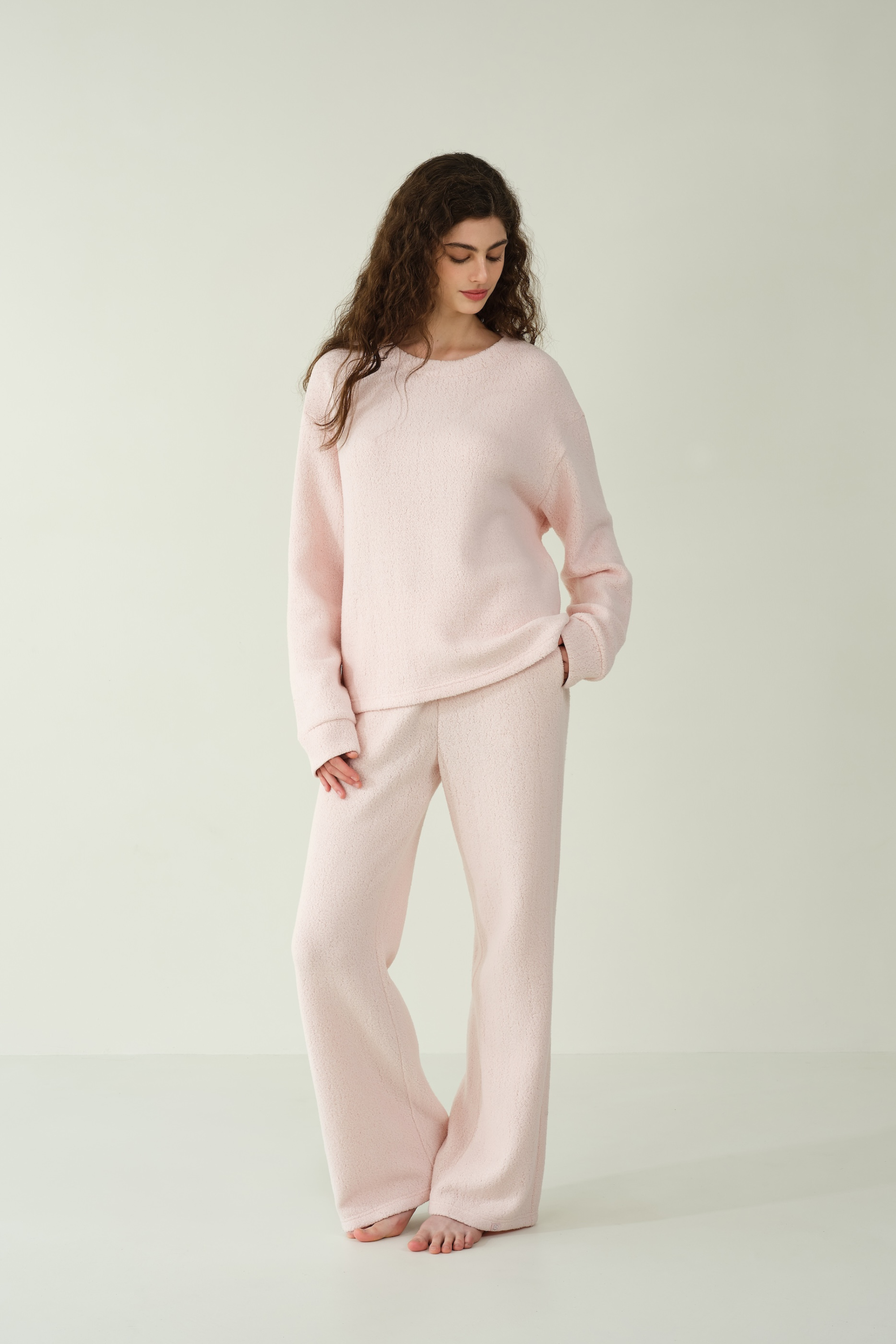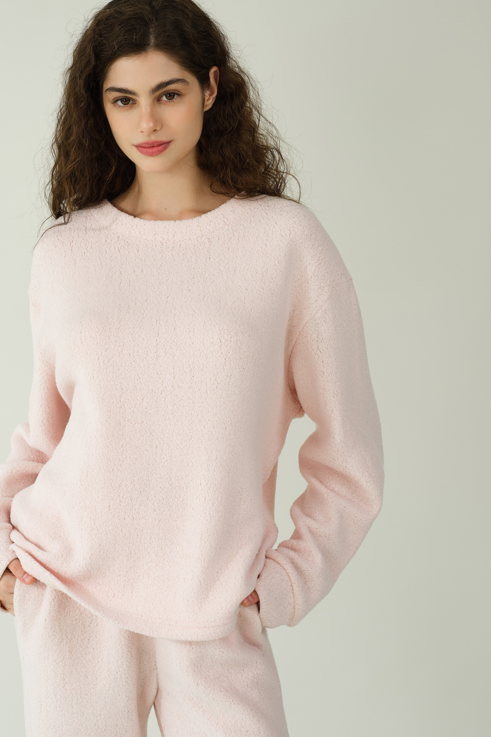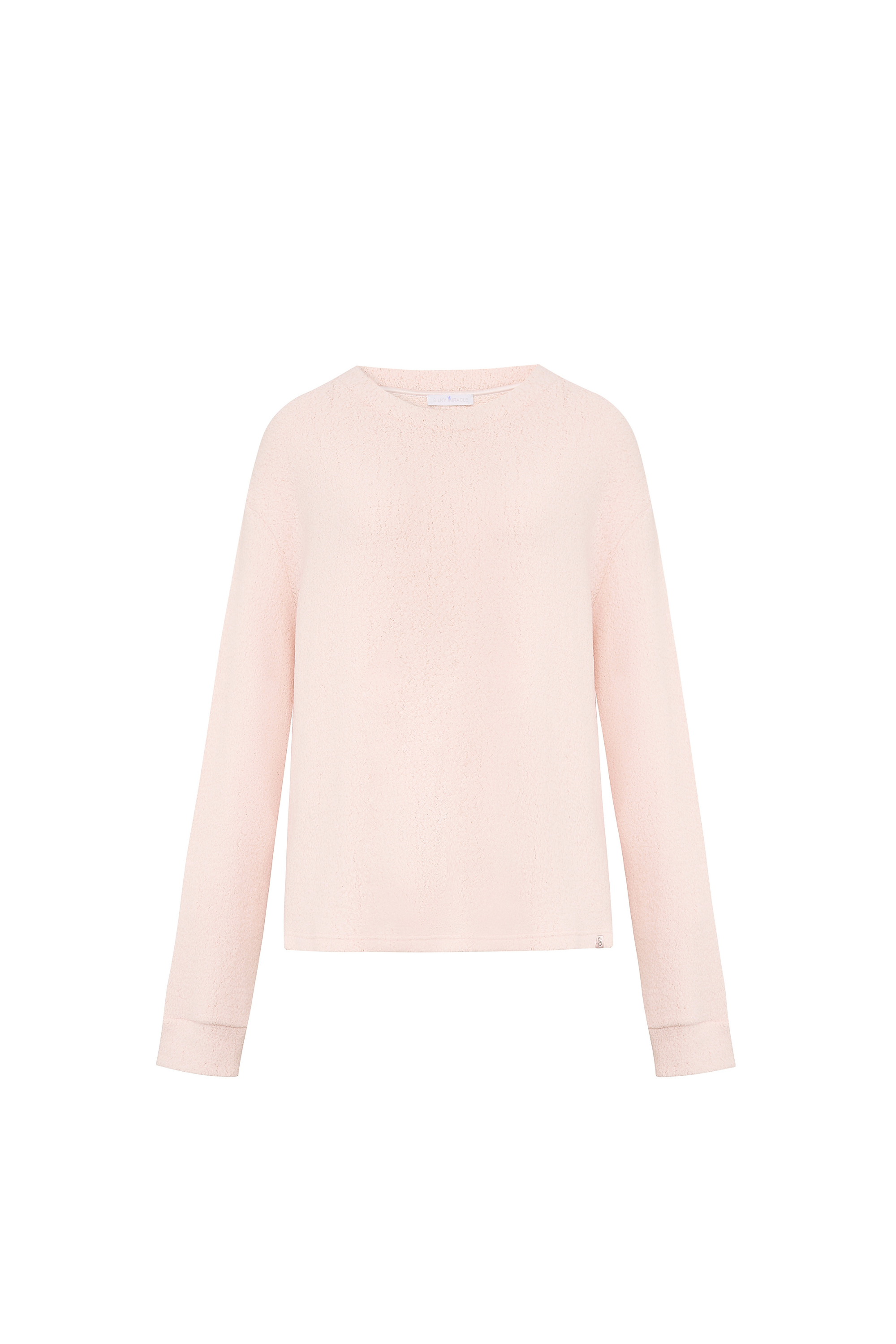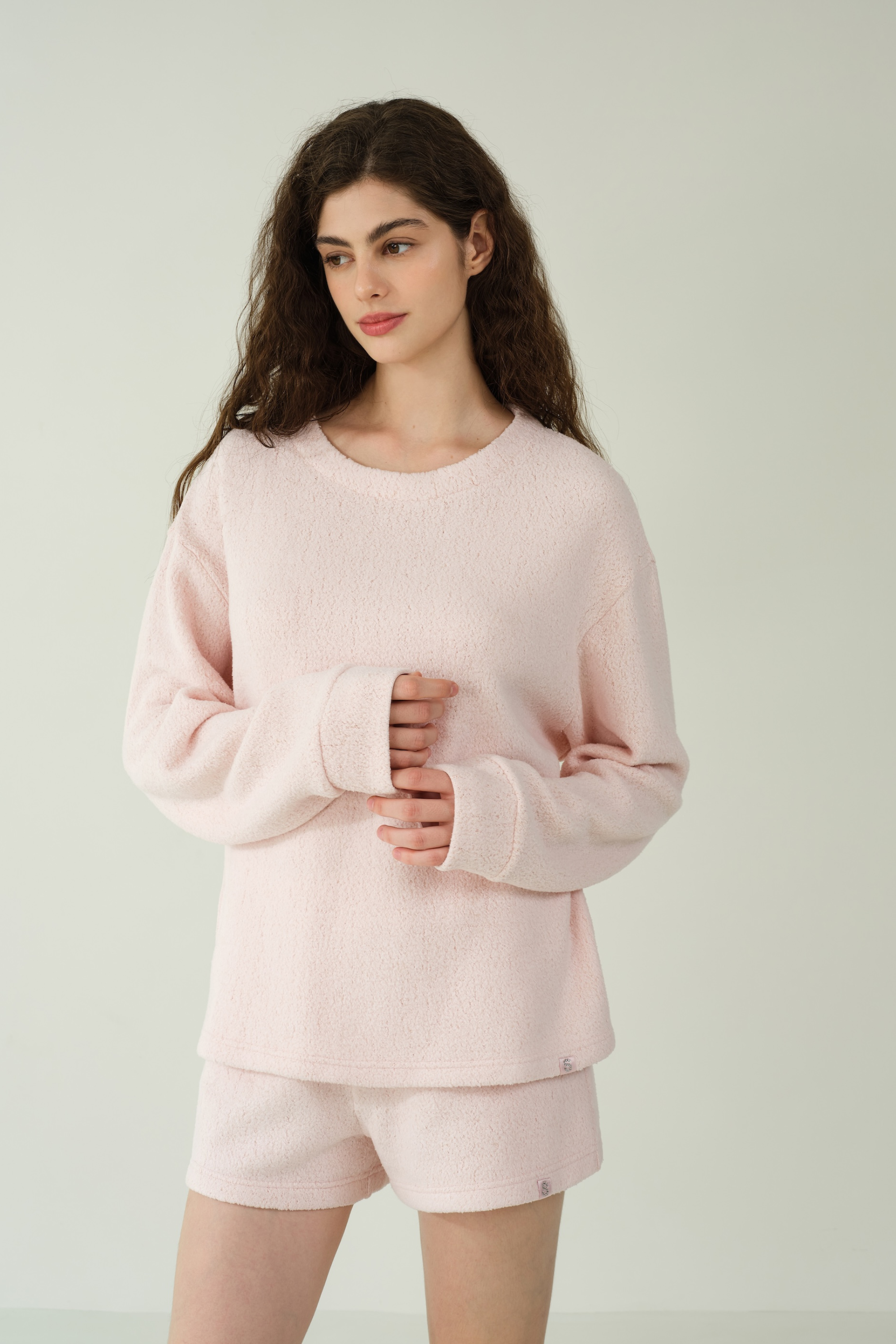 This loose-fitting basic sweater offers versatile, cozy comfort for the home, featuring silk-lined cuffs for a subtle touch of elegance, and a bottom hem adorned with an S-label rhinestone decoration for added charm.