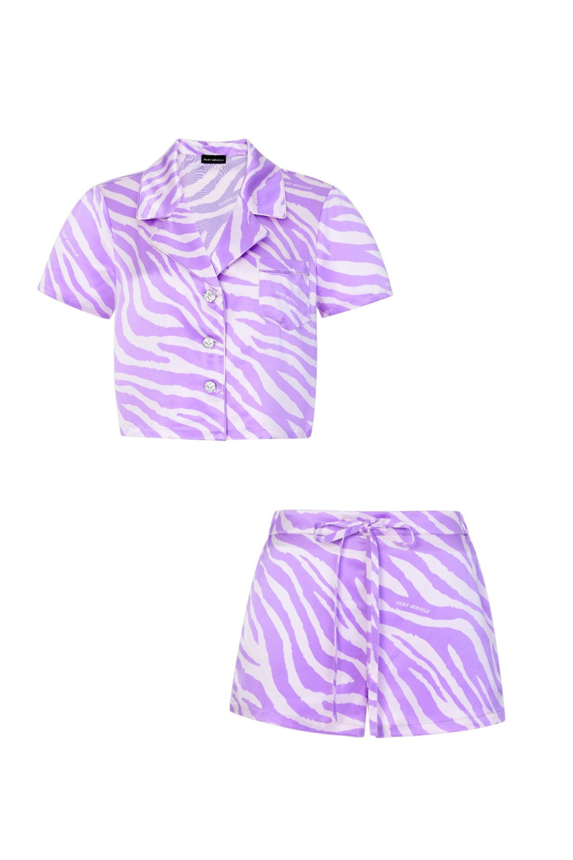 This Zebra Print Crystal Purple Pyjama Set is crafted from Mulberry Silk for a trendy and comfortable loungewear fit. It features Swarovski crystal buttons, fitted shorts, and a cropped shirt.