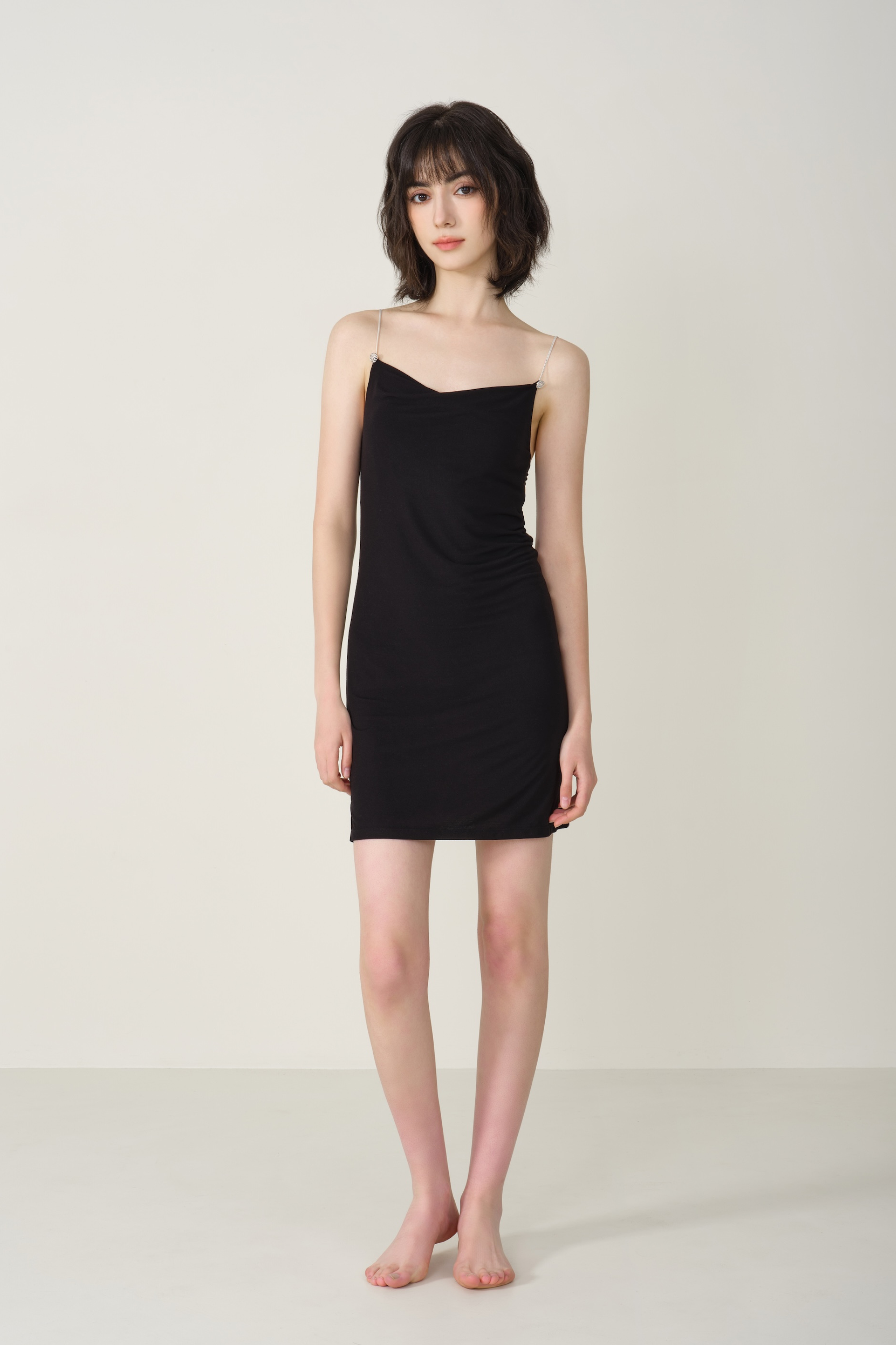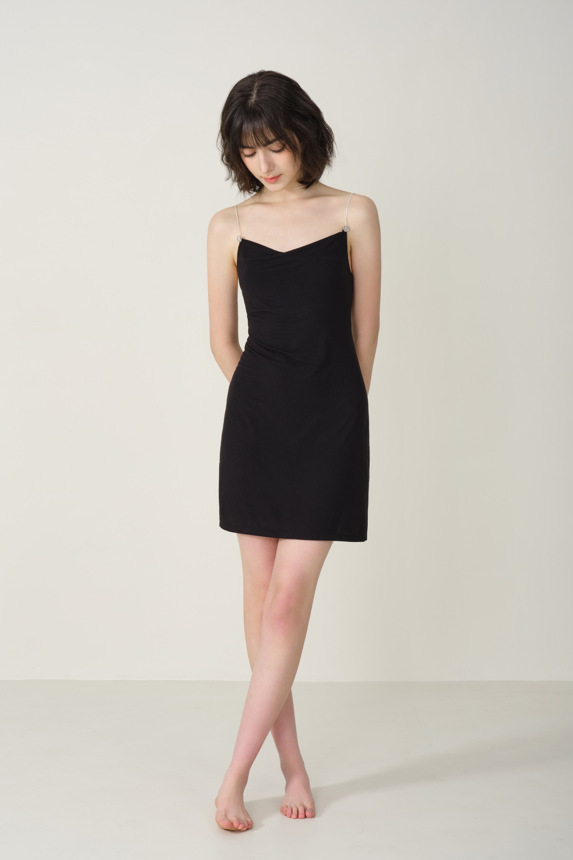 This classic swing neckline dress features delicate shoulder straps adorned with diamond-like needlework and diamond-encrusted s-bar buttons, adding a luxurious touch. Crafted from skin-friendly Portuguese modal silk, it offers an inclusive, comfortable feel, setting it apart from traditional silk textures.