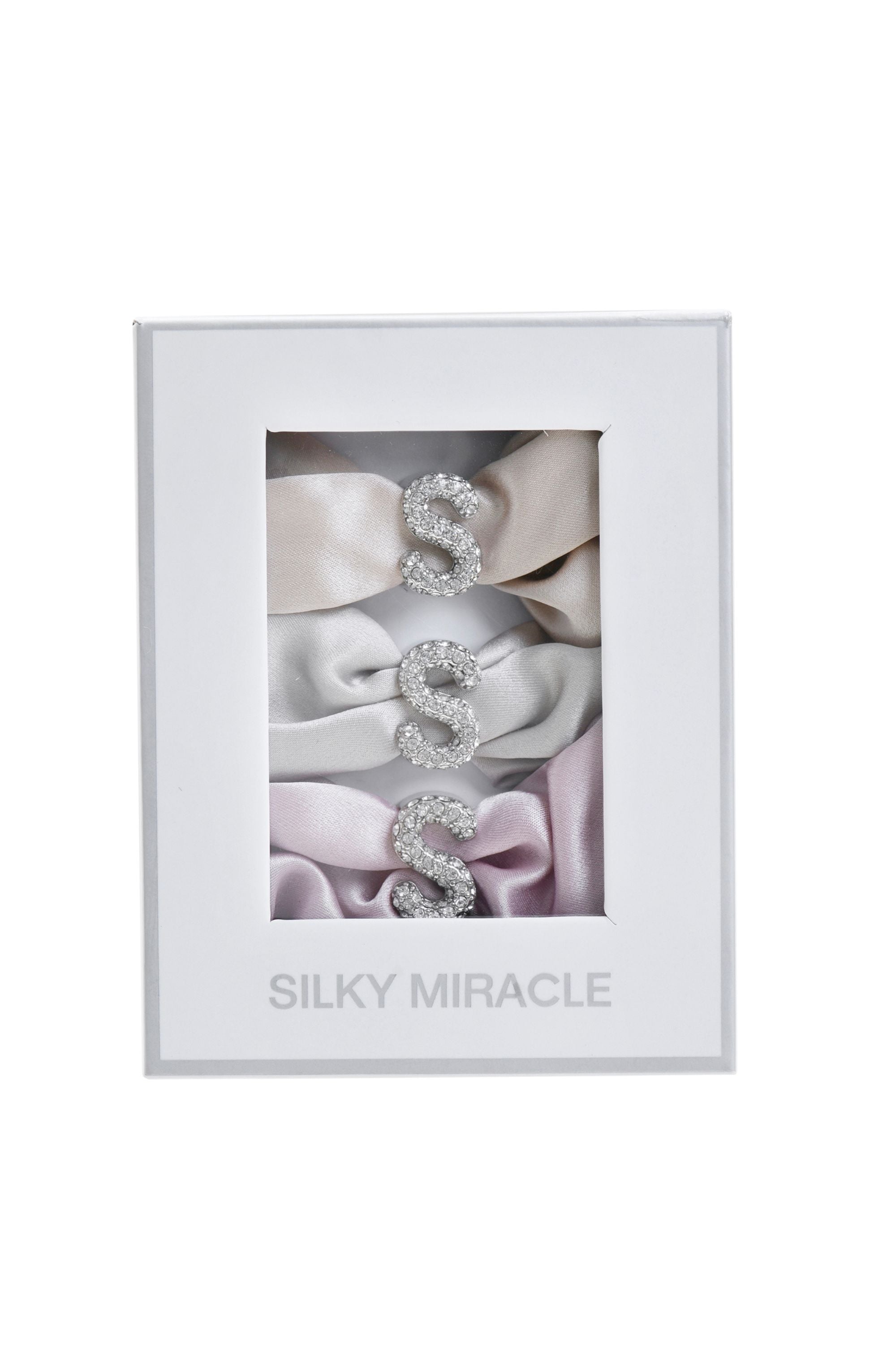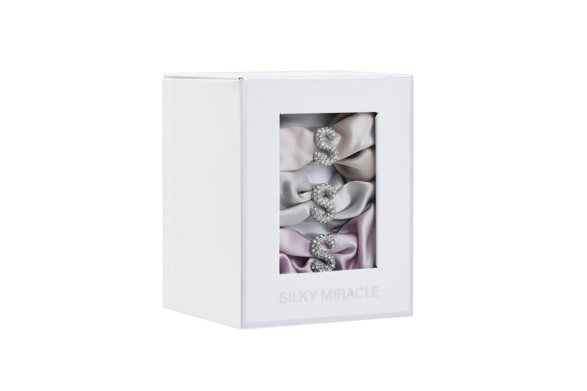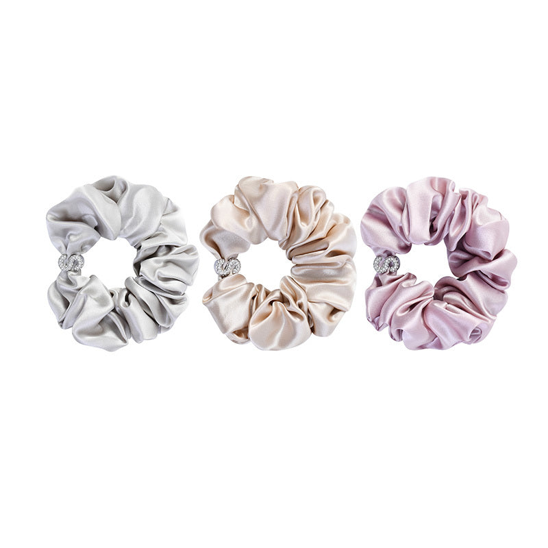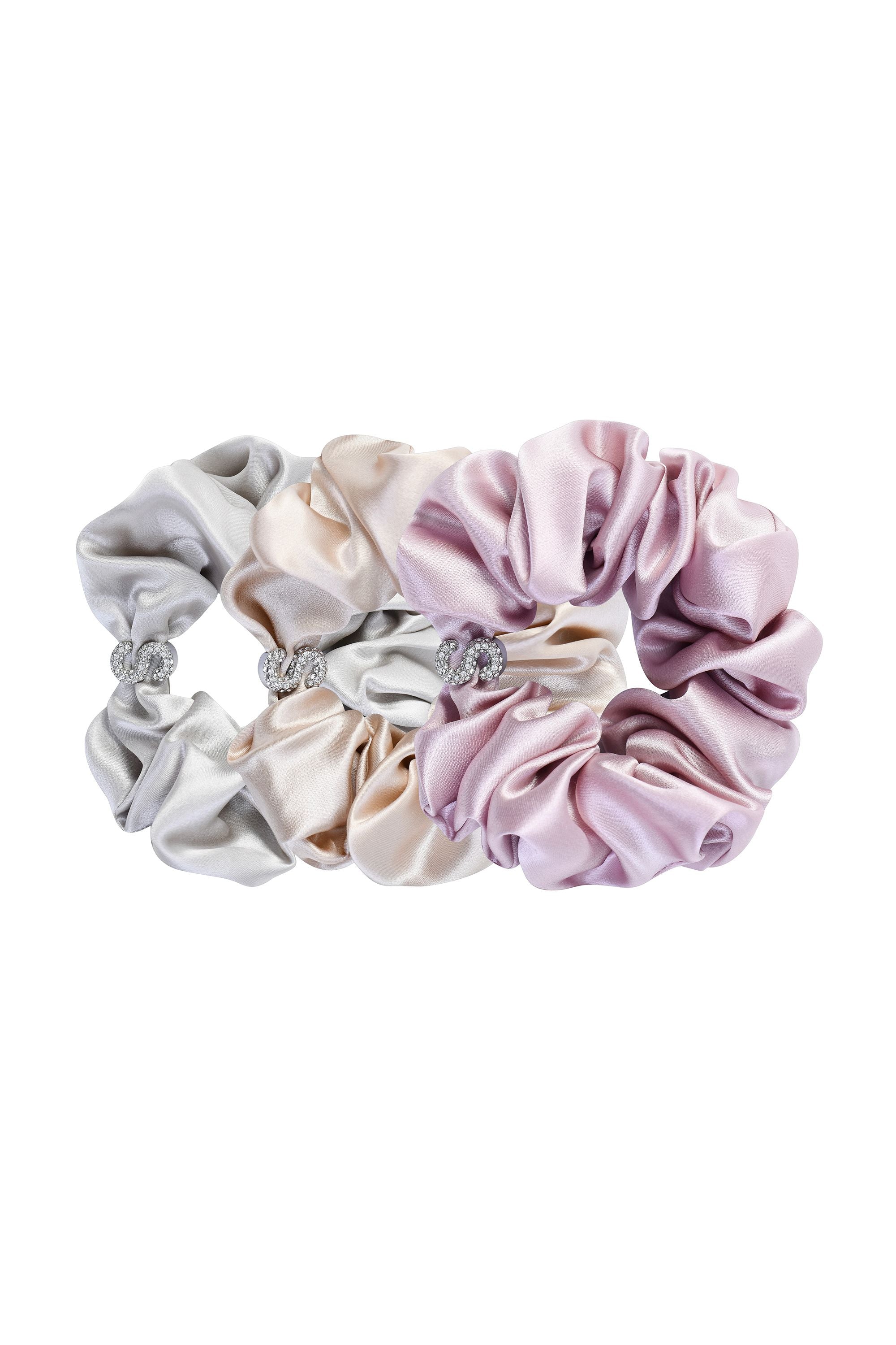 A set of three scrunchies with three shades of nude and grey. These scrunchies are cut from high-quality silk and detailed with a Swarovski crystal on the side.