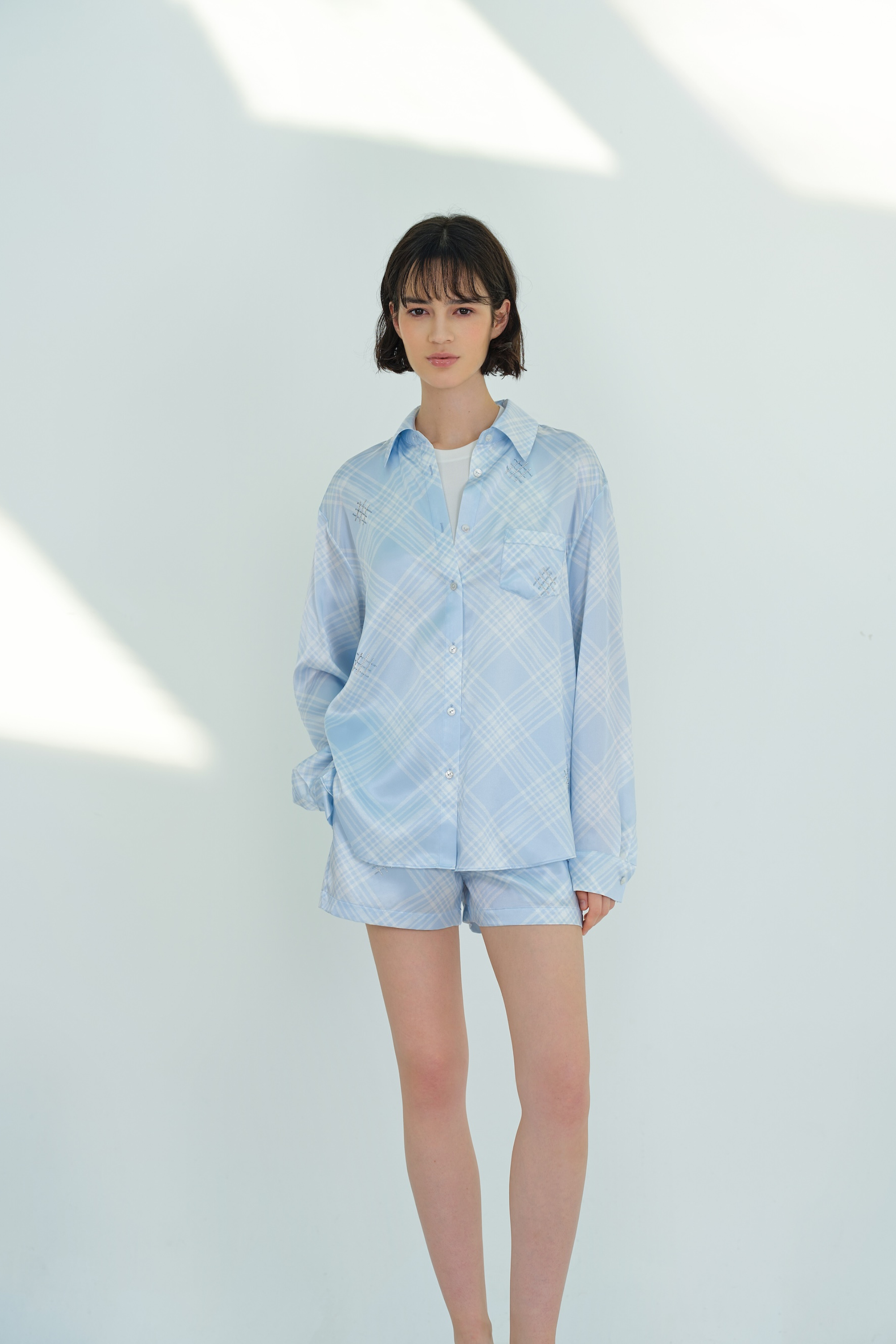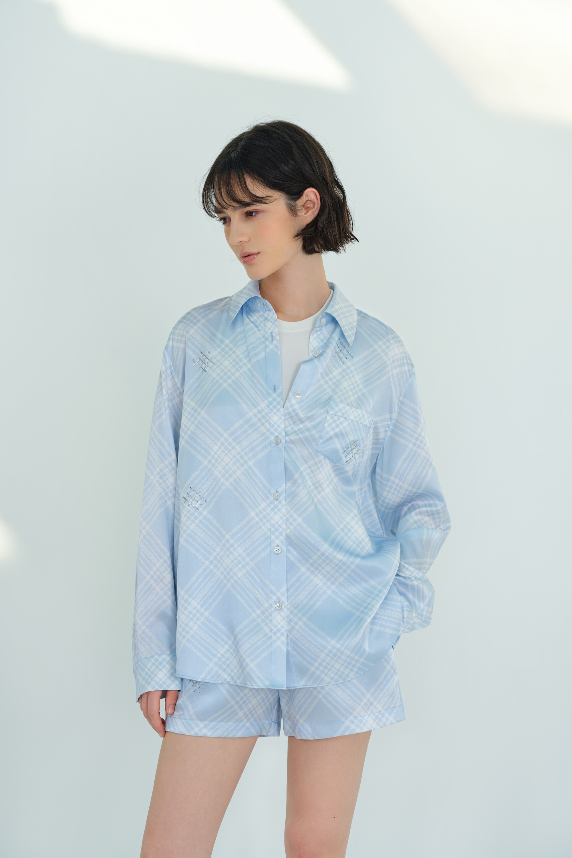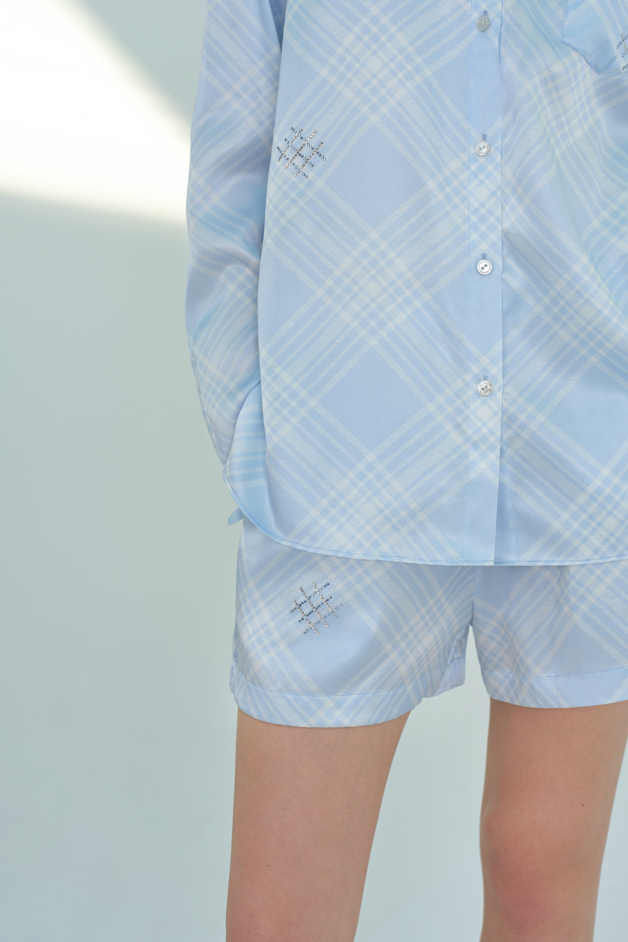 Introducing the FREE Series Checked Silk Shorts. Fresh and natural, it invites you to embrace the joys of summer with spontaneity. Adorned with Swarovski crystals, the versatile shorts pairs perfectly with it's matching shirt.