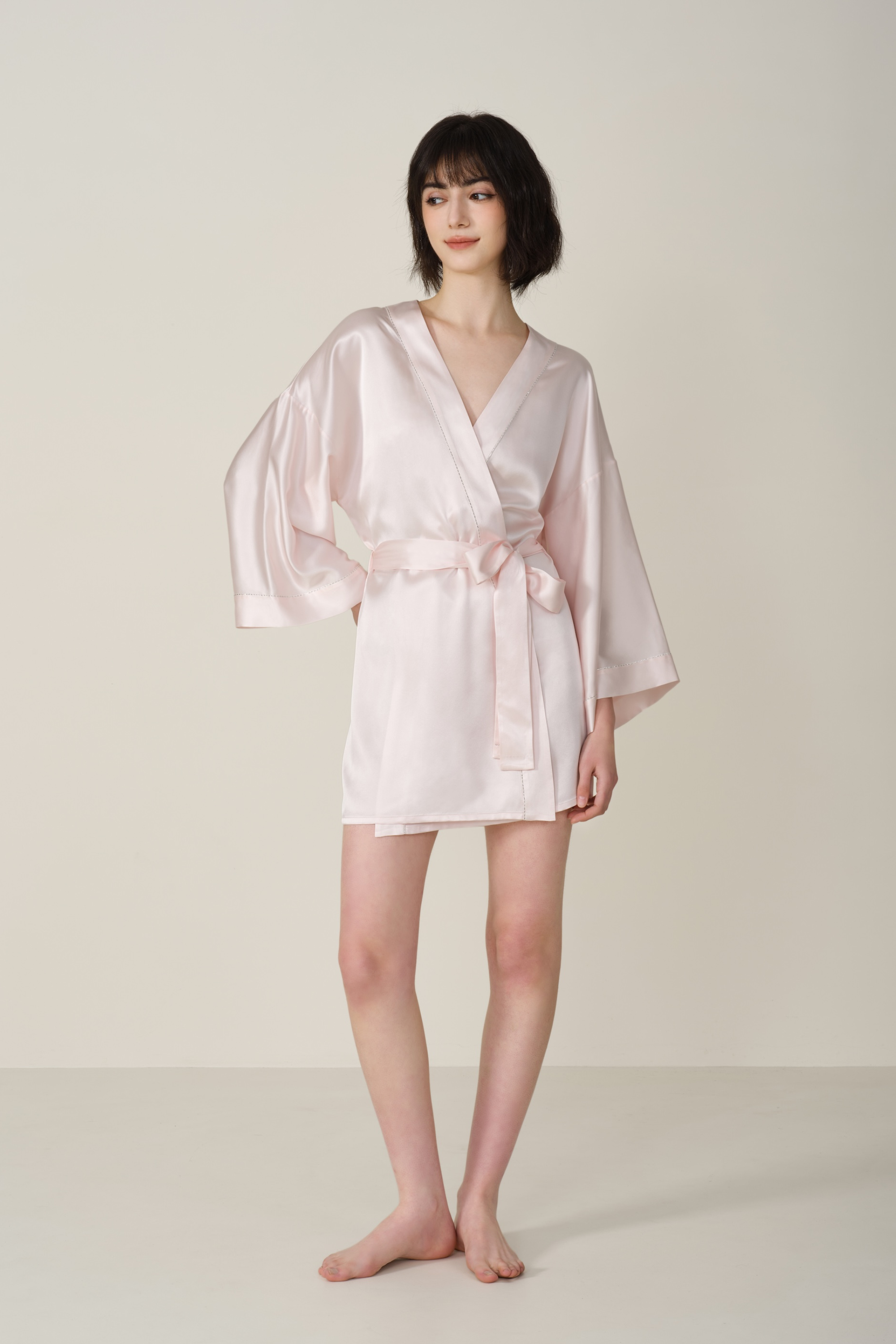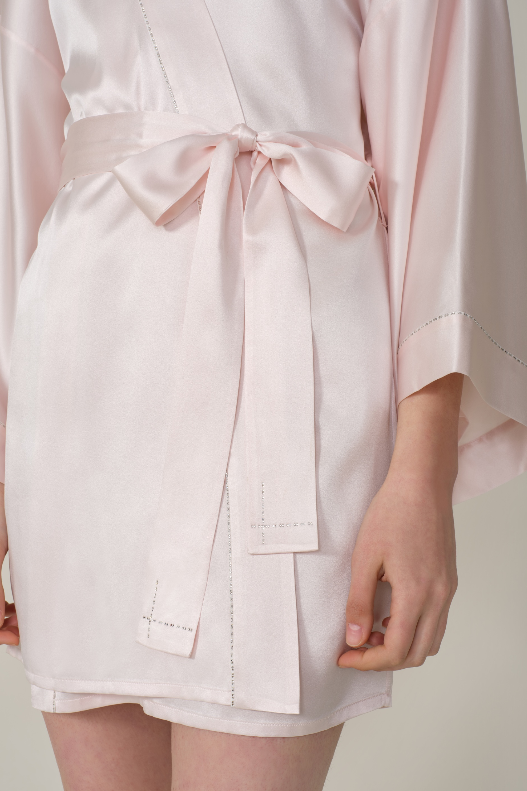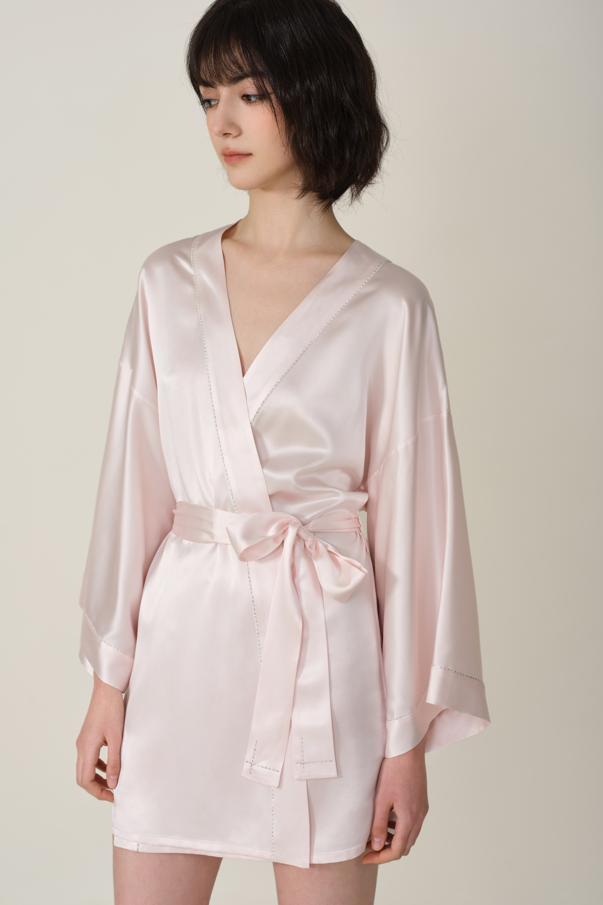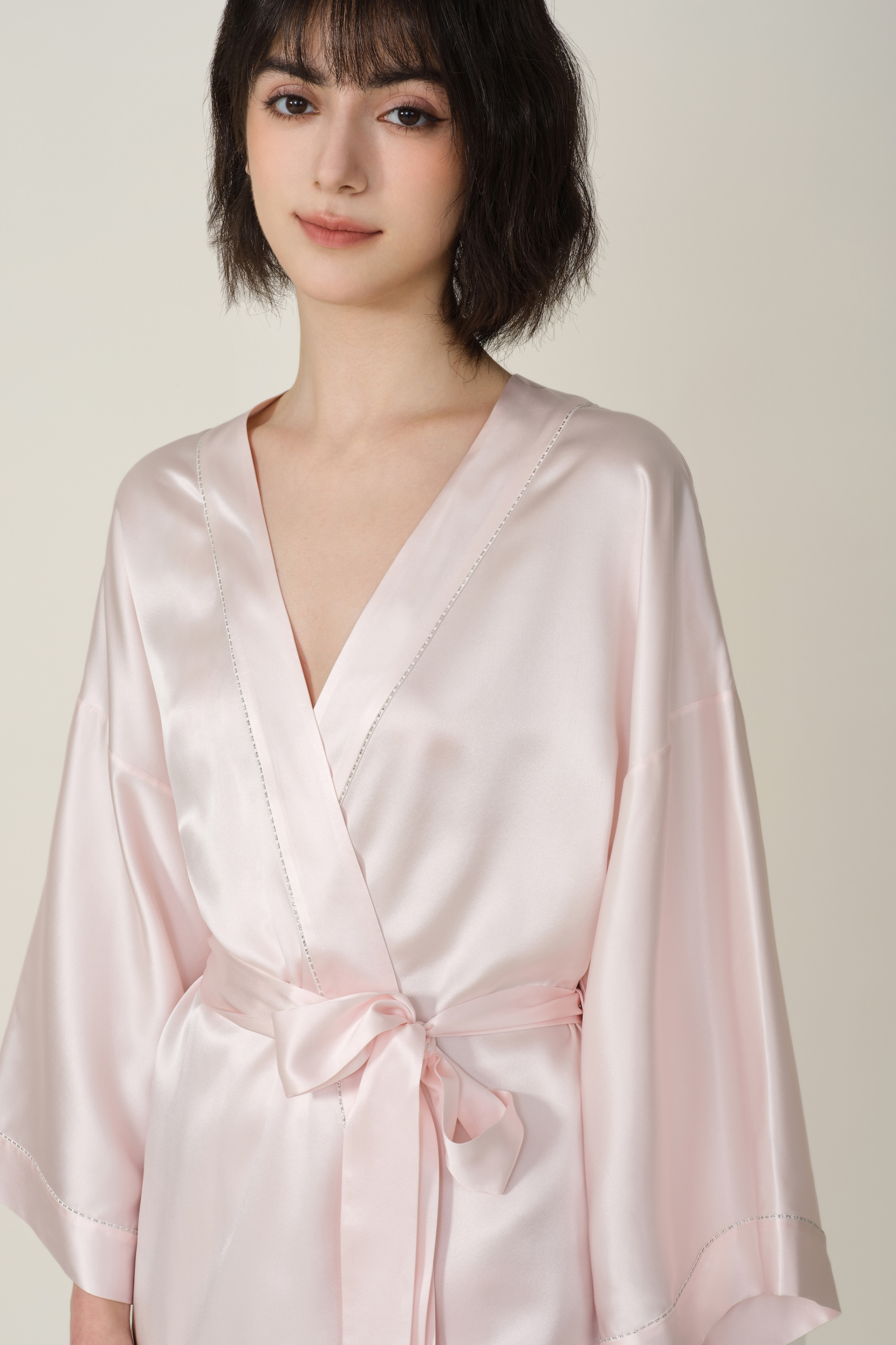The classic kimono robe features exquisite diamond-like, hand-stitched detailing, adding a touch of understated elegance with its subtle glittering texture. Perfectly paired with the matching short nightgowns, its plunging neckline creates a luxurious, cohesive look for a night of refined comfort.
