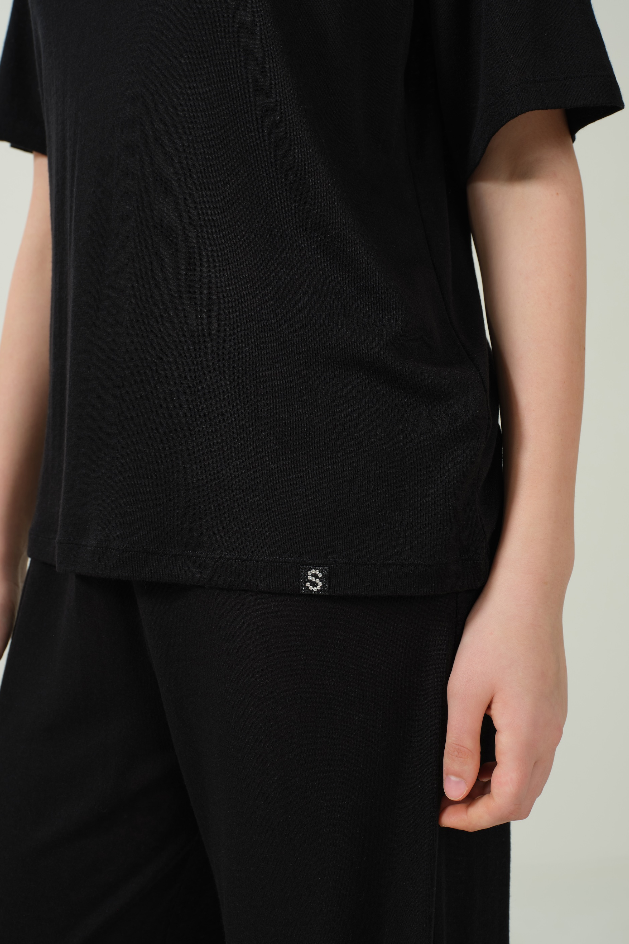 Drawing inspiration from minimalist aesthetics, these low-rise wide-leg pants deliver a sleek Clean Fit designed for home comfort. The blend of a relaxed silhouette and subtly sheer fabric adds a touch of sophistication. Elevated details, including the velvet-embossed logo on the back and the rhinestone S emblem at the hem, complete the refined look.