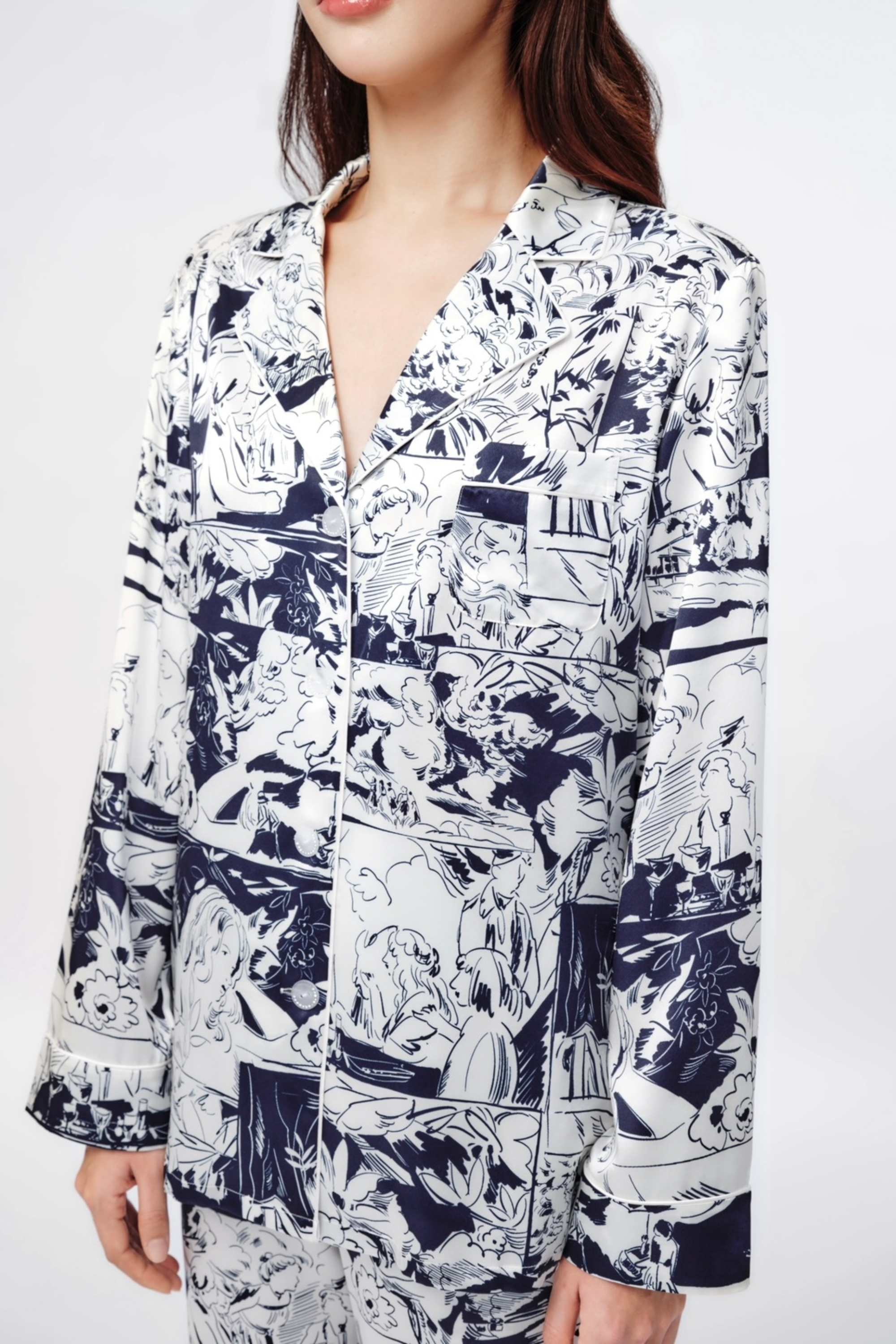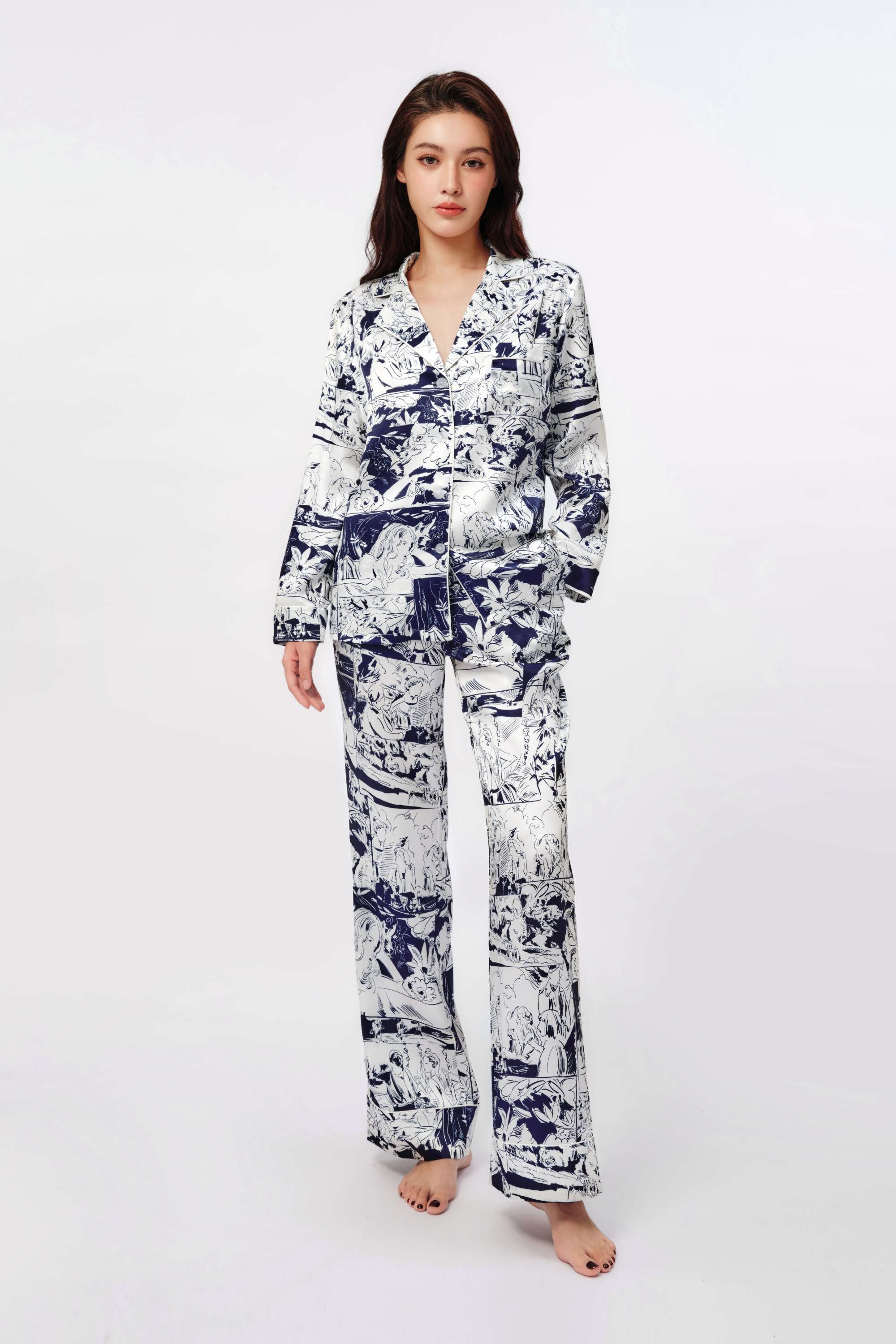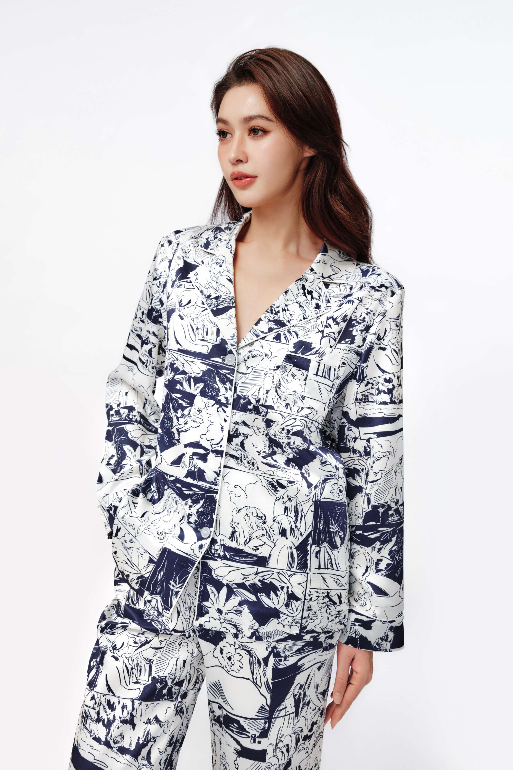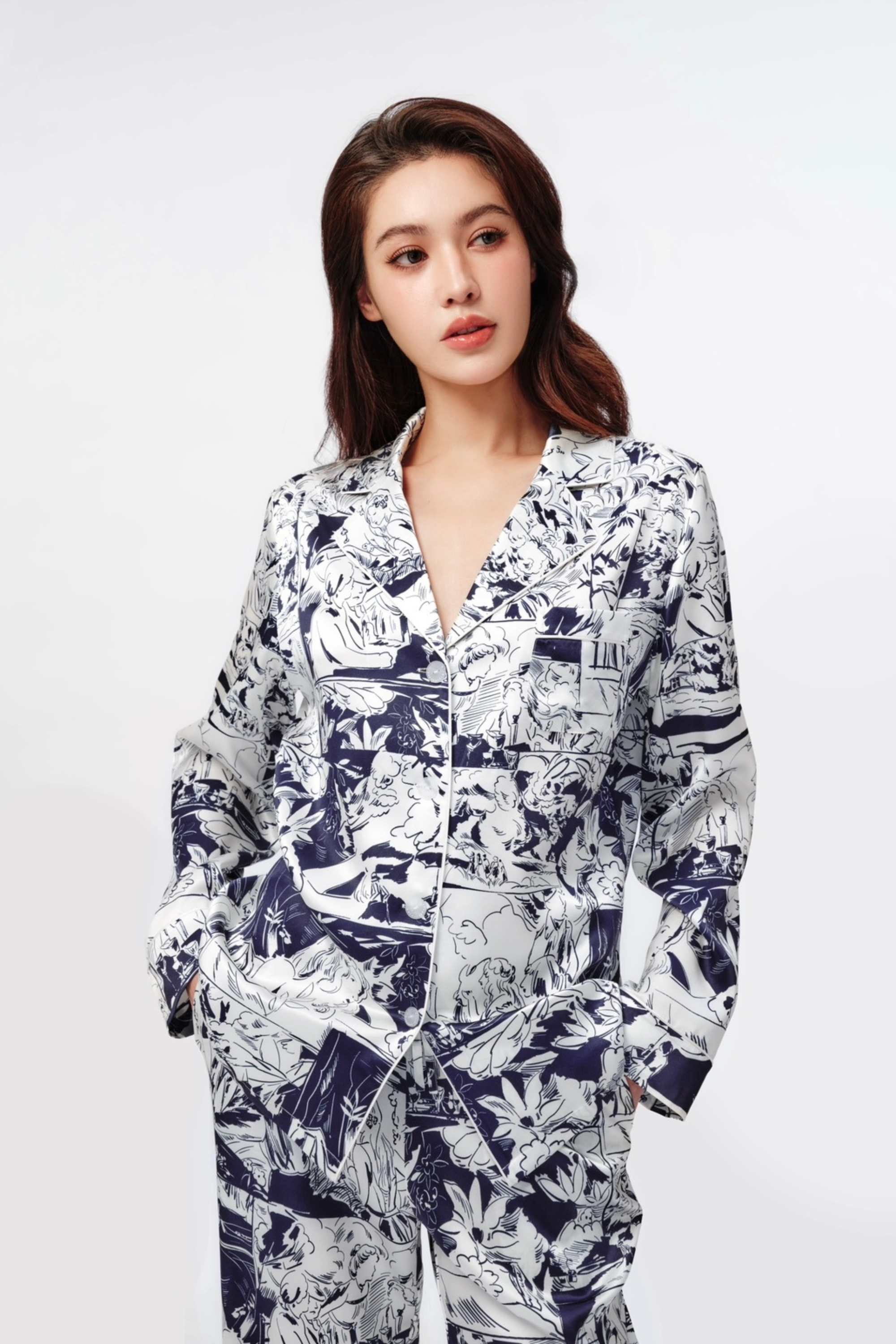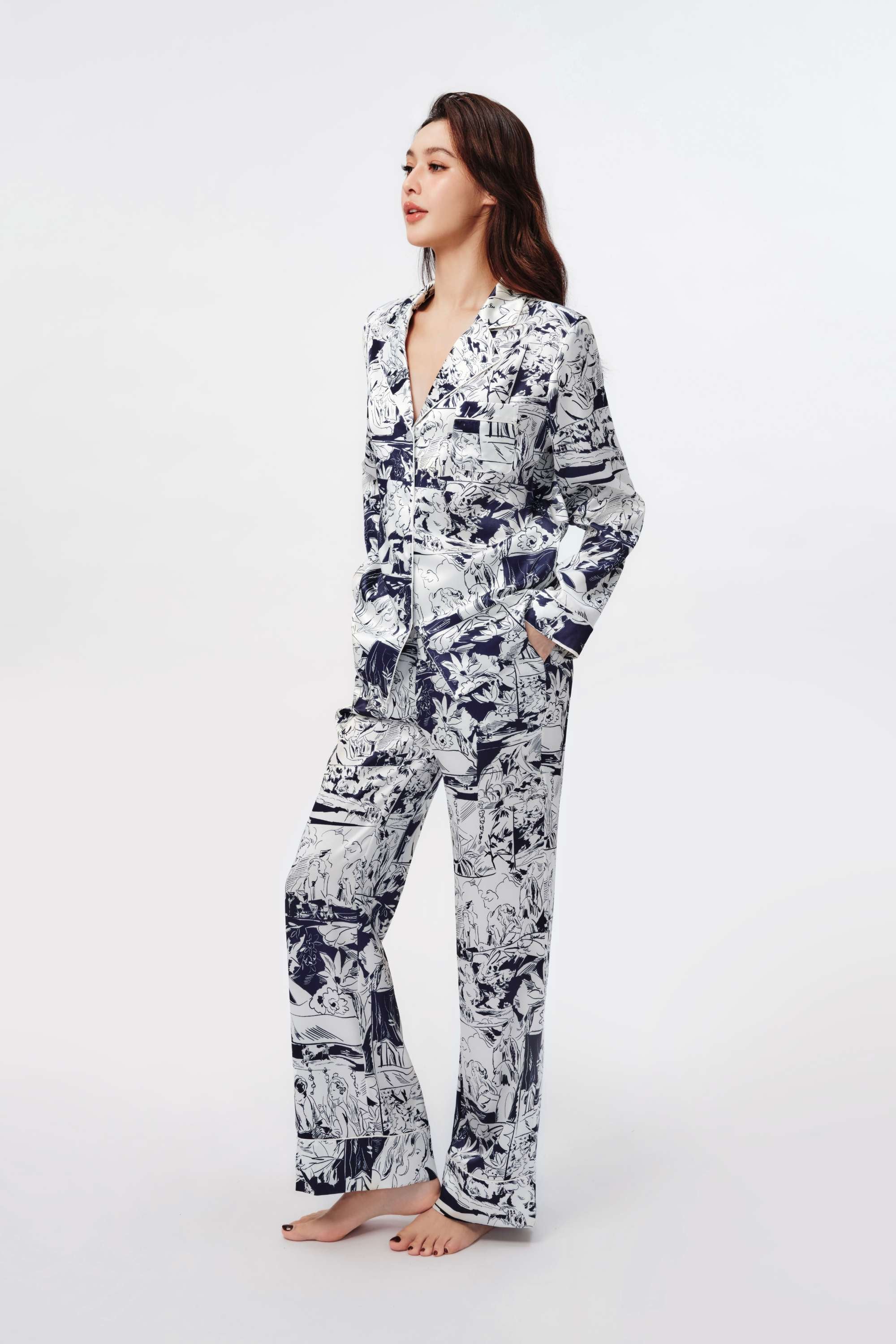Hand-drawn patterns imbued with vintage romantic colours, blue intertwining with white, interpreting the comfortable and relaxed nature of gentle silk. Classic three-dimensional tailoring embellishes the figure, radiating the charm of elegance and intellect.