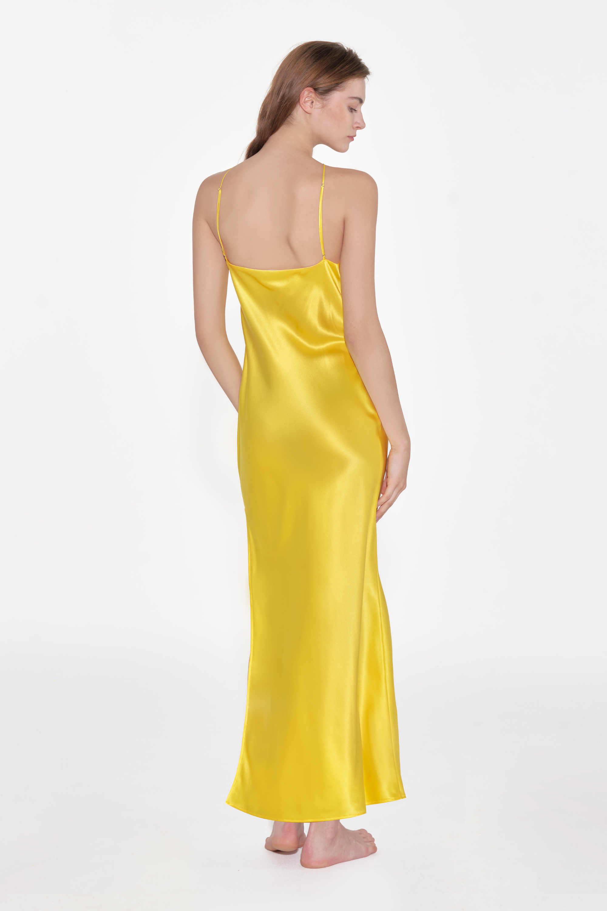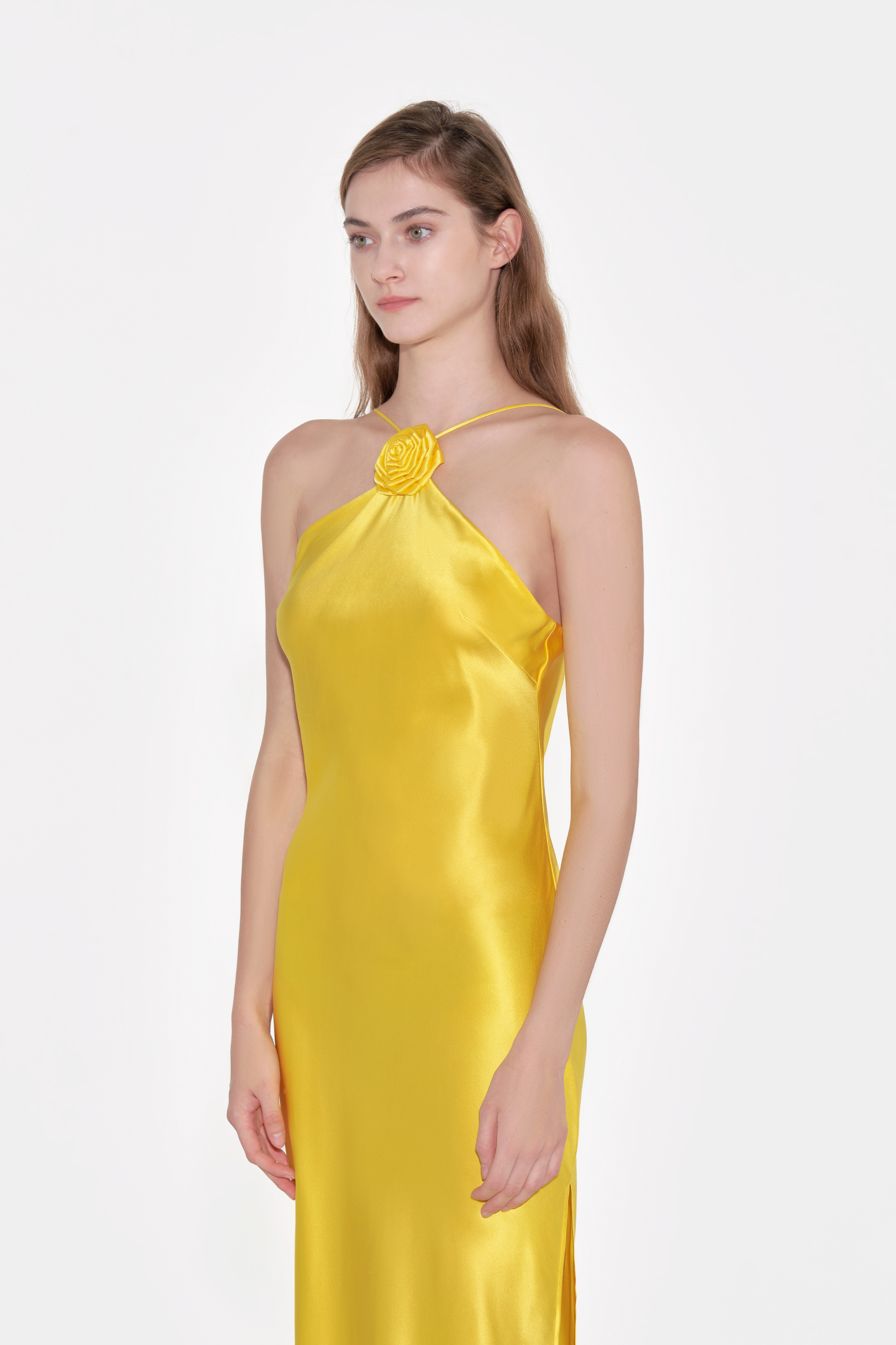 Introducing the Yellow Halter Neck Dress. In cool lemon silk, have a complete romantic look with the dress of your dreams. Featuring delicate lace stitching, adjustable shoulder straps and a Swarovski crystal finish.