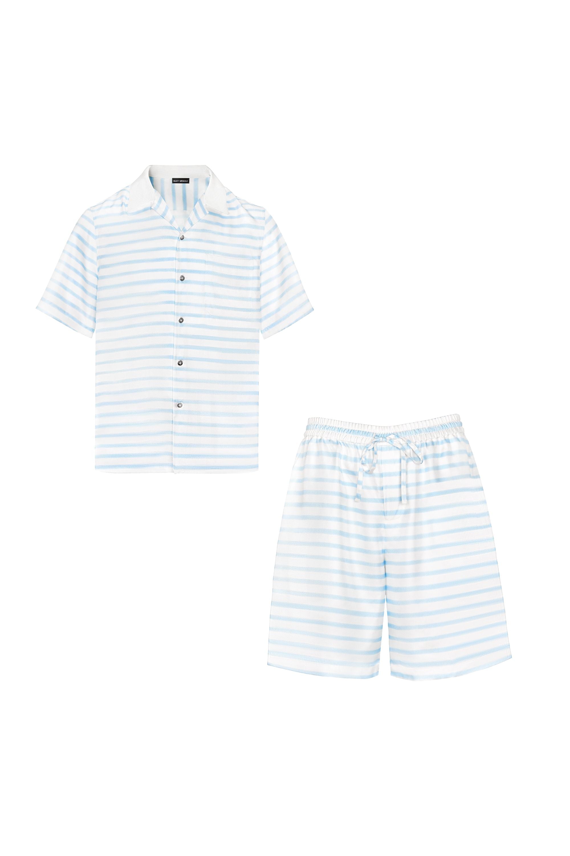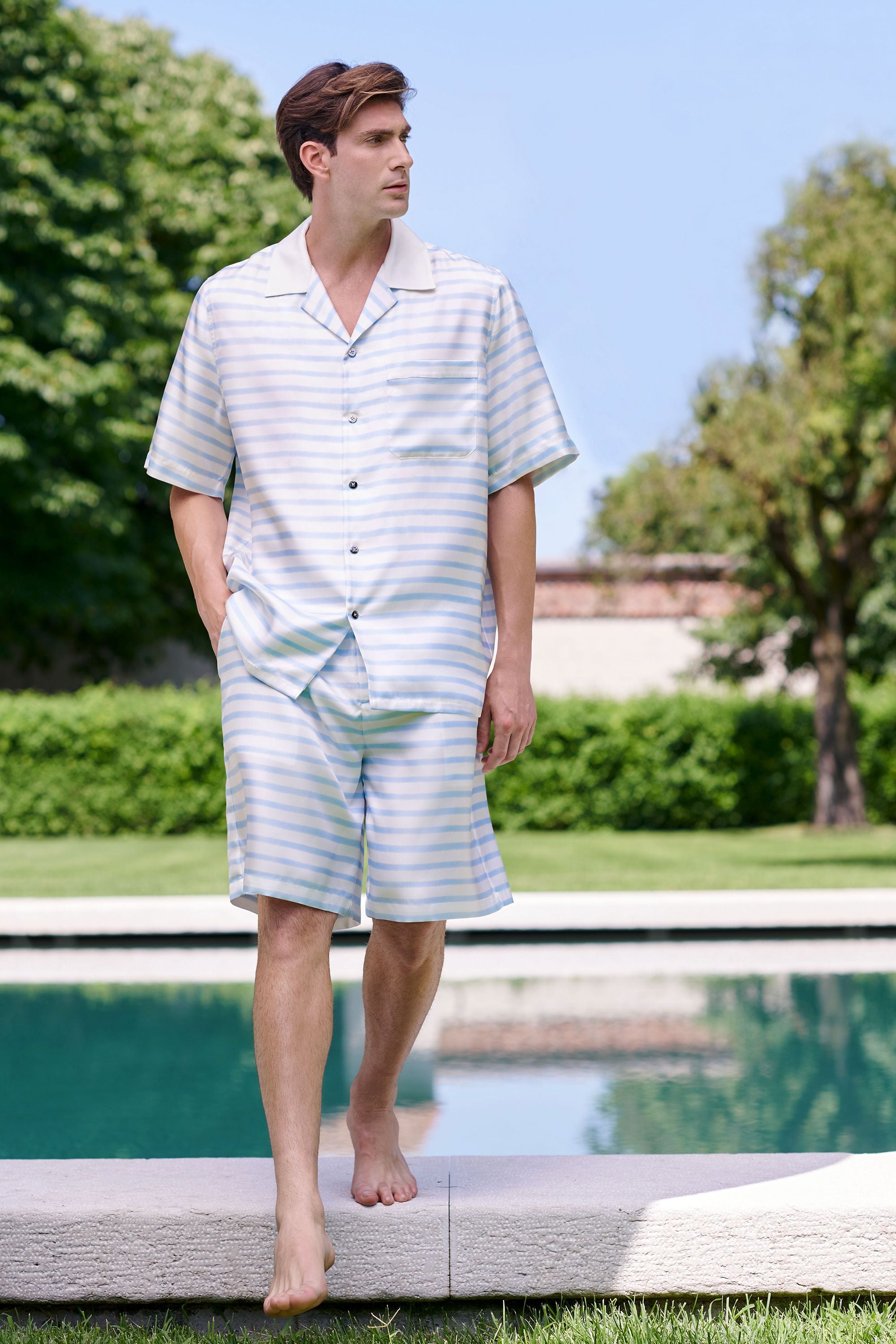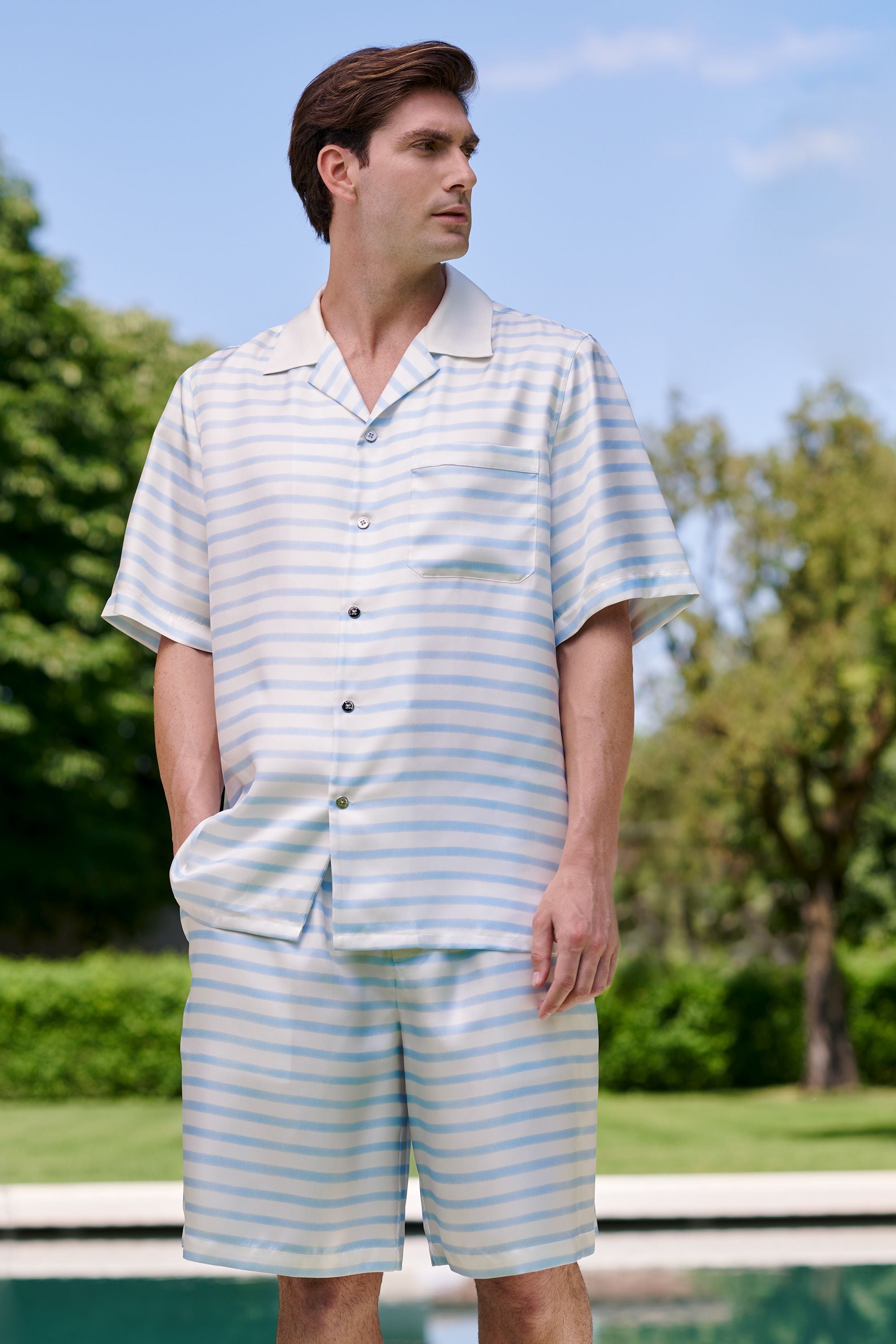 Uncover the refined comfort in the mens striped pyjama set. Featuring a boxy oversized shirt and loose comfortable long shorts, crafted from delicate and supple mulberry silk.