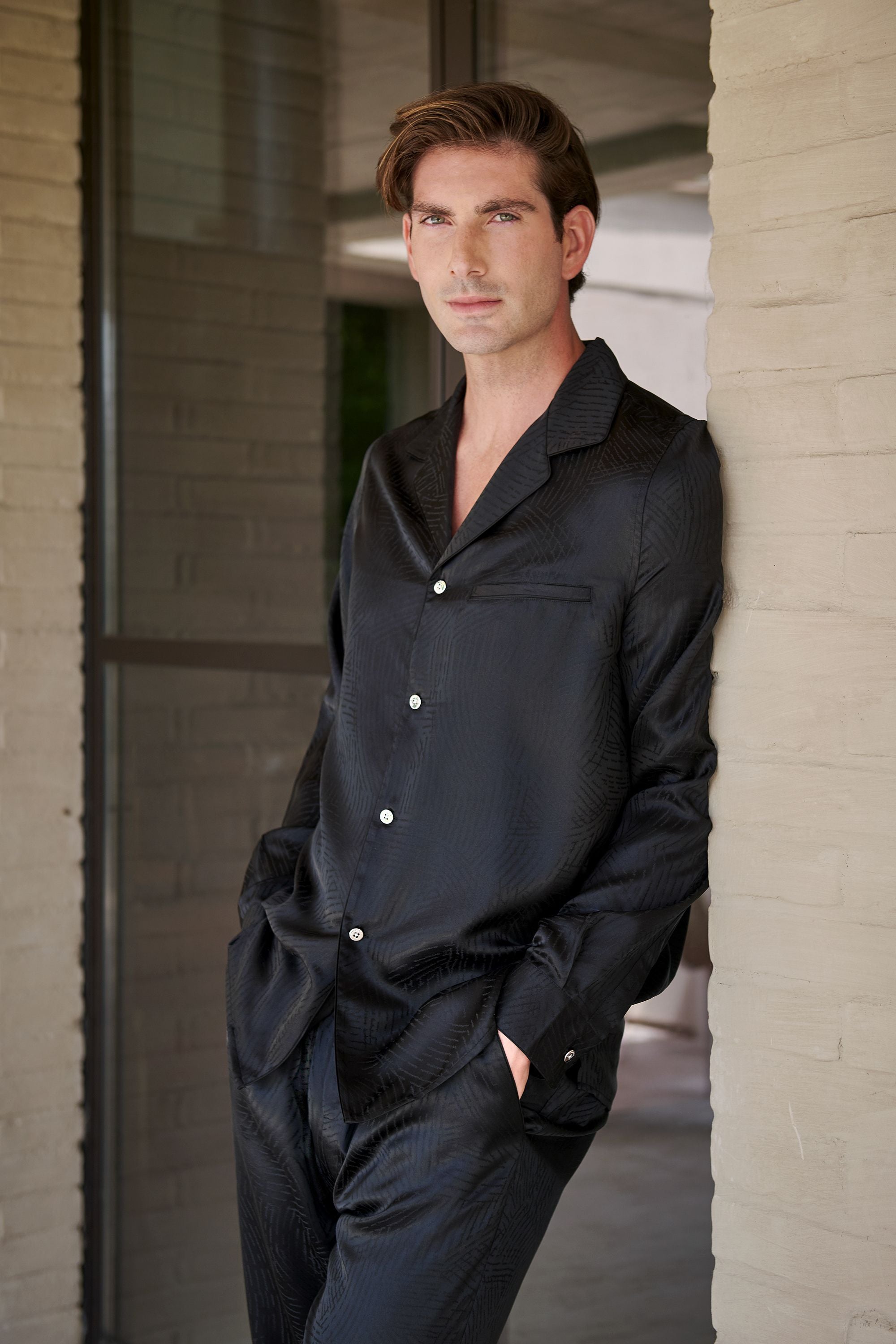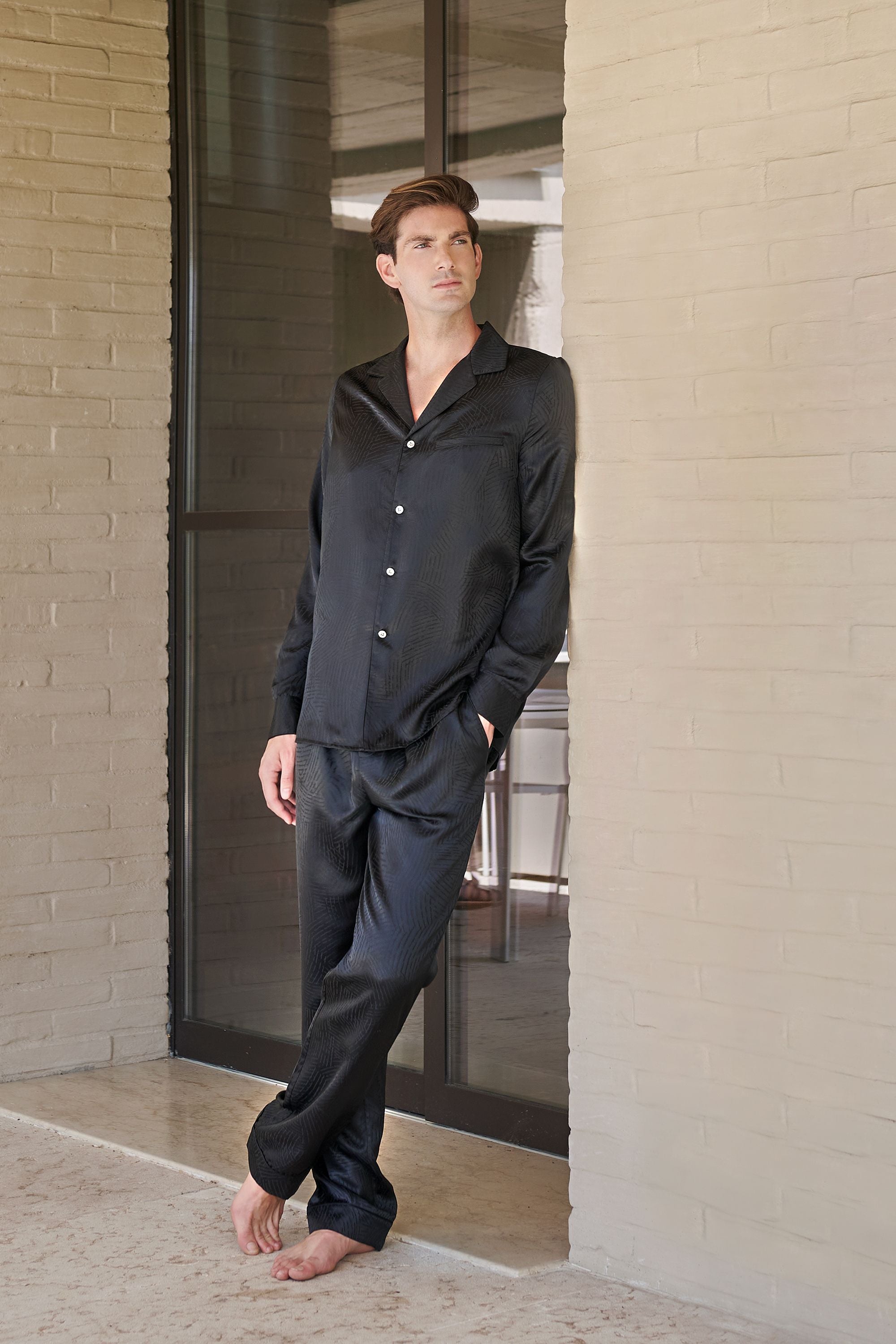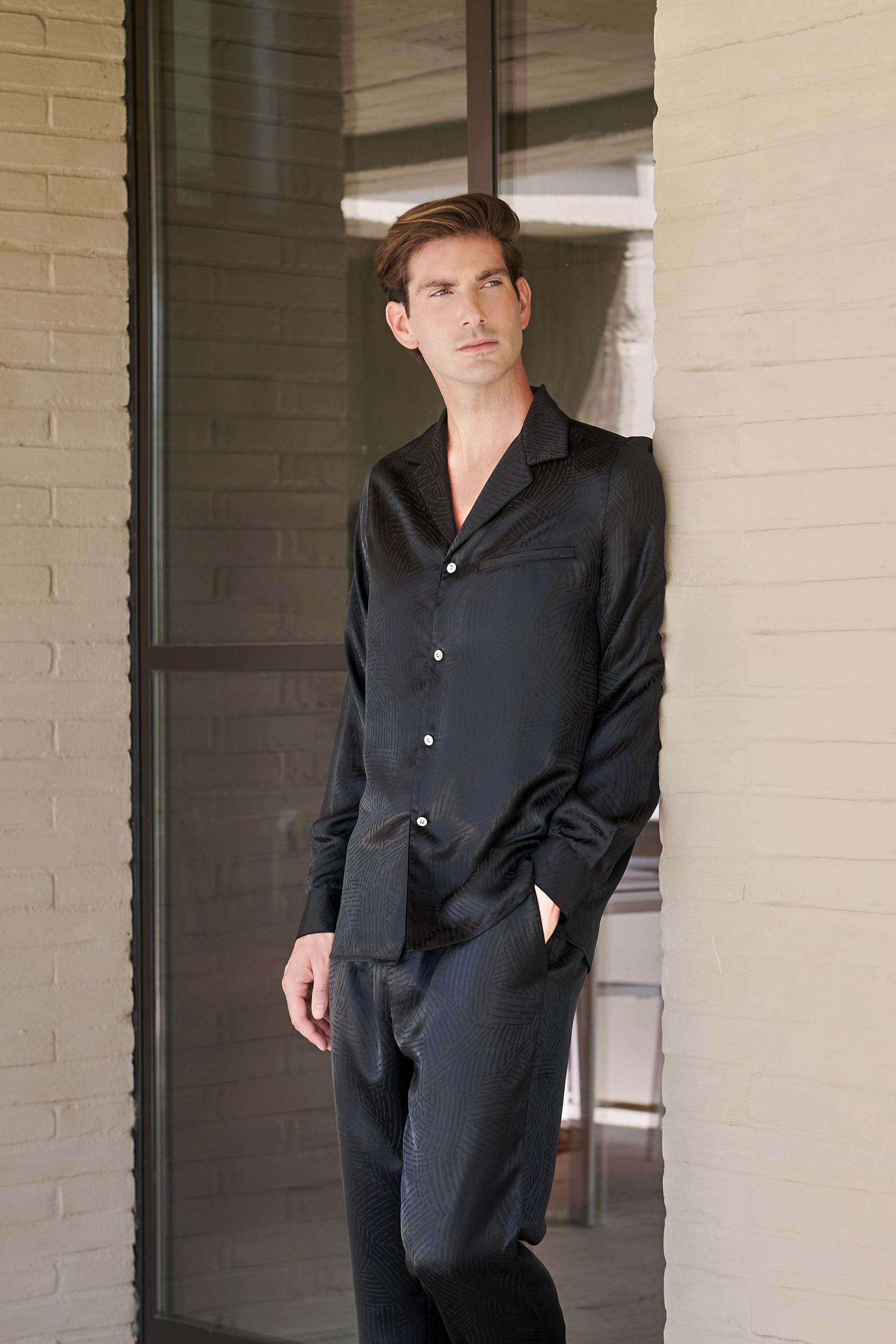 Boasting metal buttons and a timeless shirt collar design, this top offers a refined and polished aesthetic. Experience refined relaxation with this effortlessly premium set in a relaxed menswear style.