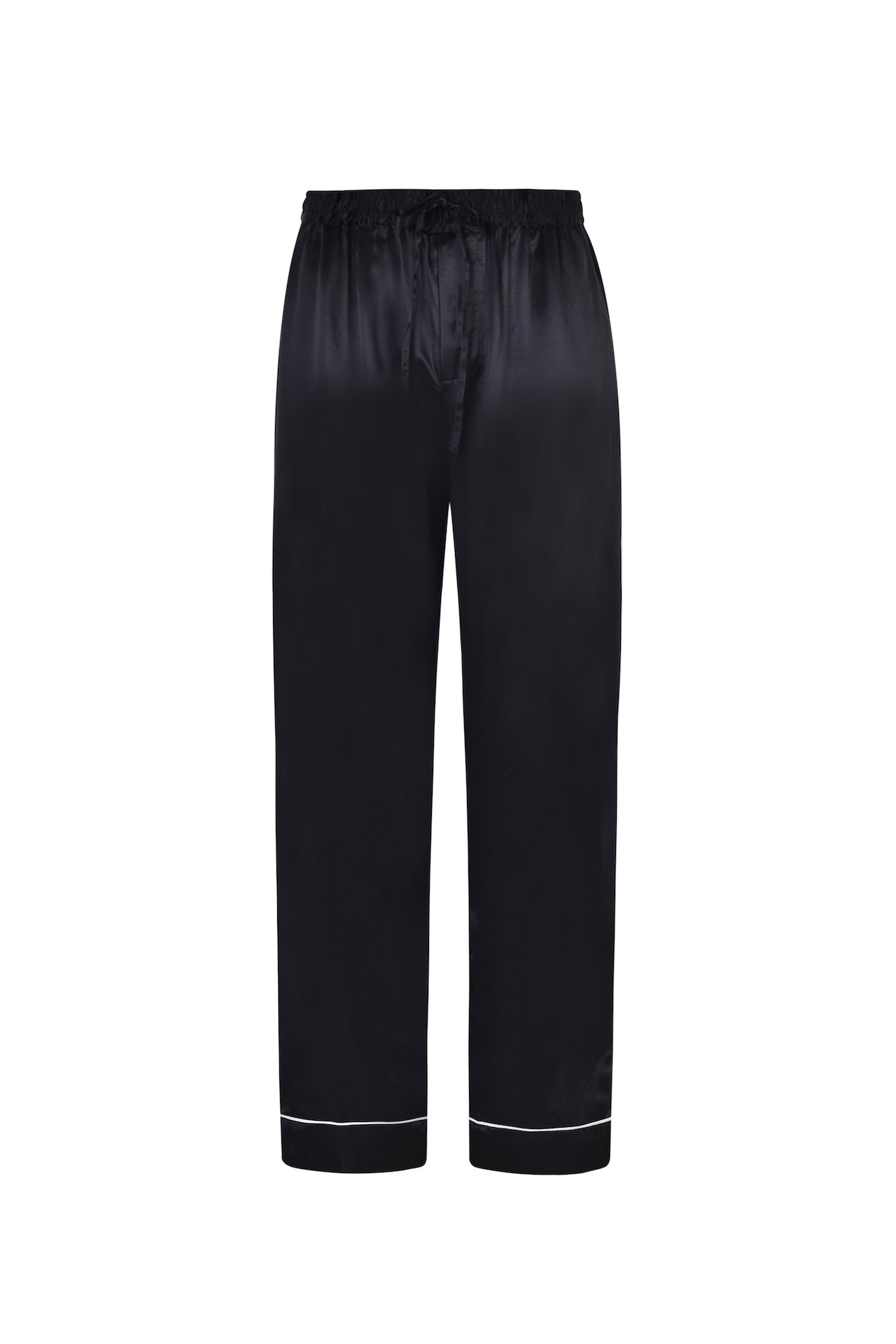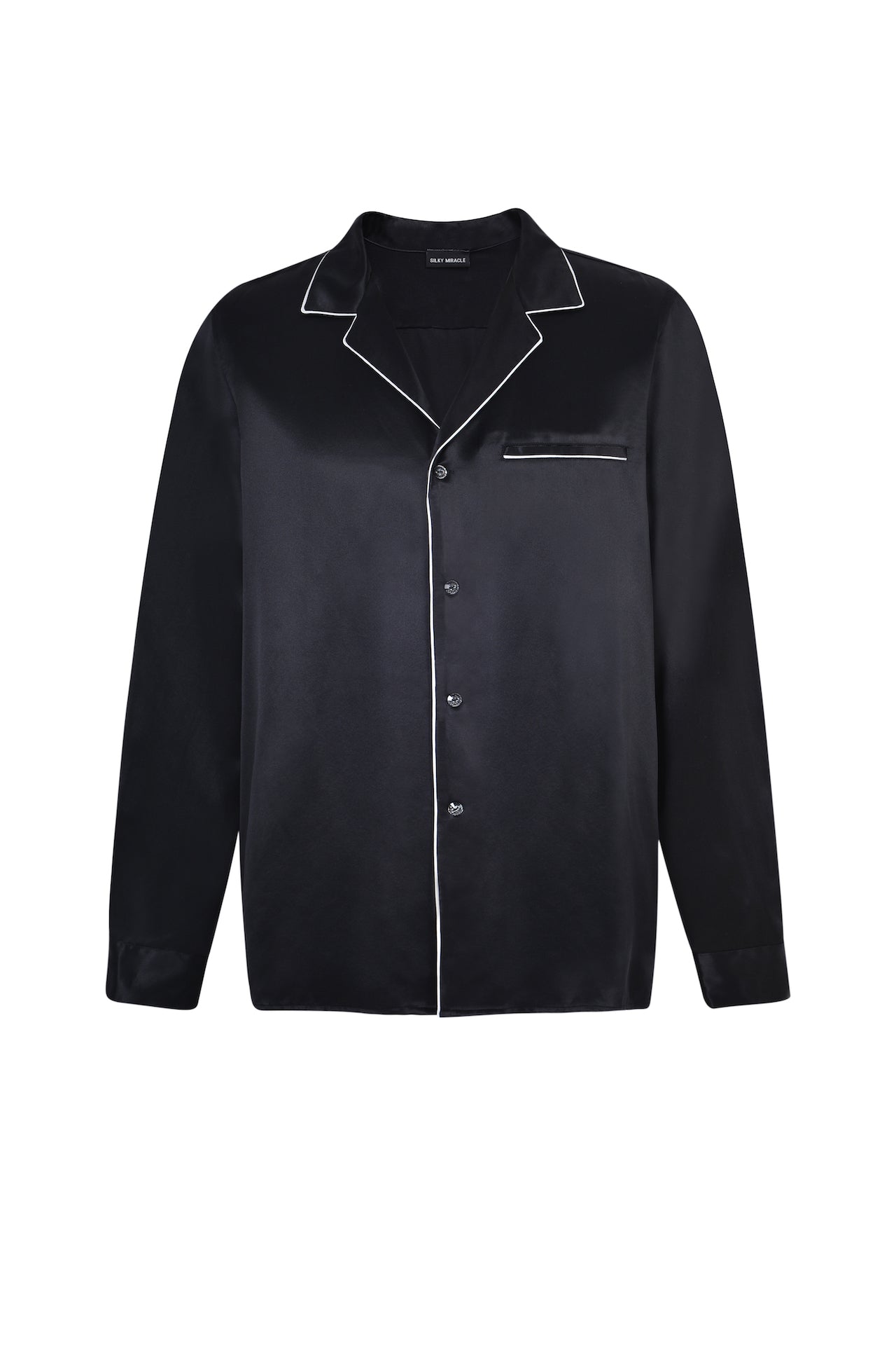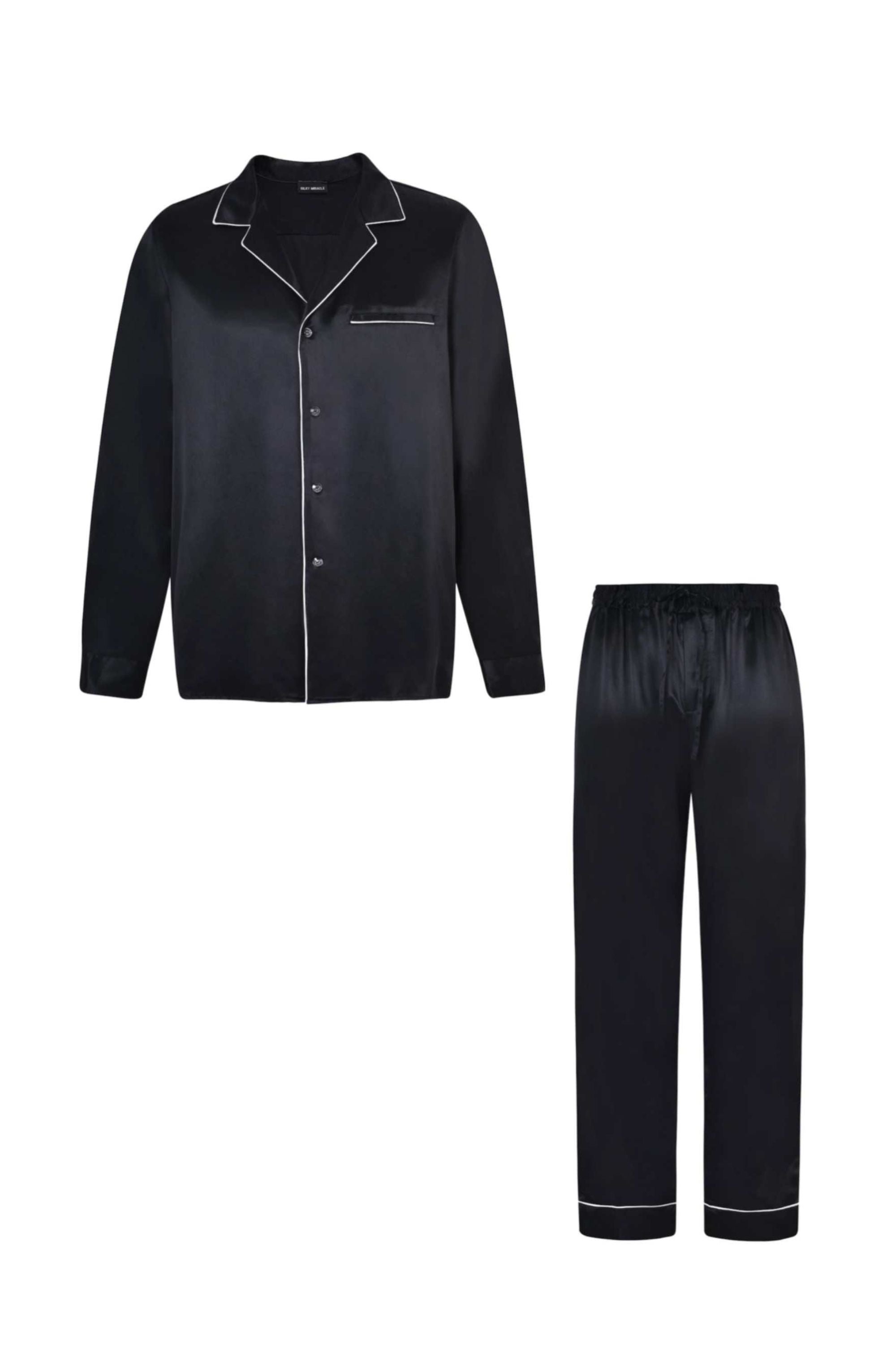 The Classic Black Men's Pyjama Set is cut from a high shine Mulberry Silk, hand crafted for a classic and comfortable loungewear fit. The set features an elegant white piping, single breast pocket and buttoned cuffs and the trousers have a drawstring waist.
