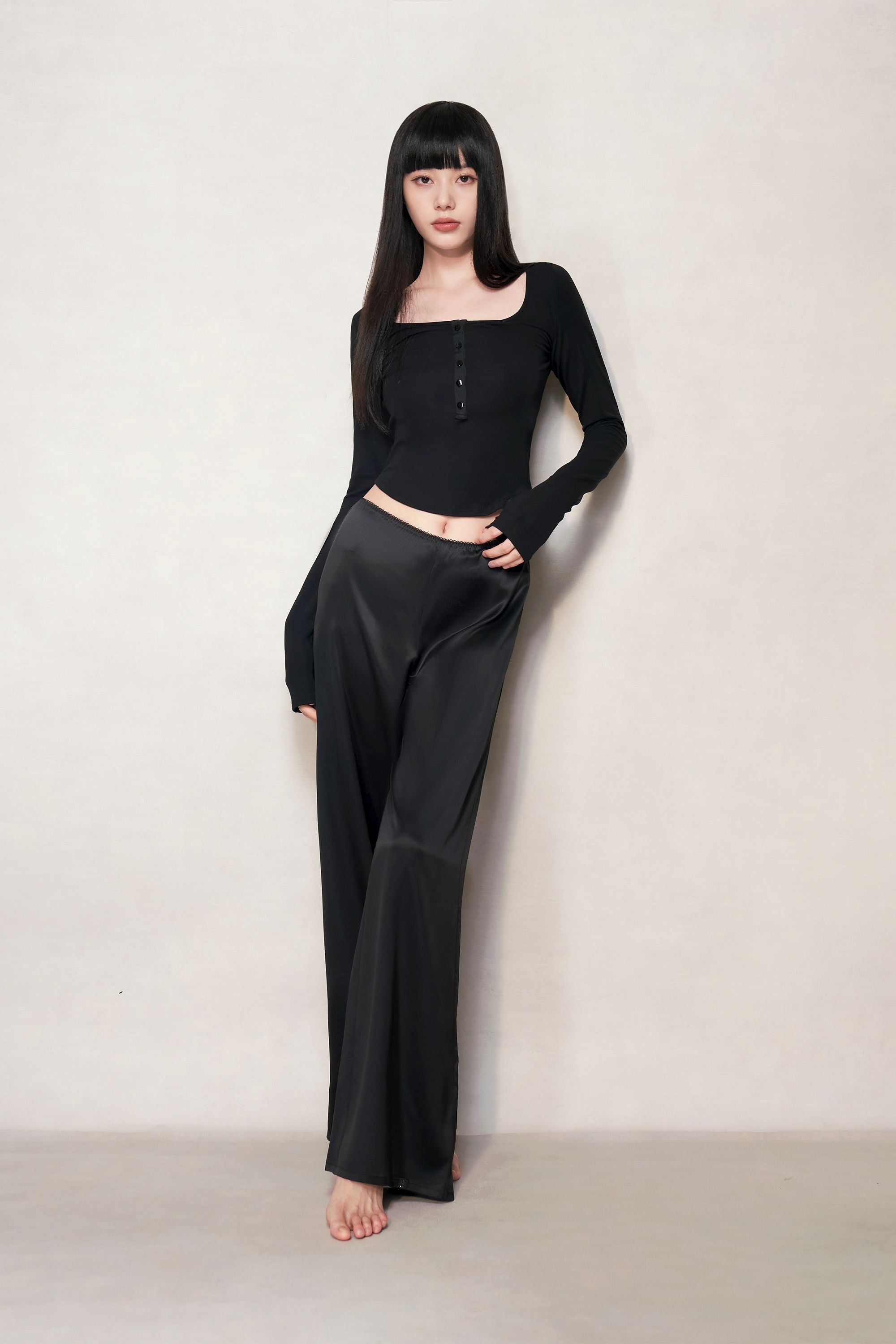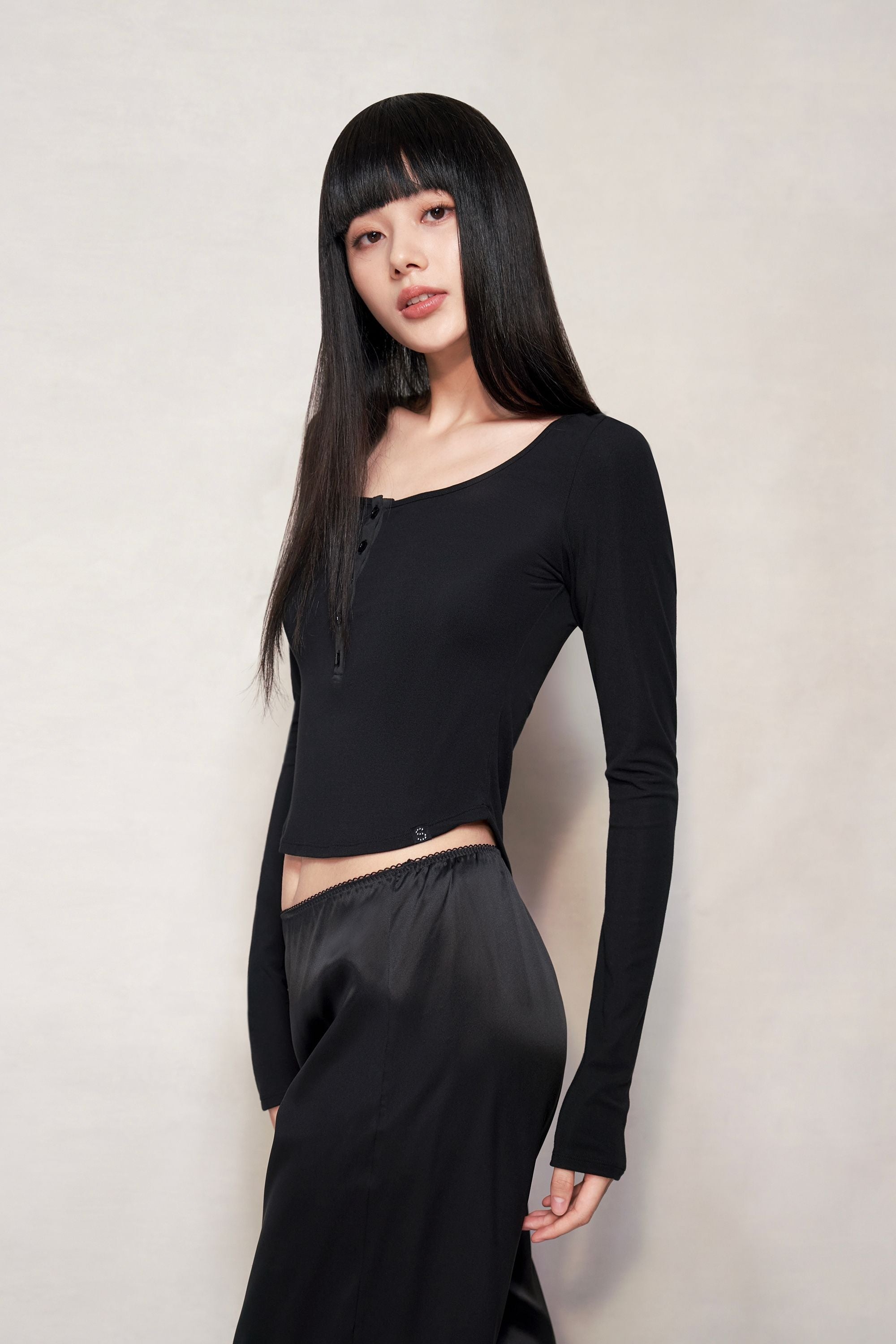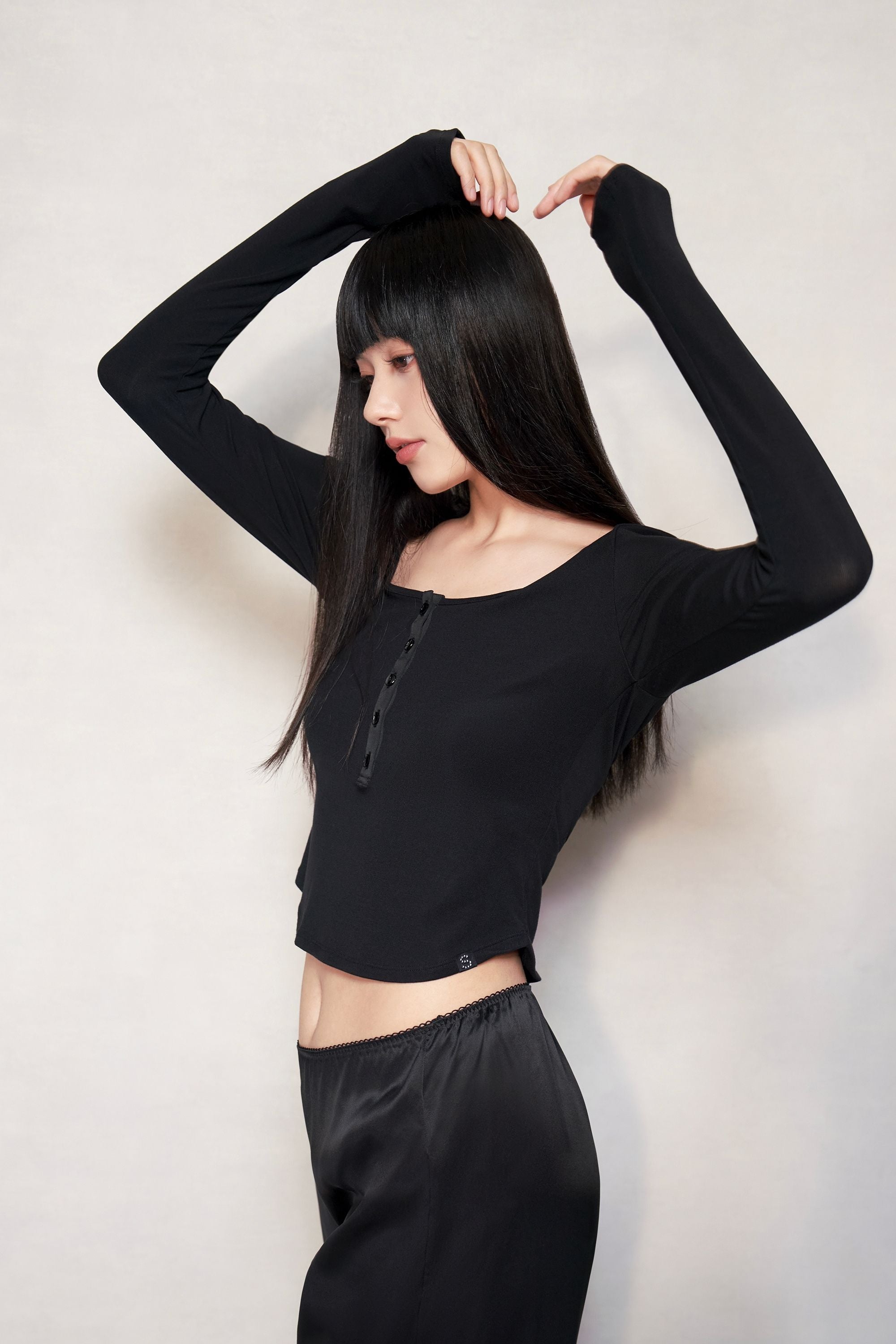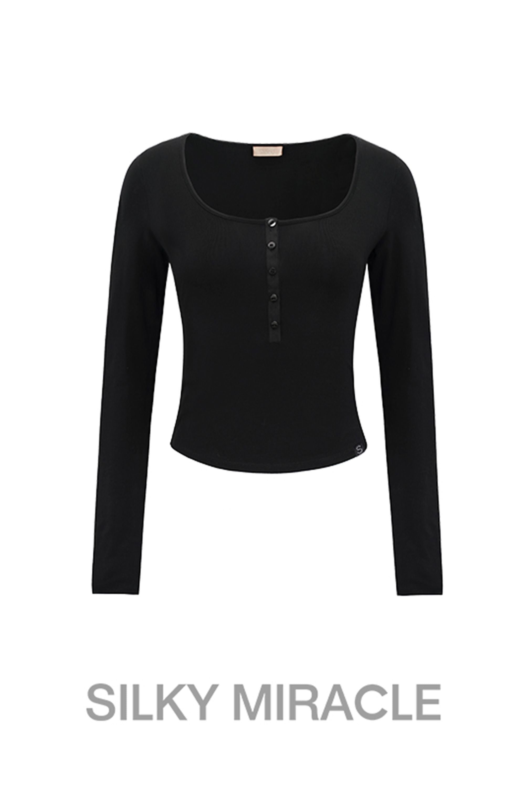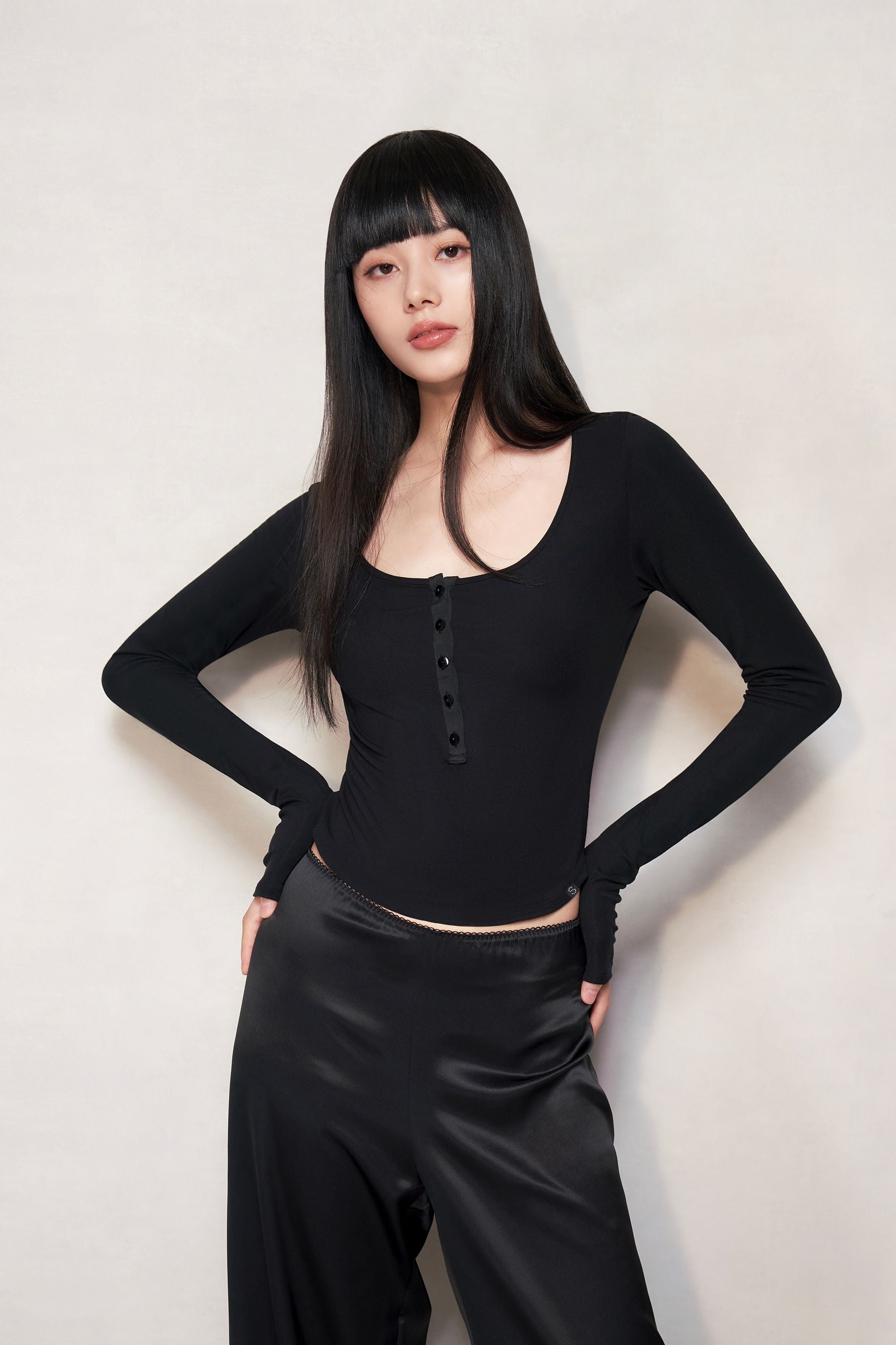 Introducing our Black U-Neck Buttoned Knit Long Sleeve T-Shirt, a masterpiece of comfort and flexibility. The U-shaped neckline highlights the neck's graceful line, complemented by the addition of stylish buttons and a curved hemline adding a sporty aesthetic.