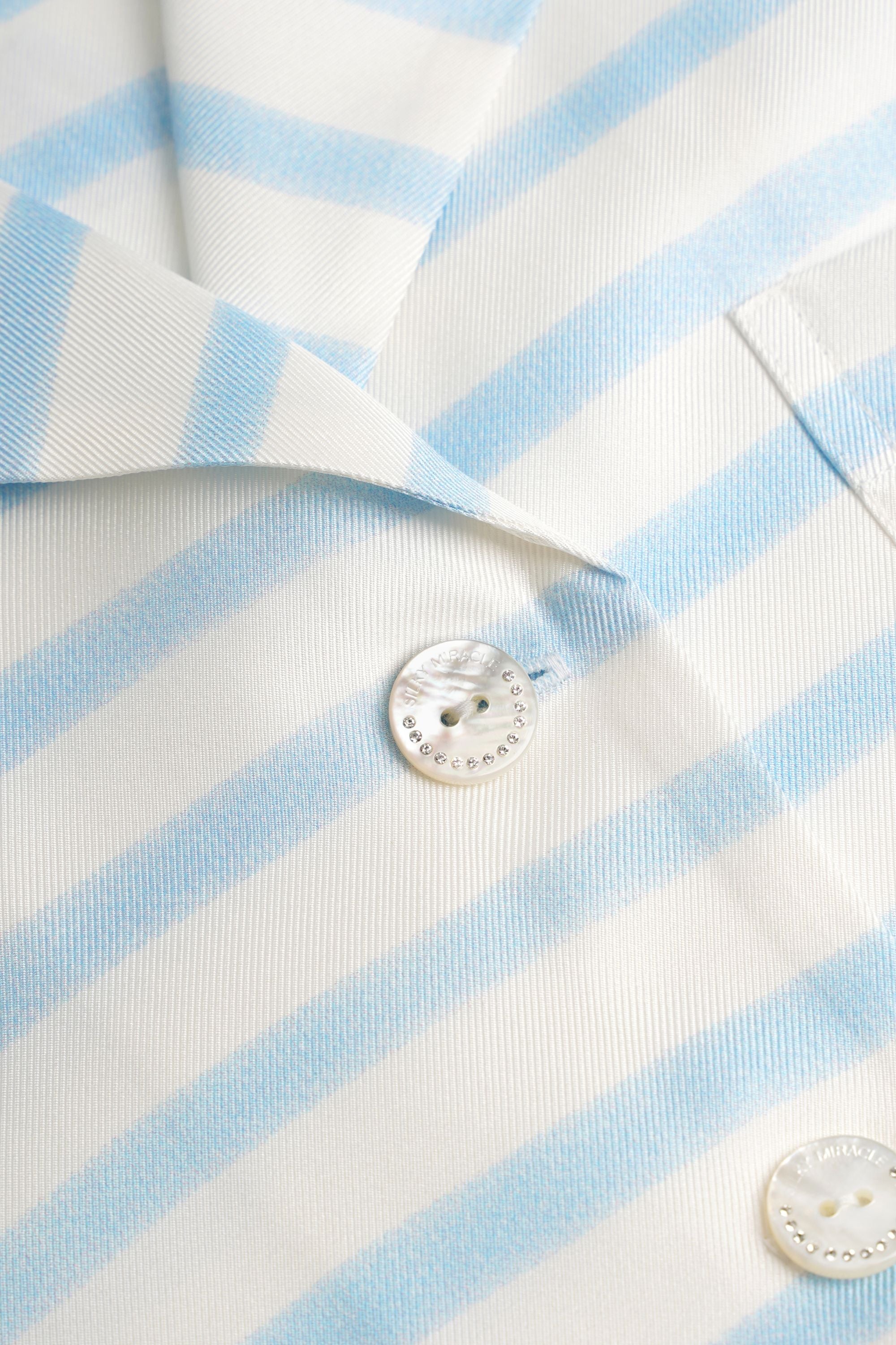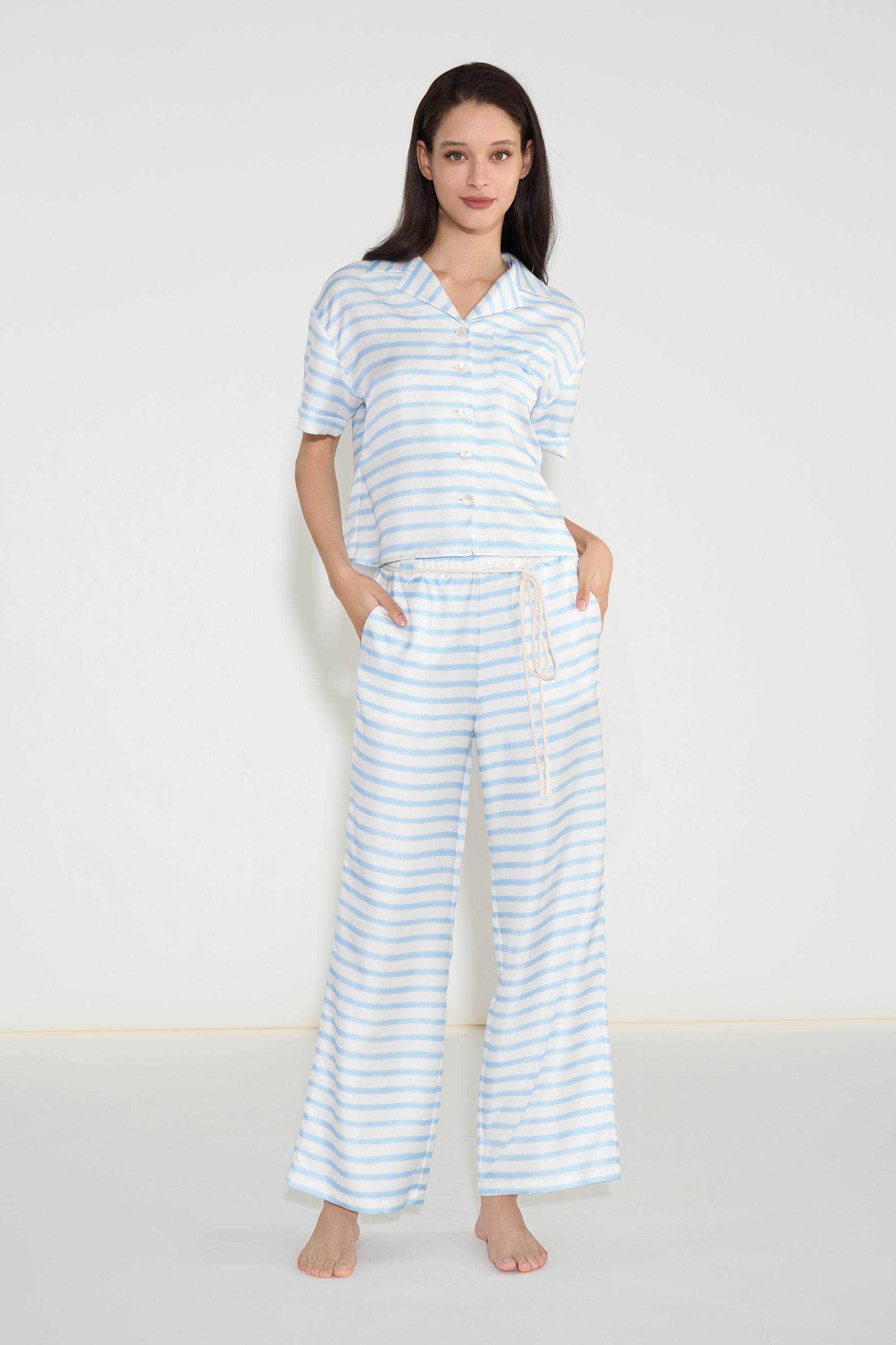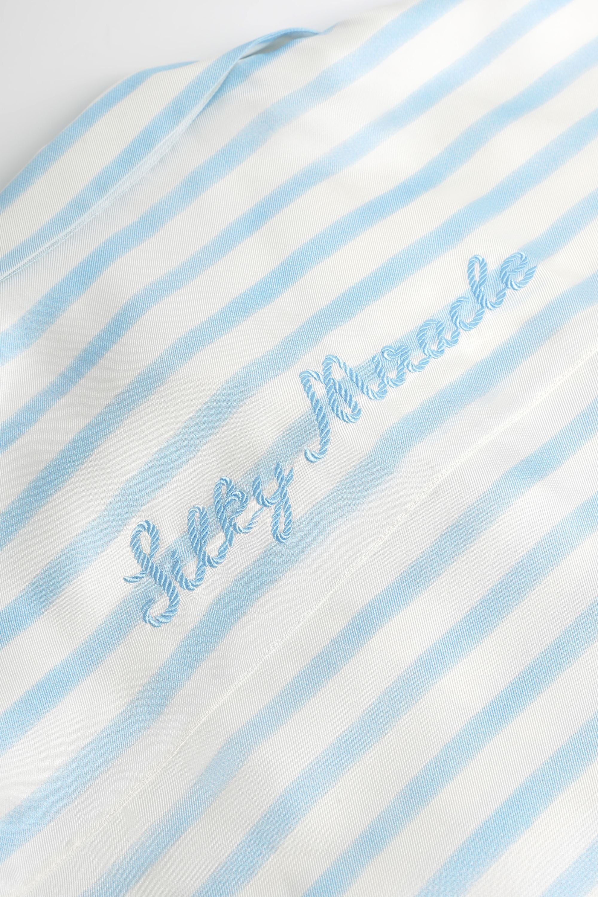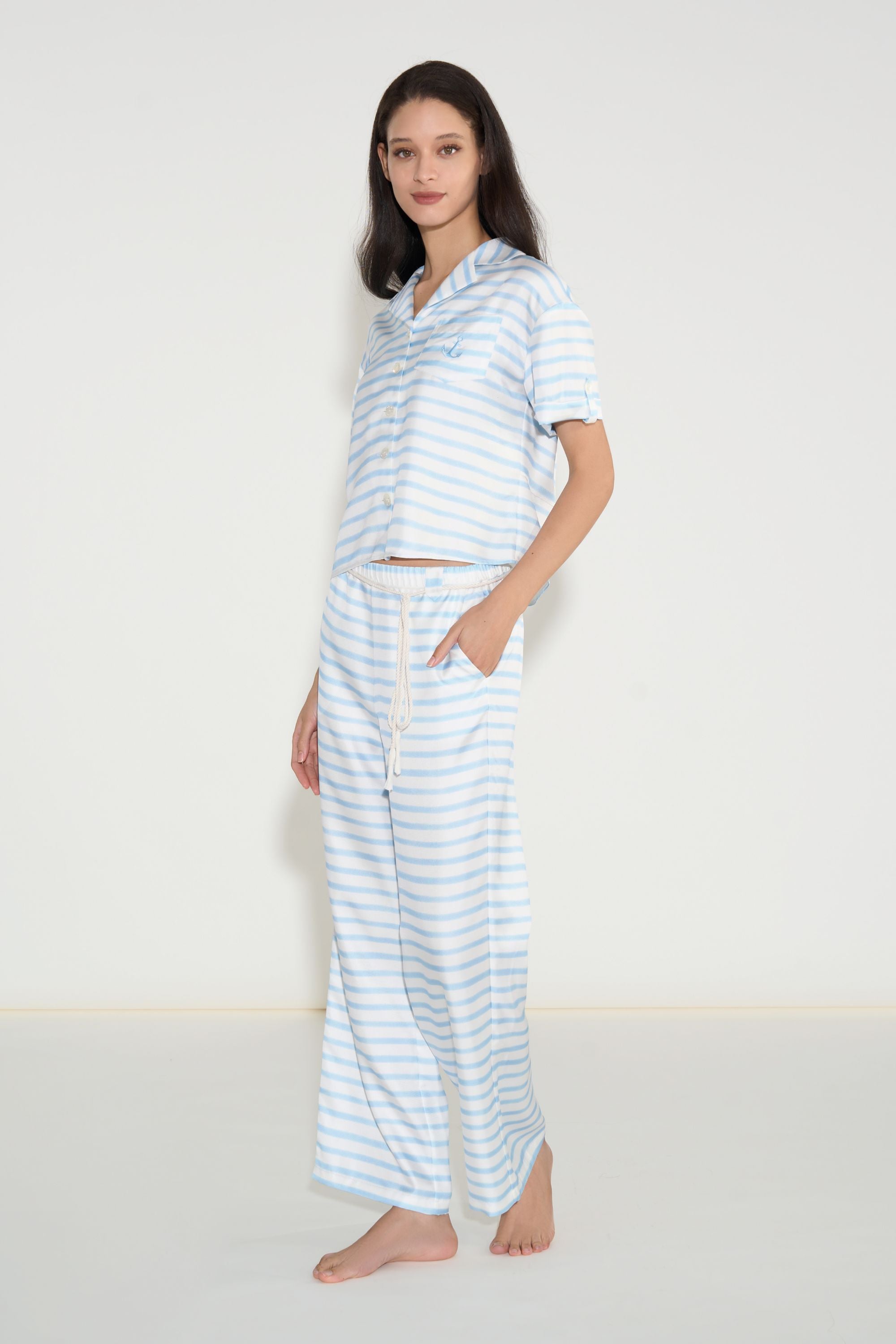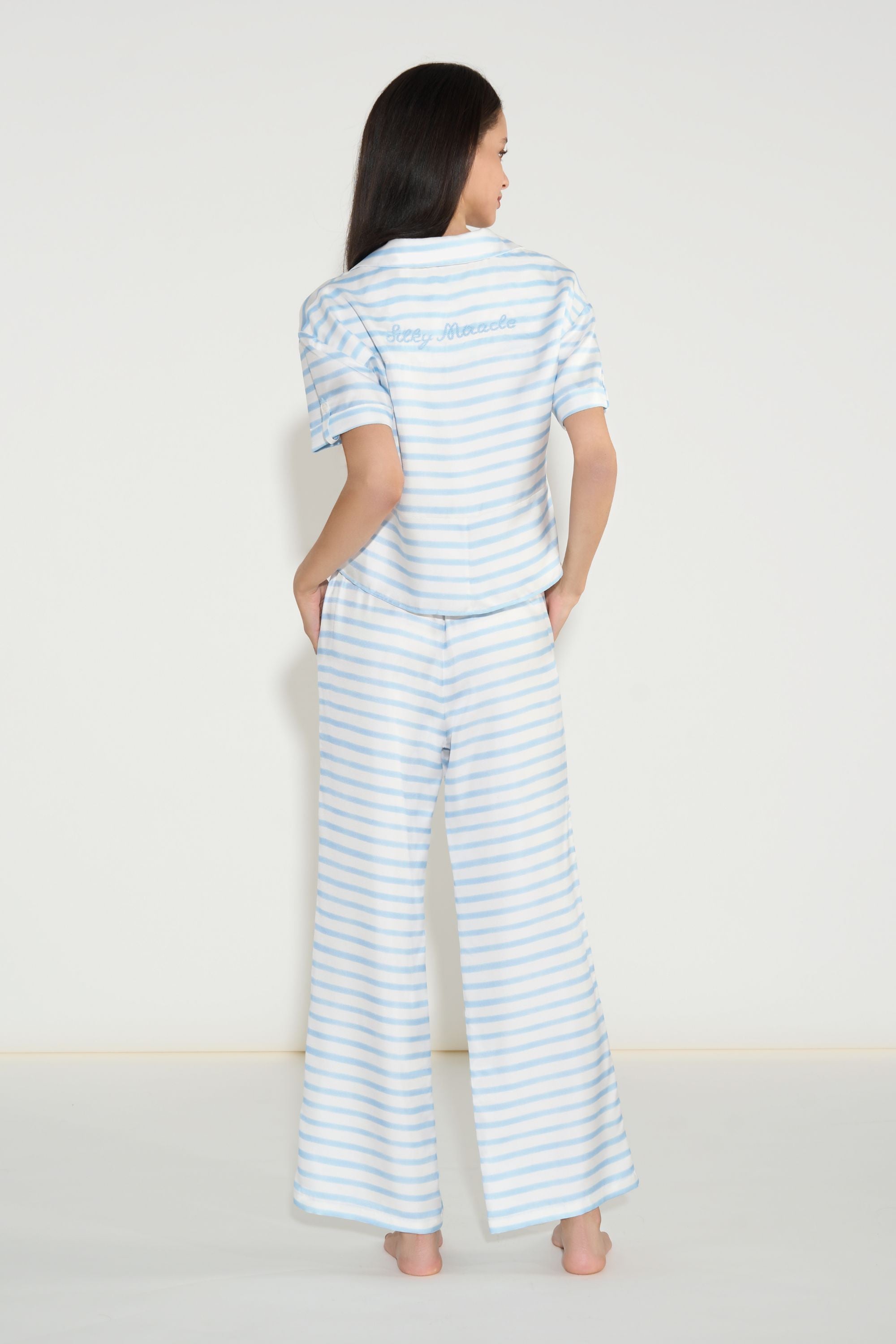 Introducing our SS23 striped pyjama set, crafted from a supple blue and white striped silk print that evokes summer elegance. Featuring short sleeves, a collar and delicate anchor embroidery on front pocket.