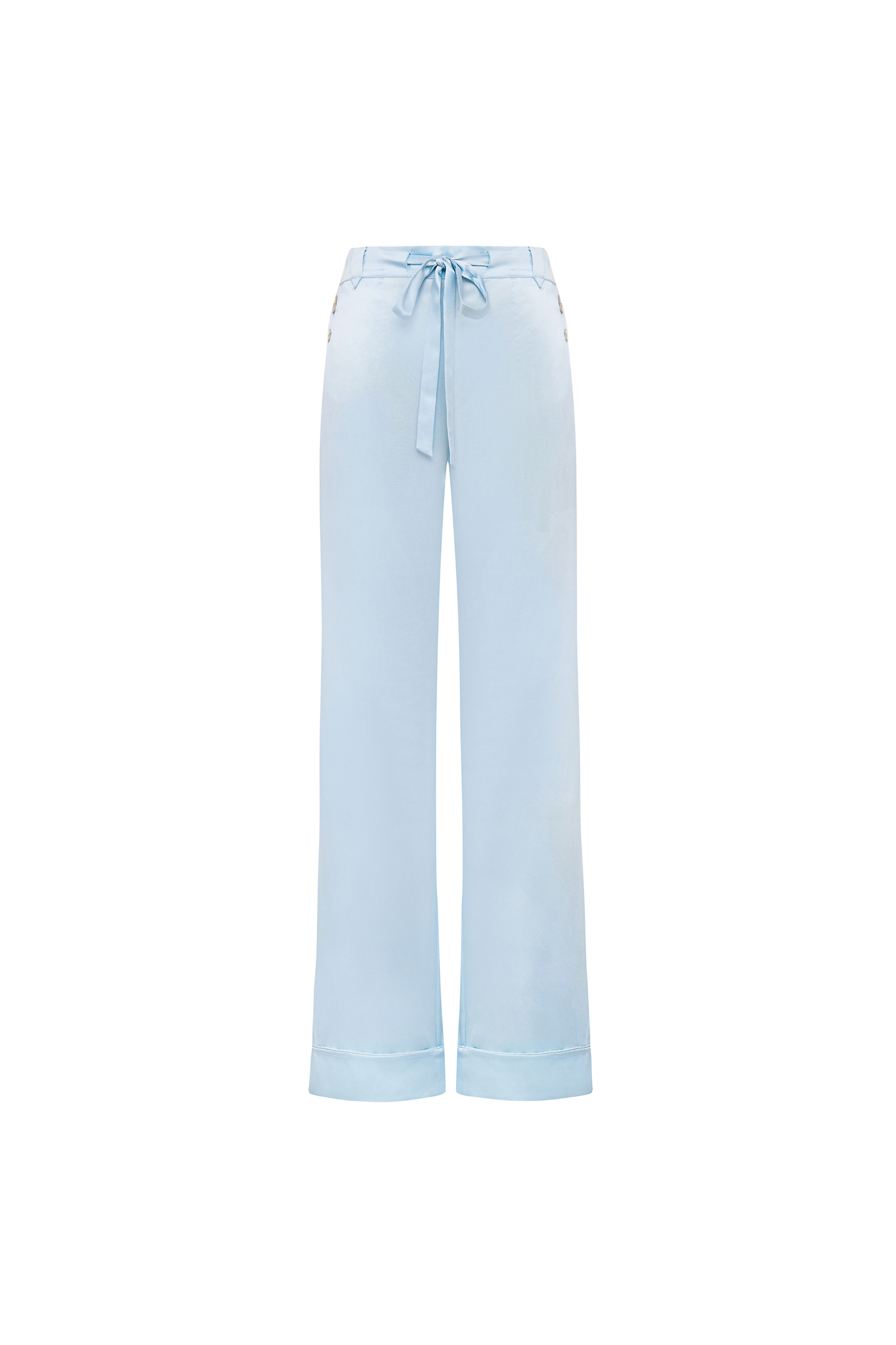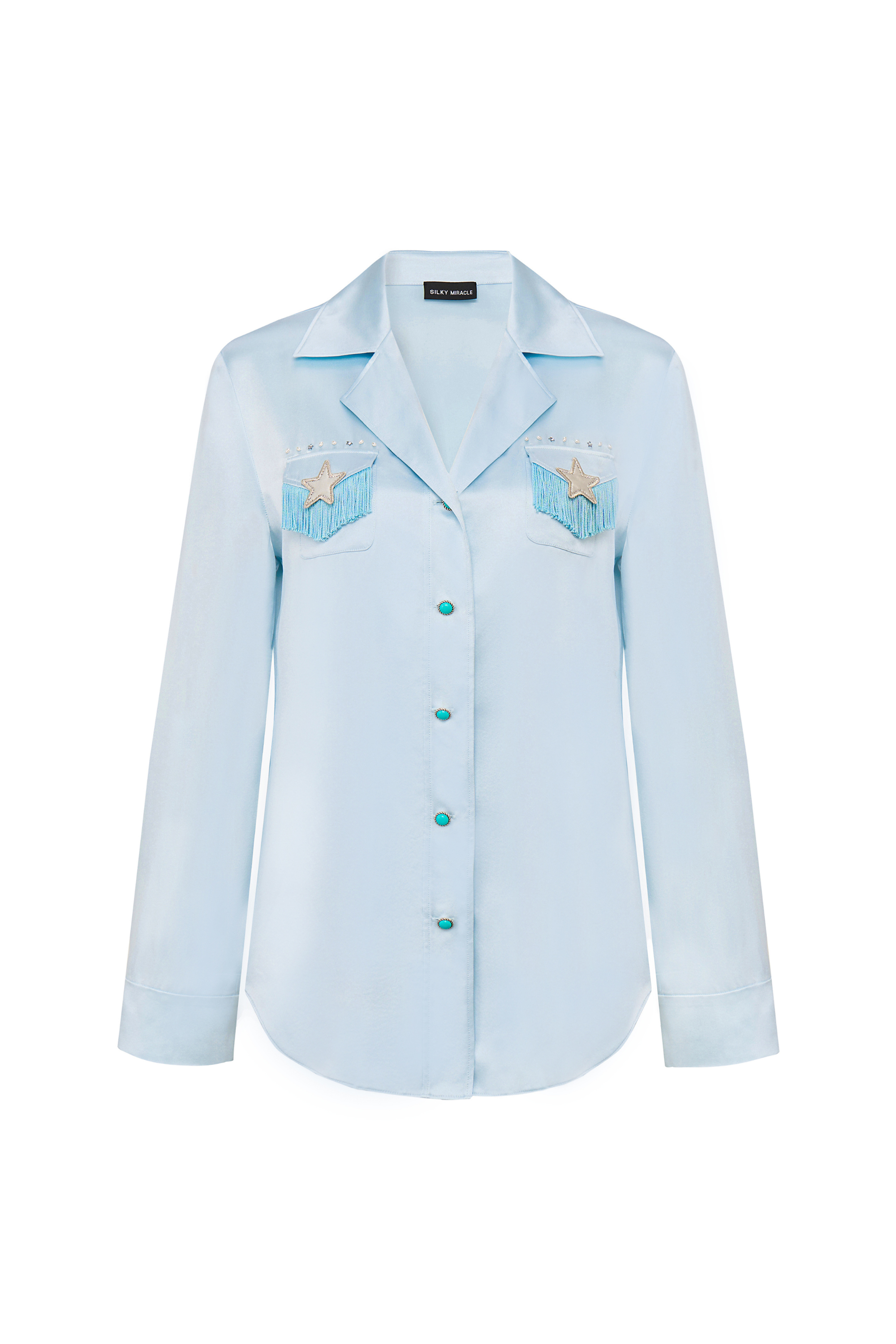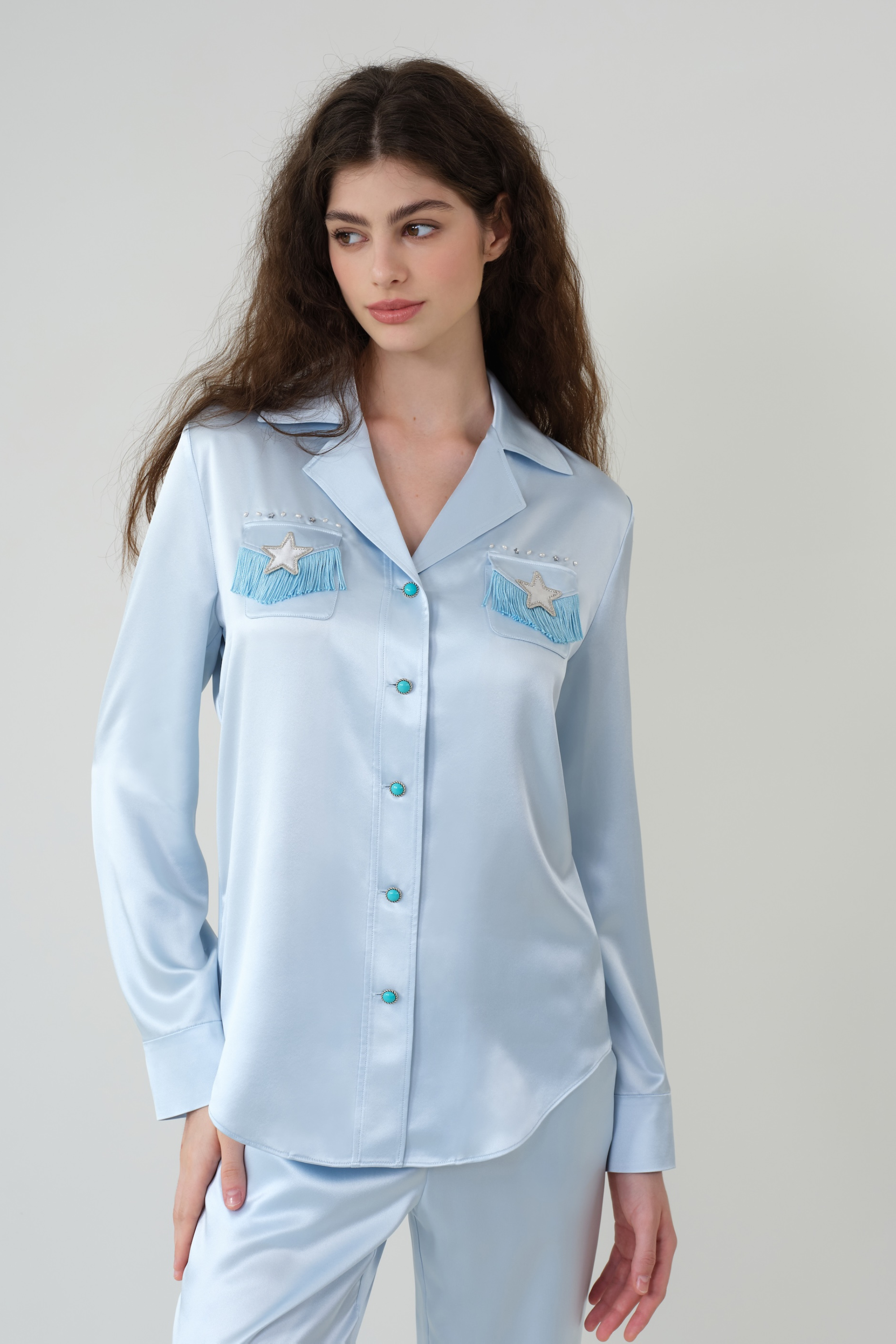 This shirred pyjama set offers a relaxed, comfortable fit with cowboy-inspired tasseled flap pockets. The pockets are adorned with hand-beading, rhinestone pentagram embroidery, and turquoise buttons, adding unexpected charm. Available in soft blue and cool black.