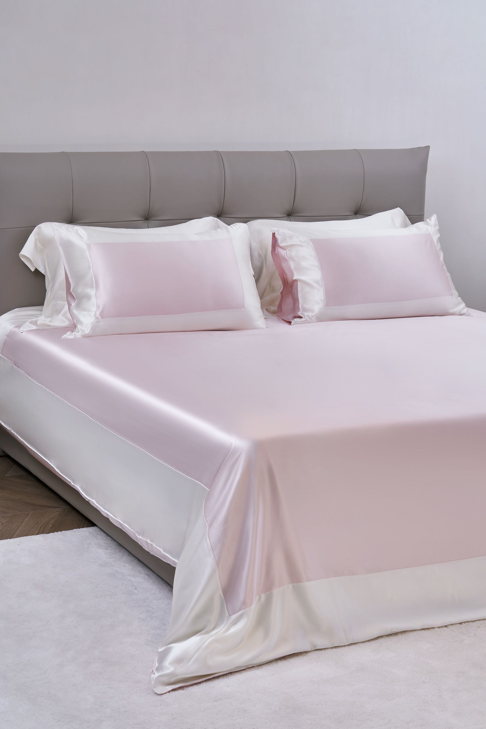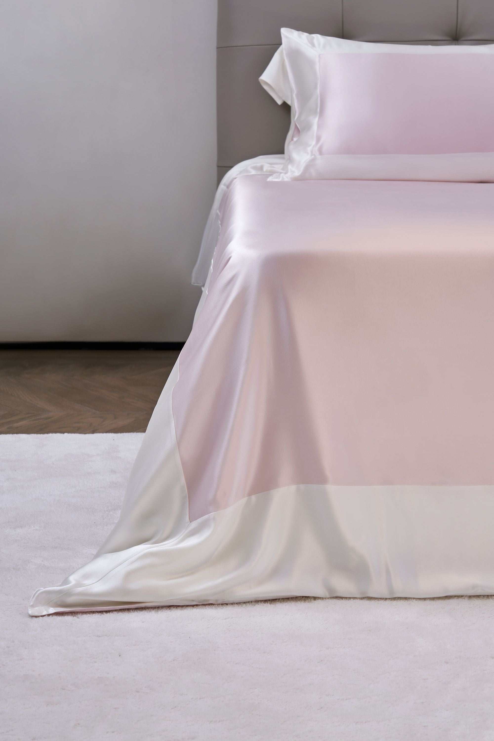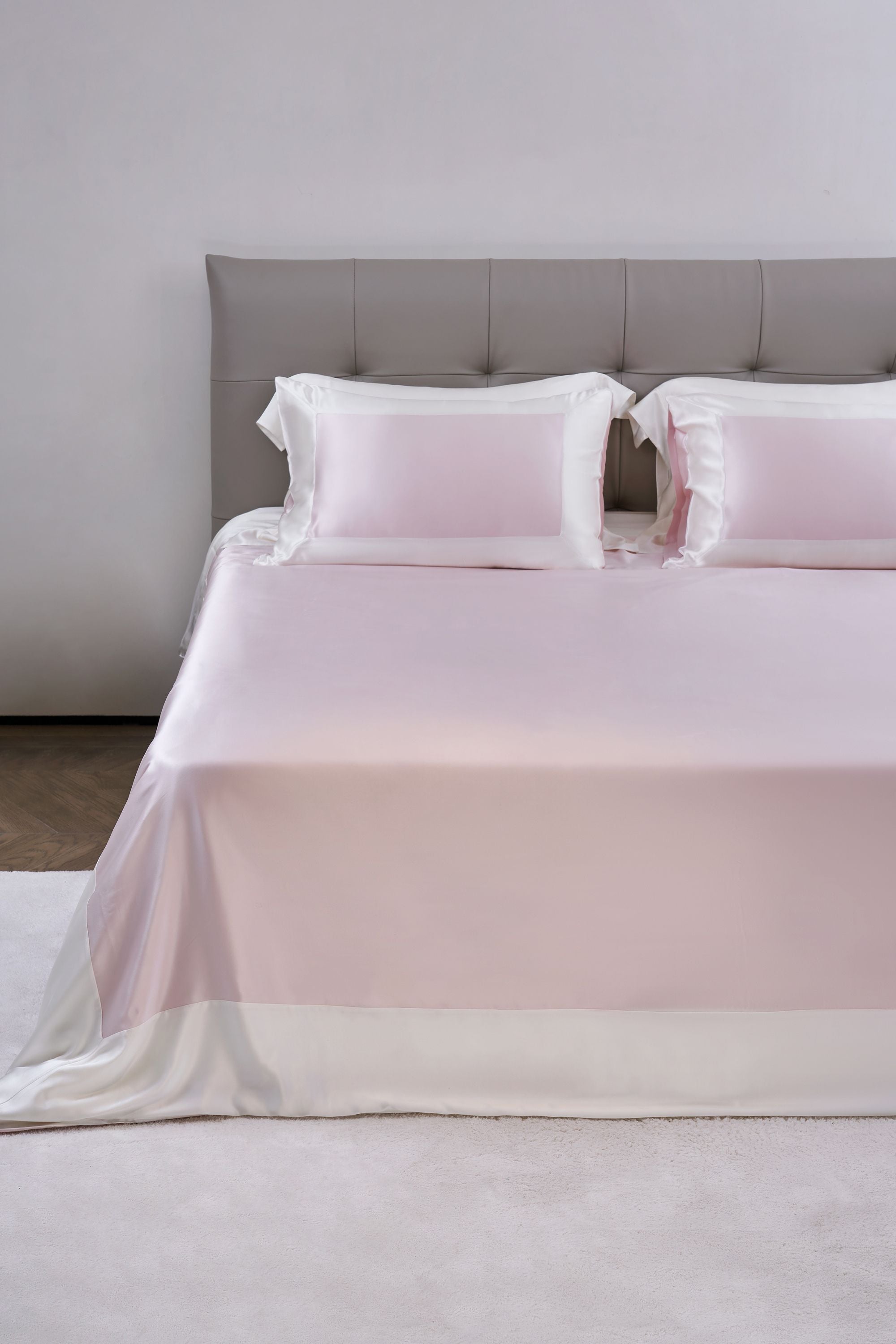 Elevate your nights sleep with the 100% silk blossom pink bedding set. A classic and simple design featuring two pillow cases, a duvet cover and an under sheet.