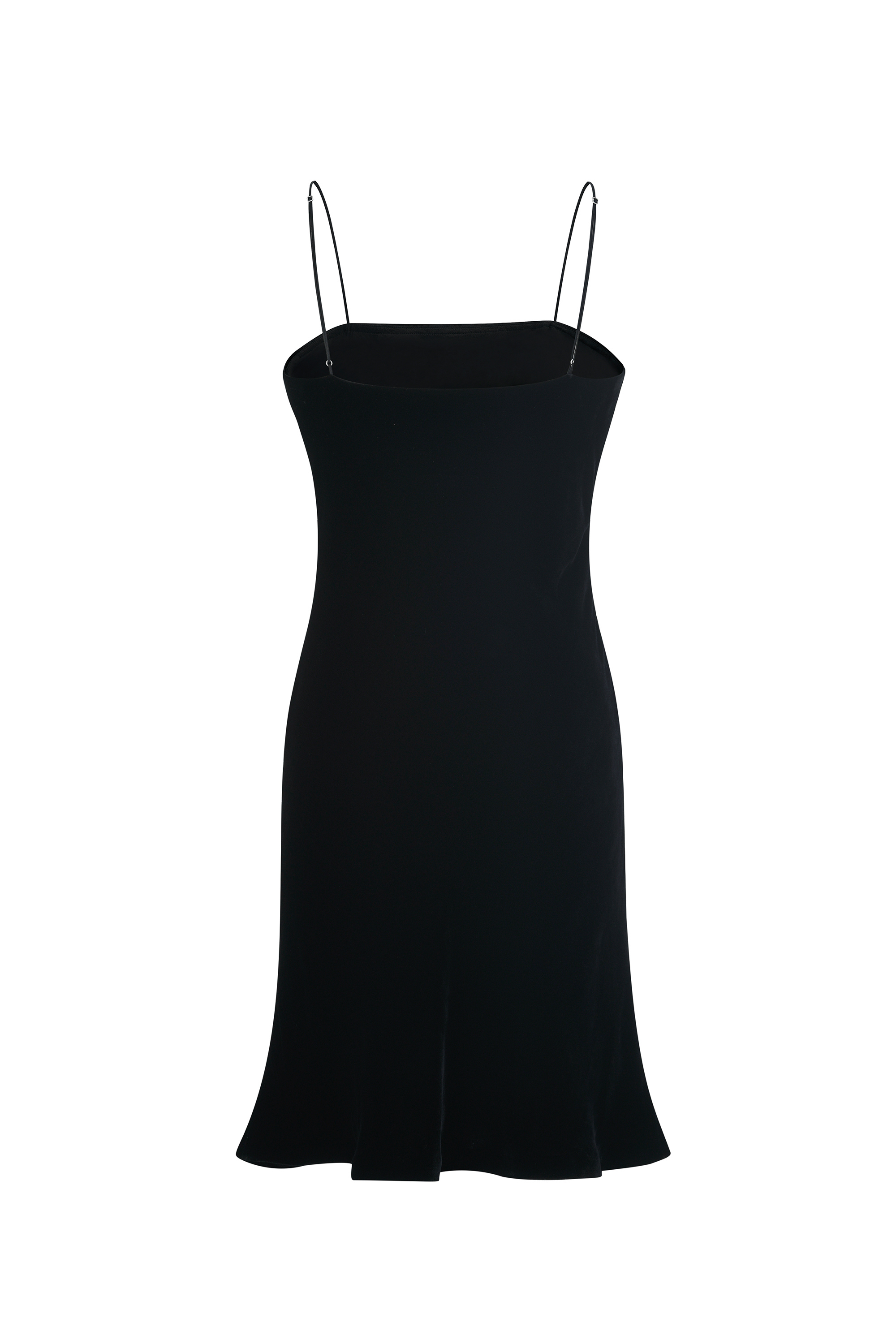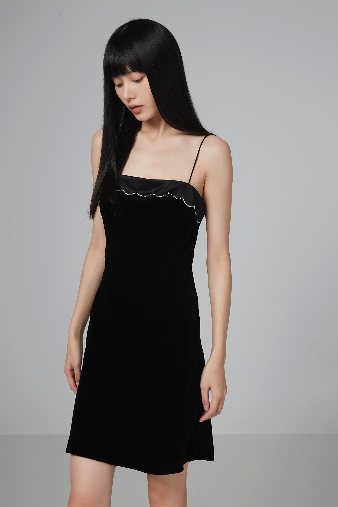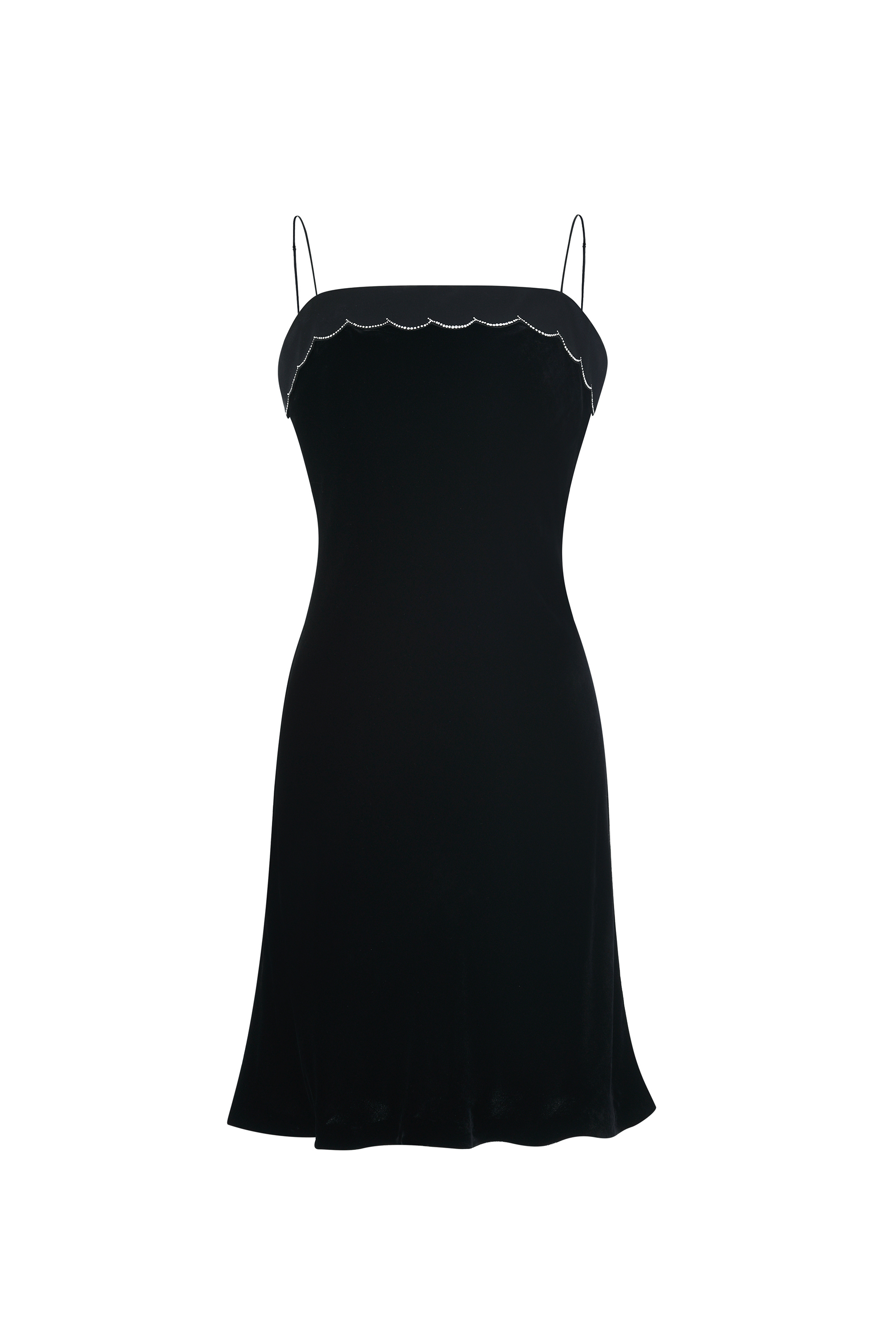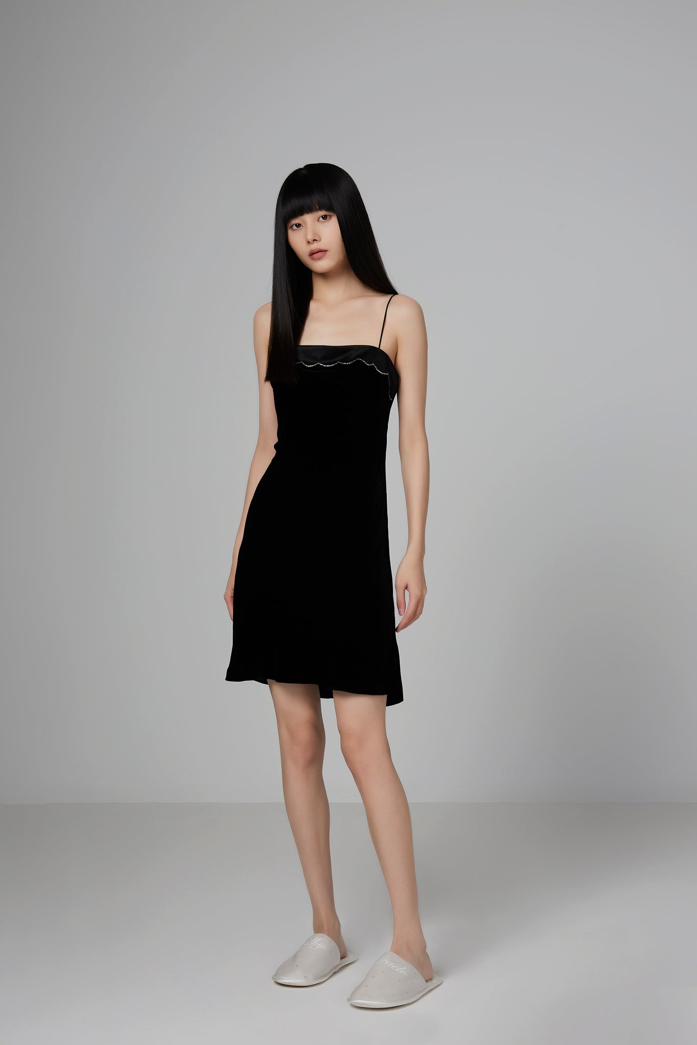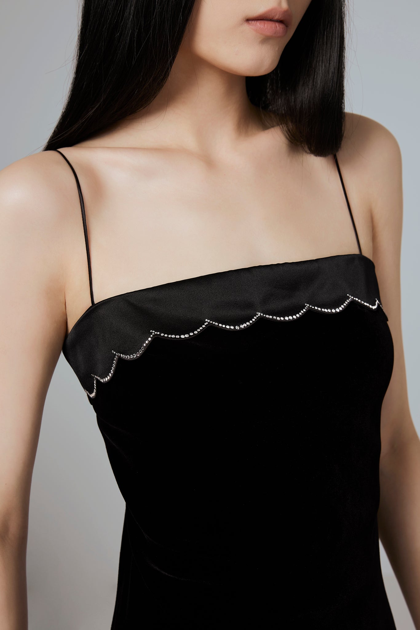 The Black Velvet Slip Mini Dress features an elegant slip cut from soft black velvet, complimented with black bandeau lining and emblazoned with Swarovski crystal embellishments.