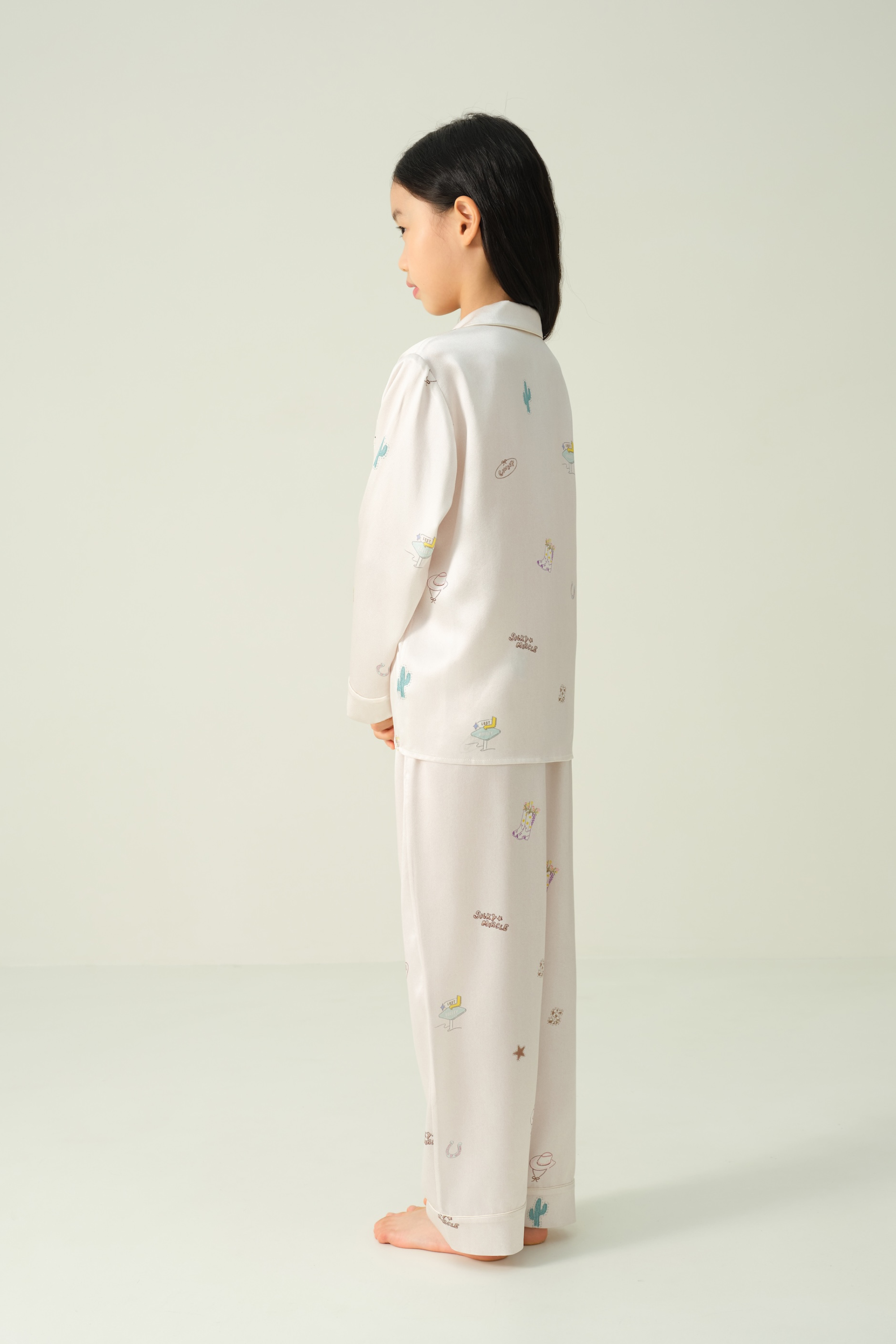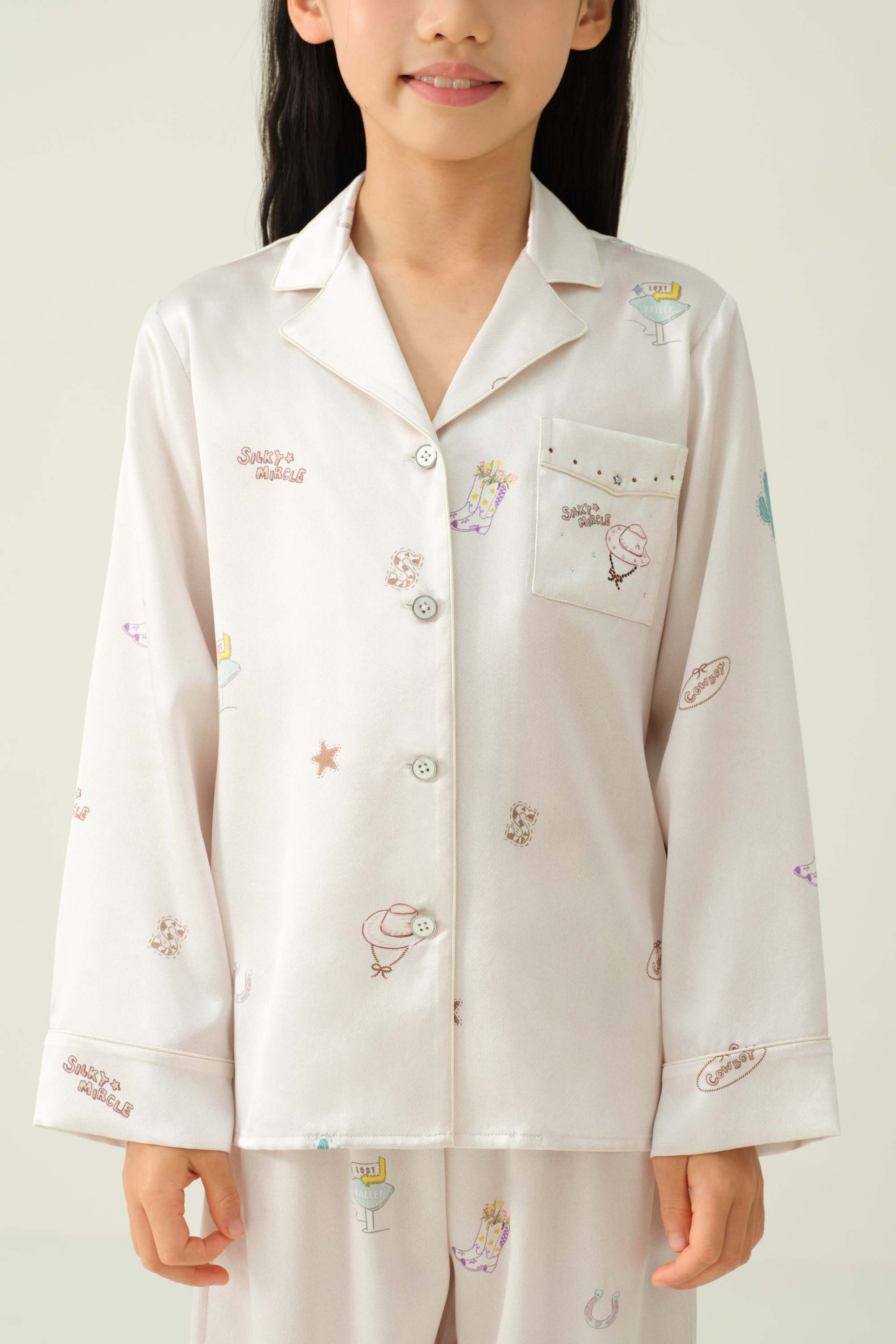 The beige denim base has a classic vintage look, with cactus, cowboy hats, western boots and road signs from adventures interspersed throughout the print, and the pockets are adorned with rhinestones.