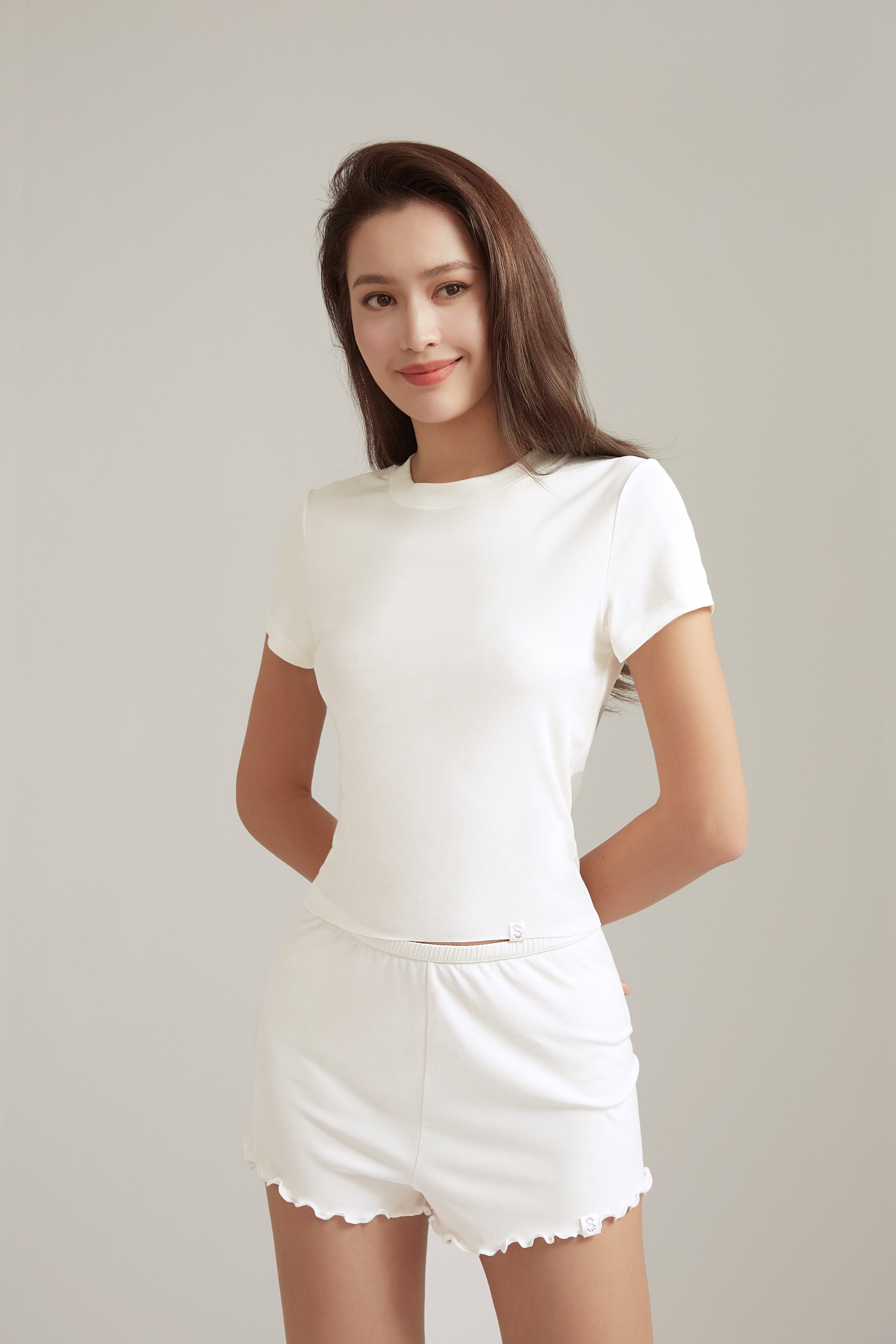 The White Scalloped Edge Shorts from our silk blend collection is crafted from a blend of mulberry silk, modal and spandex. Finished with Swarovski Crystals.