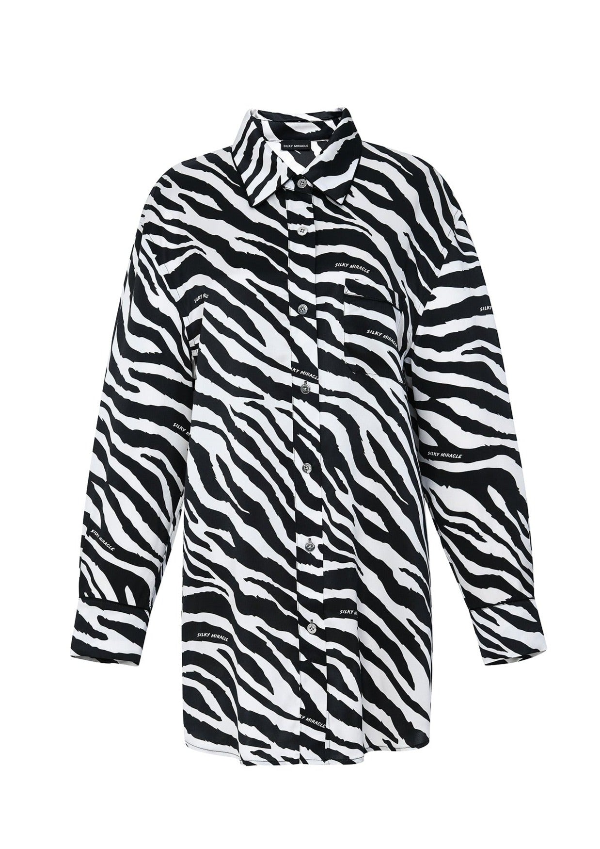 Elevate your everyday with the Zebra Print Shirt Dress. Effortlessly cut from zebra print silk and a straight silhouette finish.