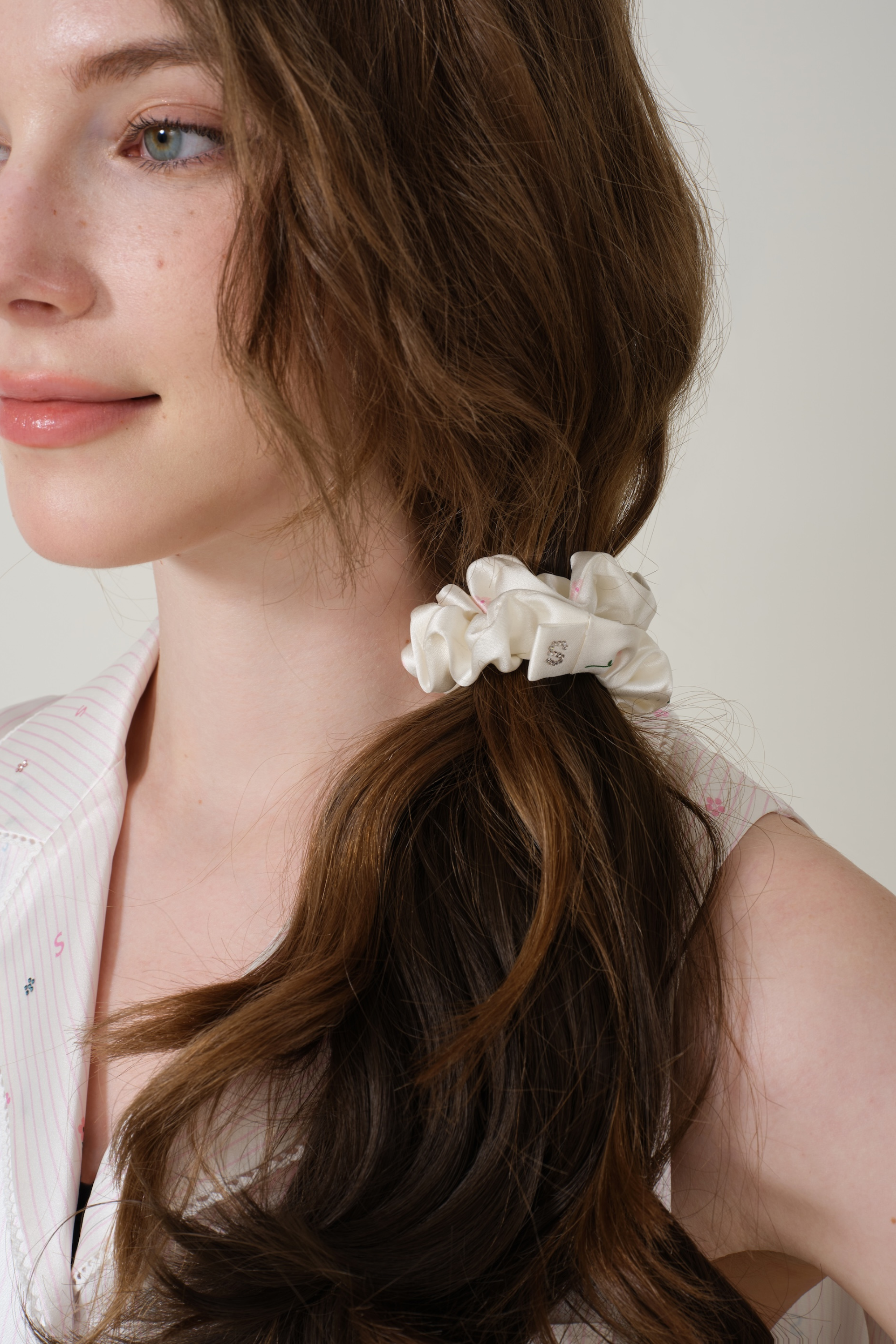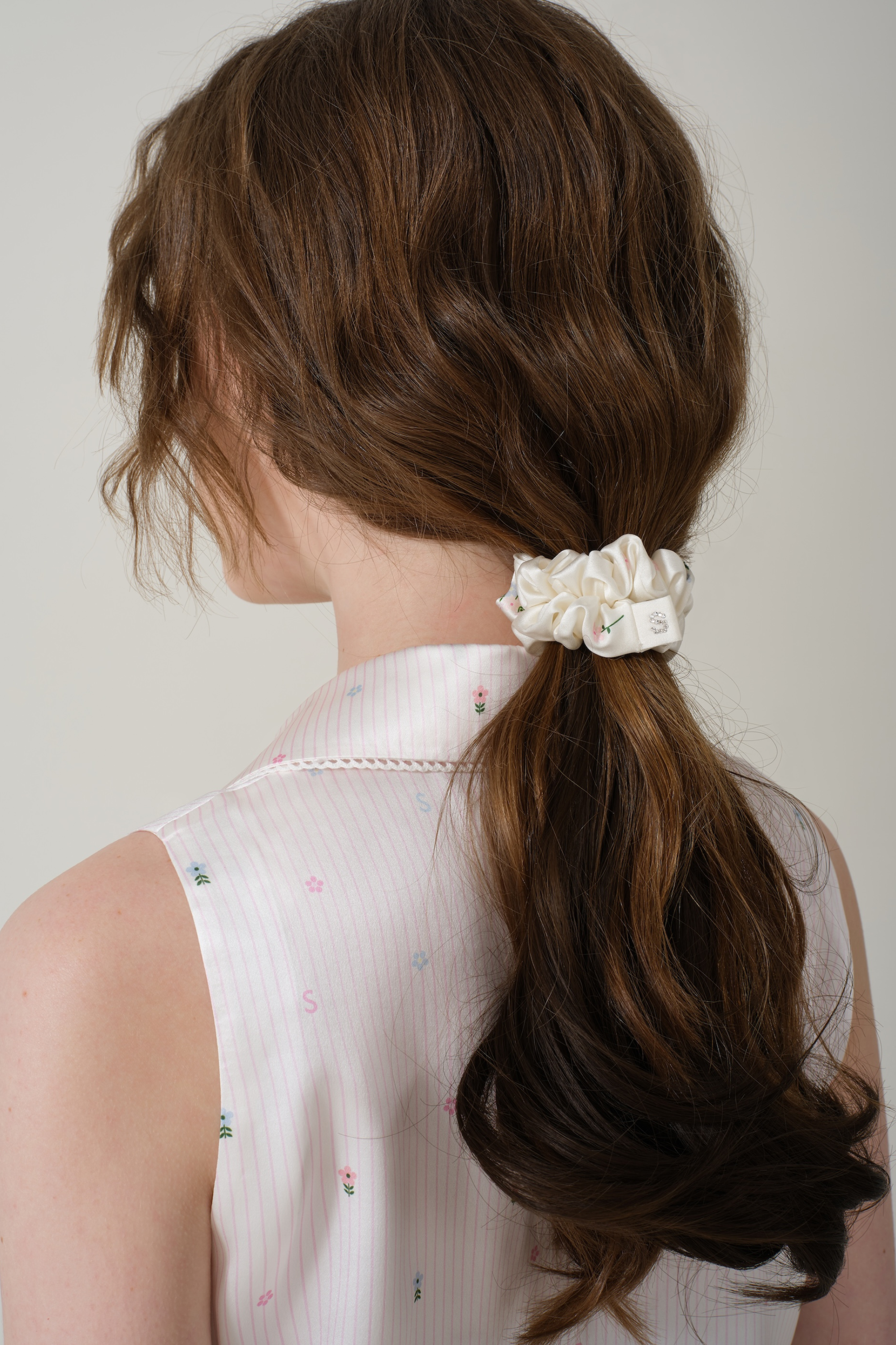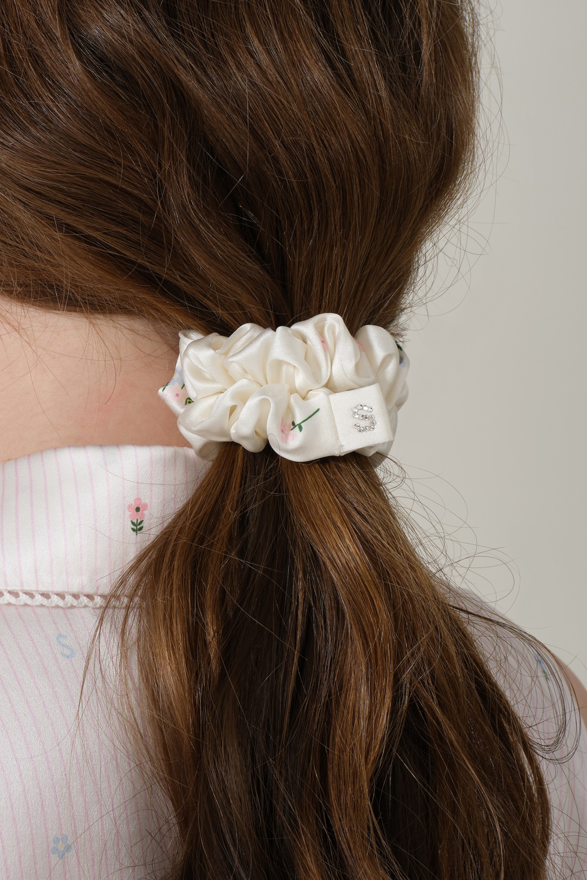 Elevate your wardrobe with this fresh Southern French floral-patterned scrunchie. Set against a vibrant goose-cream background, the delicate bouquet design brings a touch of effortless charm.