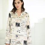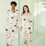 Experience luxury lounging with this silk loungewear set, created in collaboration with American artist JEAN-MICHEL BASQUIAT. The artwork, titled "Untitled AA," boasts a playful cartoon aesthetic against a soothing light brown backdrop, offering a sense of warmth and comfort. Its loose silhouette ensures a relaxed fit for both men and women. Perfect for unwinding in style at home.