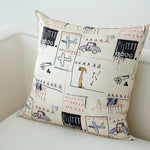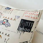 Collaboration with artist Jean-Michel-Basquiat. The print is from Jean-Michel-Basquiat's painting ‘Untitled AA’. The pillow measures 50*50cm and is fully printed with the entire cycle of Untitled AA. It is surrounded by a 0.5cm beige grey silk fly, backed by a patchwork of beige grey silk with a custom woven label from the Jean-Michel-Basquiat and Silky Miracle collaboration.