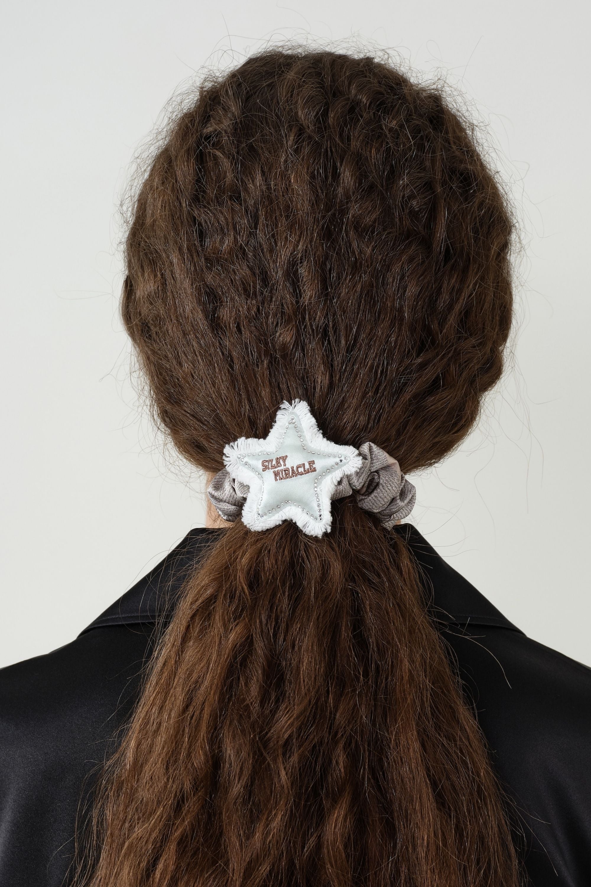 The Western Cactus Scrunchie features 3D cotton-stuffed cactus details with turquoise rhinestones along hand-painted brushstrokes for a bold, textured look. A star-shaped design with embroidered branding and playful scrapbook-style whiskers adds a charming Western touch.