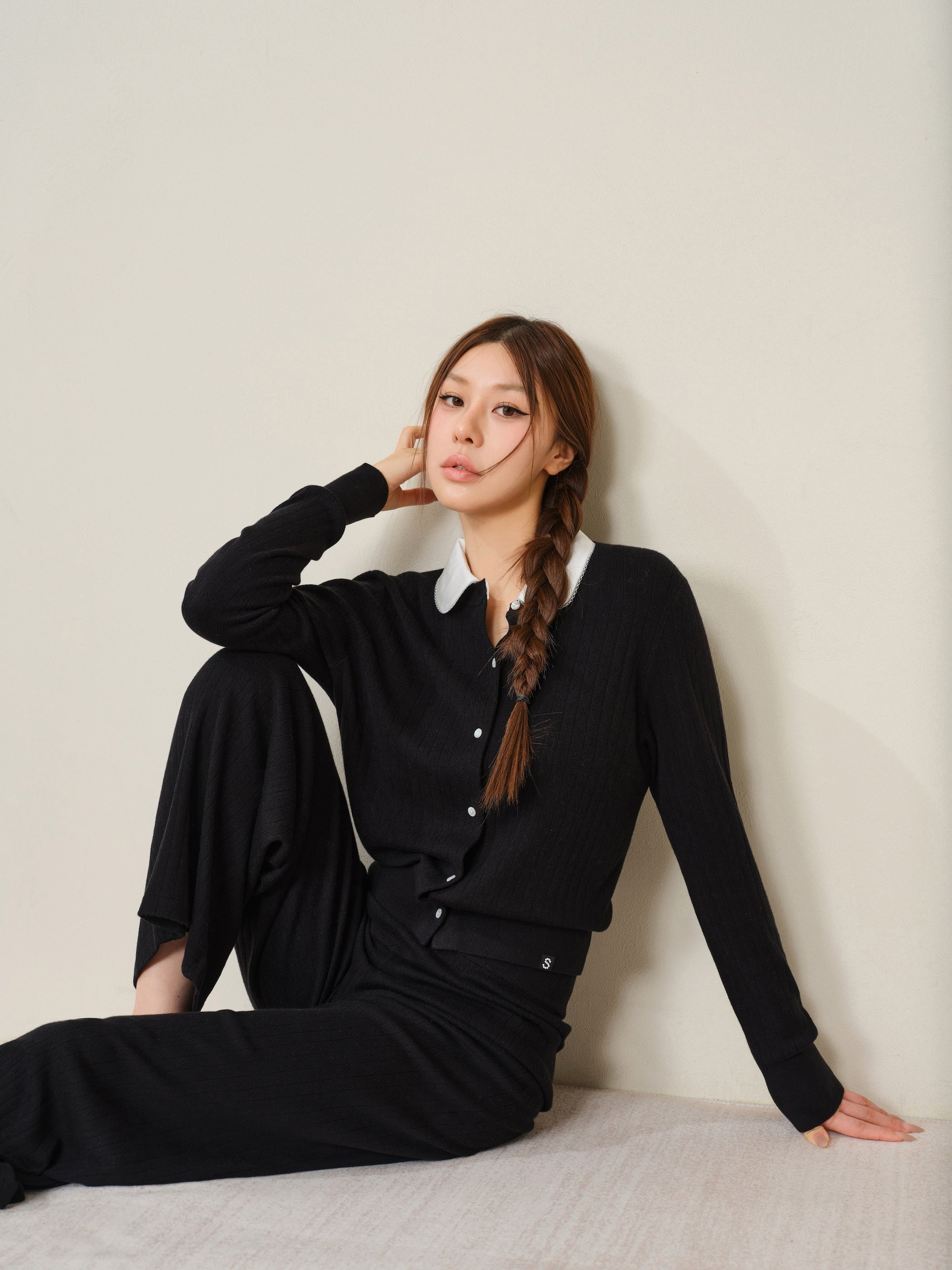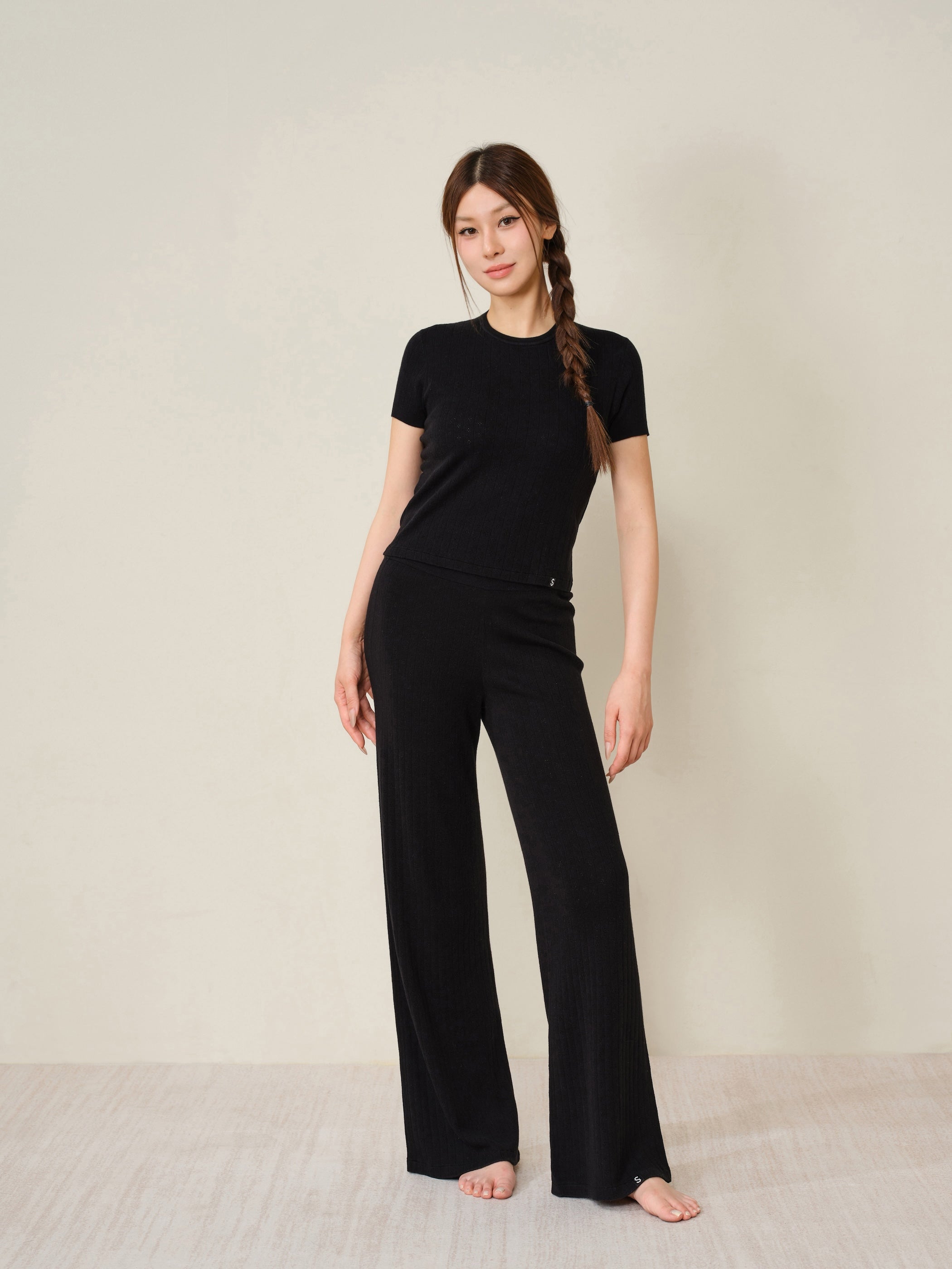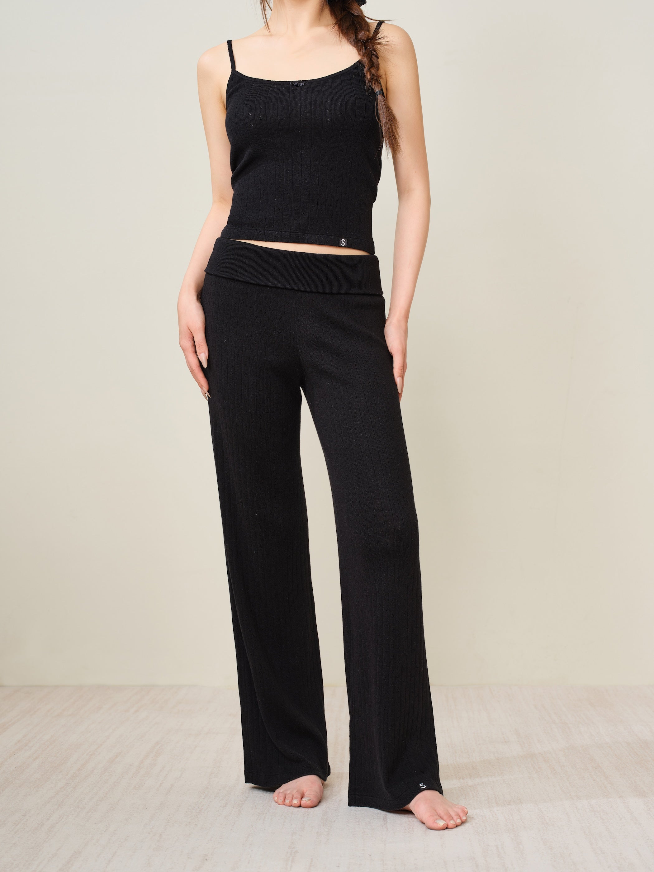 Designed with a high-rise waistband that can be worn folded down or styled at the natural waist for versatile looks. Finished with a pearl-finish S-label at the hem, adding a subtle, feminine touch.