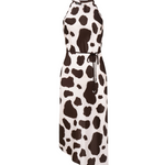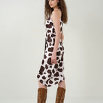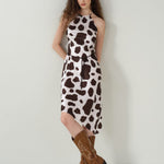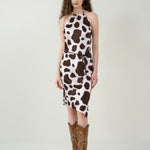 Inspired by the cowboy style, this dress features vibrant colors, embroidery, and casual details like tassels and turquoise. With pleated scooped shoulders, a sloping hemline, and a diamond-encrusted waistband.