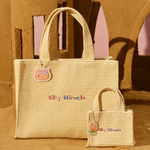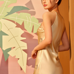 Silky Miracle x Hello Kitty Hawaii Vacation Series Silk Ensemble features Hawaiian-style flower embellishments with white crystal accents on the neckline. Comes with a Hello Kitty tote bag.