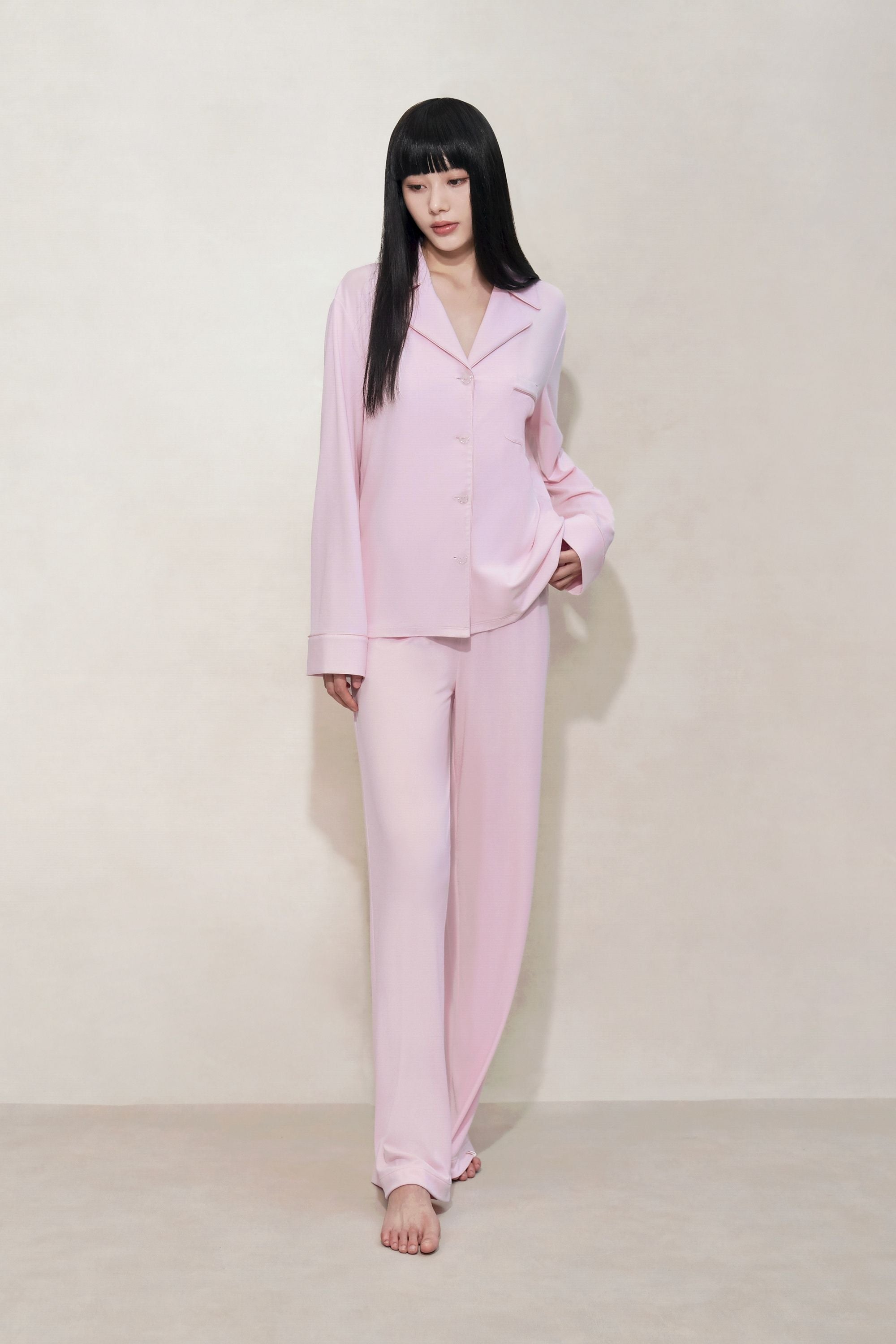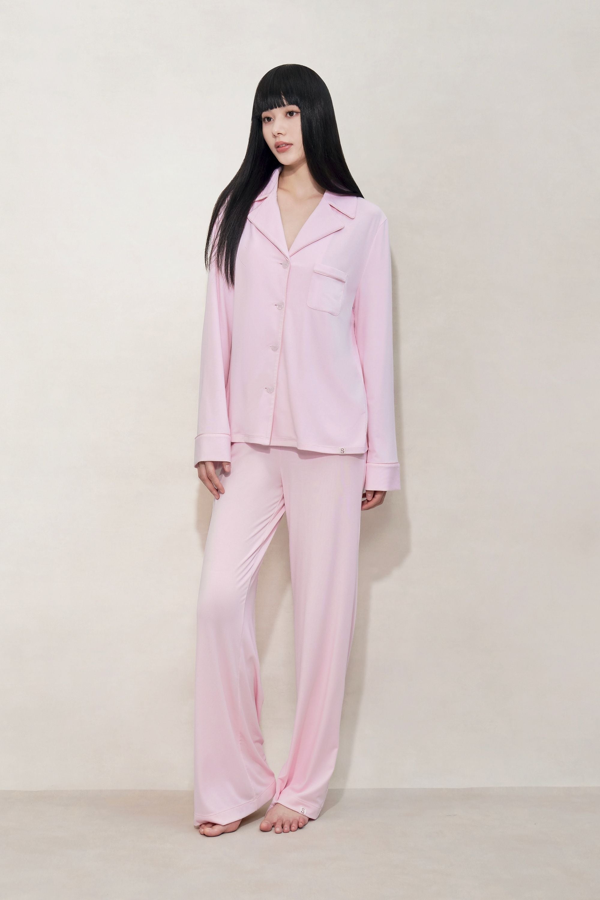 Indulge in the luxurious comfort of our Mulberry silk modal knit fabric, prized for its exceptional softness and delicate elasticity. Paired with loose-fitting straight-leg trousers that gracefully complement your physique, this ensemble beautifully trims the body. The addition of transparent resin buttons adorned with sparkling diamonds imparts a charmingly feminine touch that shimmers with girlish allure.