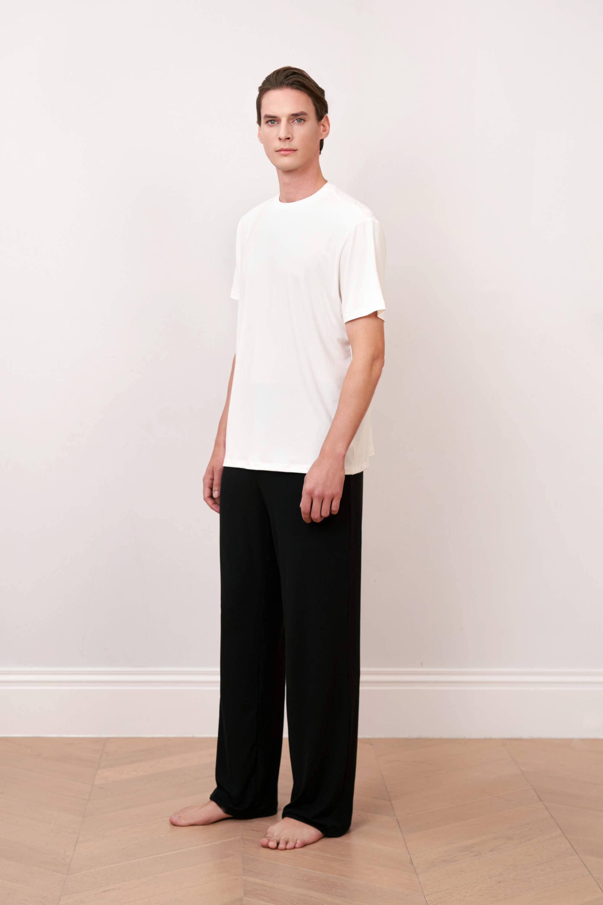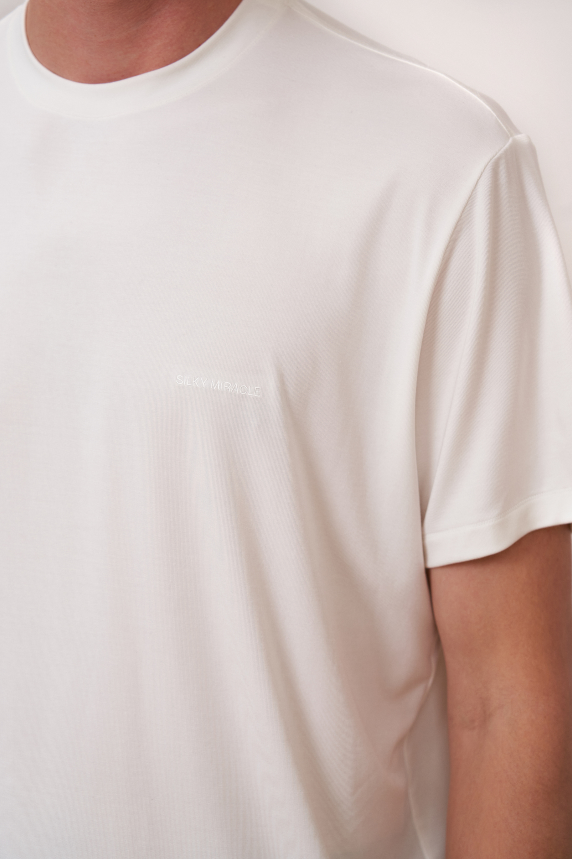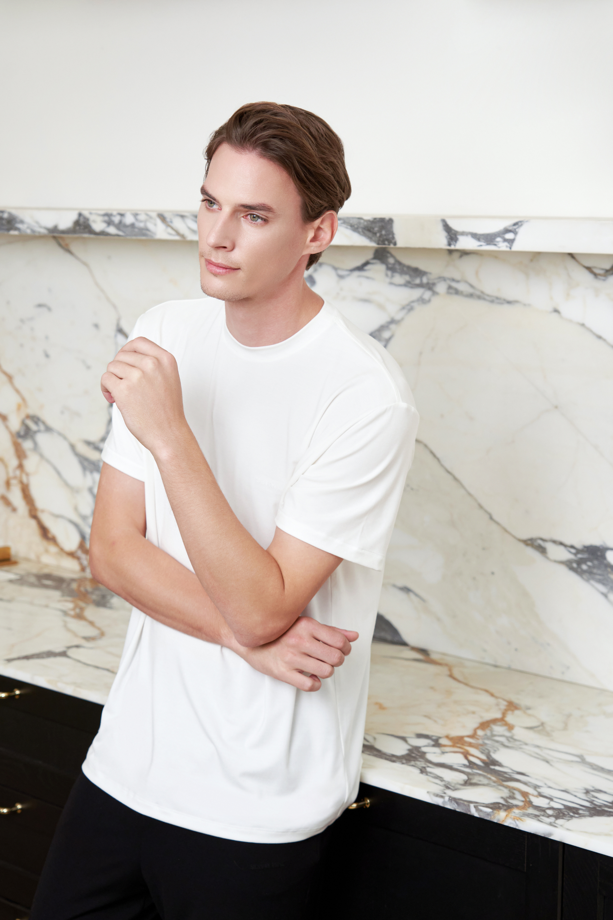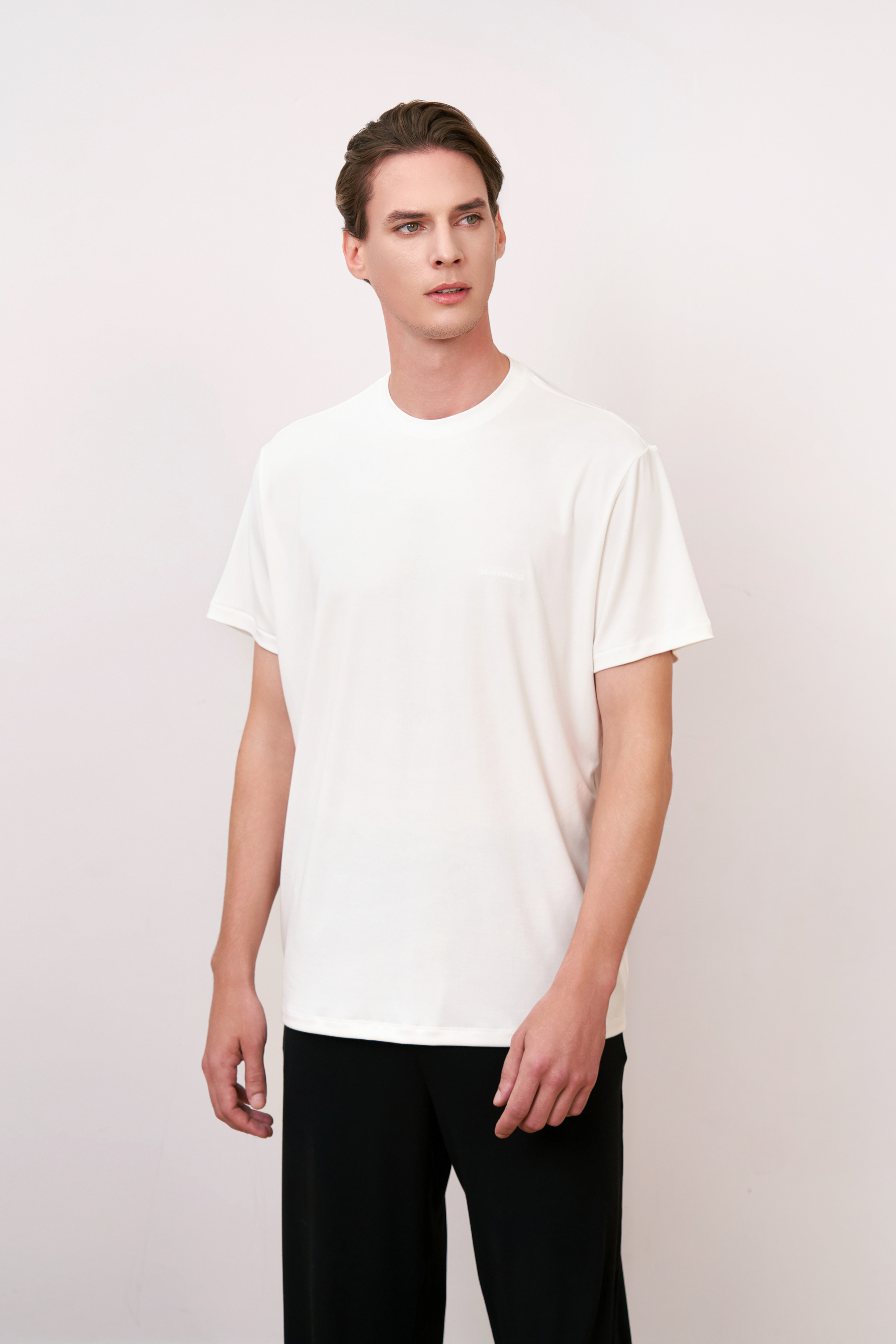 Tailored from a blend of mulberry silk and modal silk knit fabrics, the Round Neck Basic Short Sleeve top is a custom-designed attire that offers a soft, comfortable, and stretchy feel. These T-shirts, available in both short-sleeved and long-sleeved styles, can be paired seamlessly with pants from the corresponding collection.